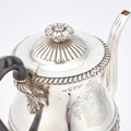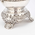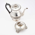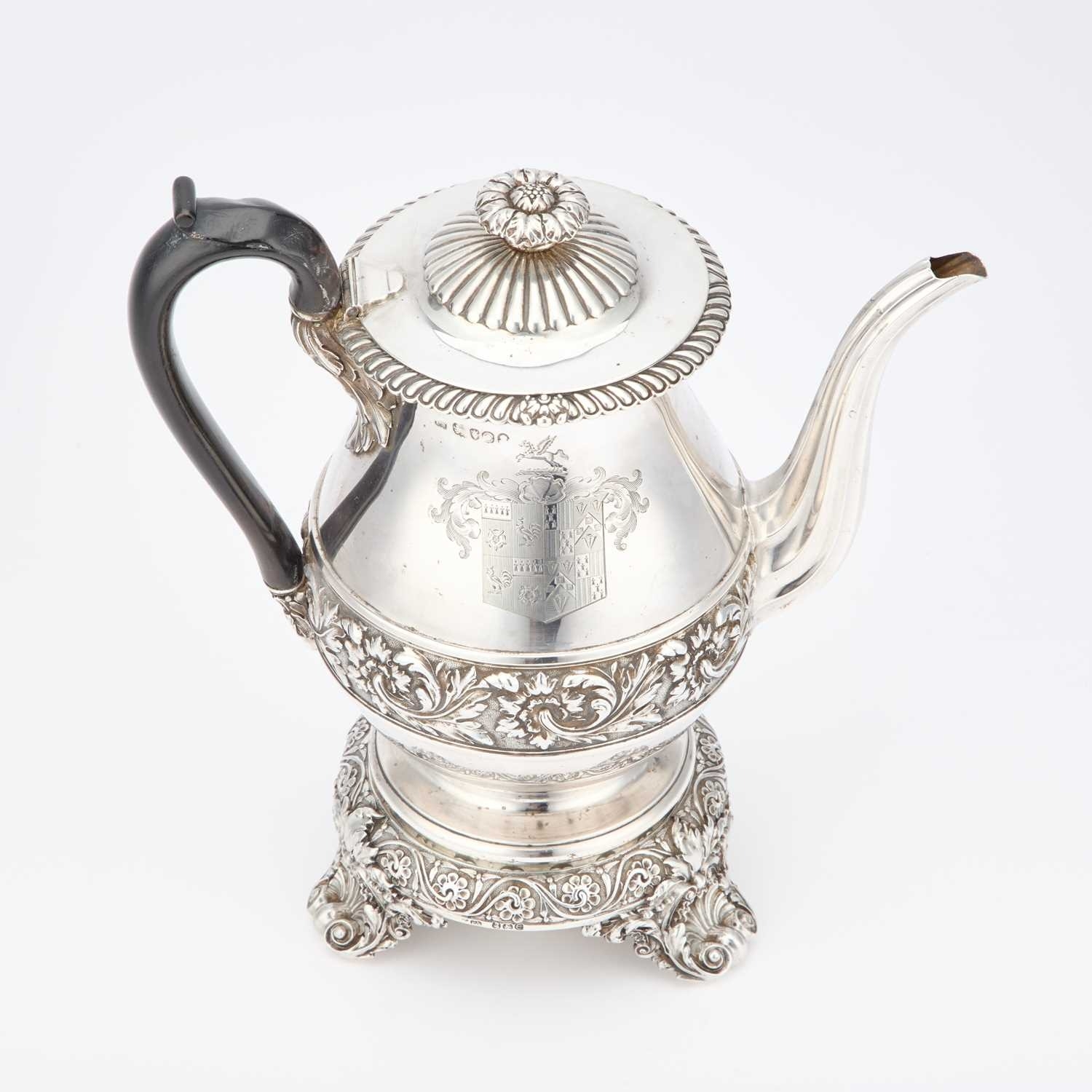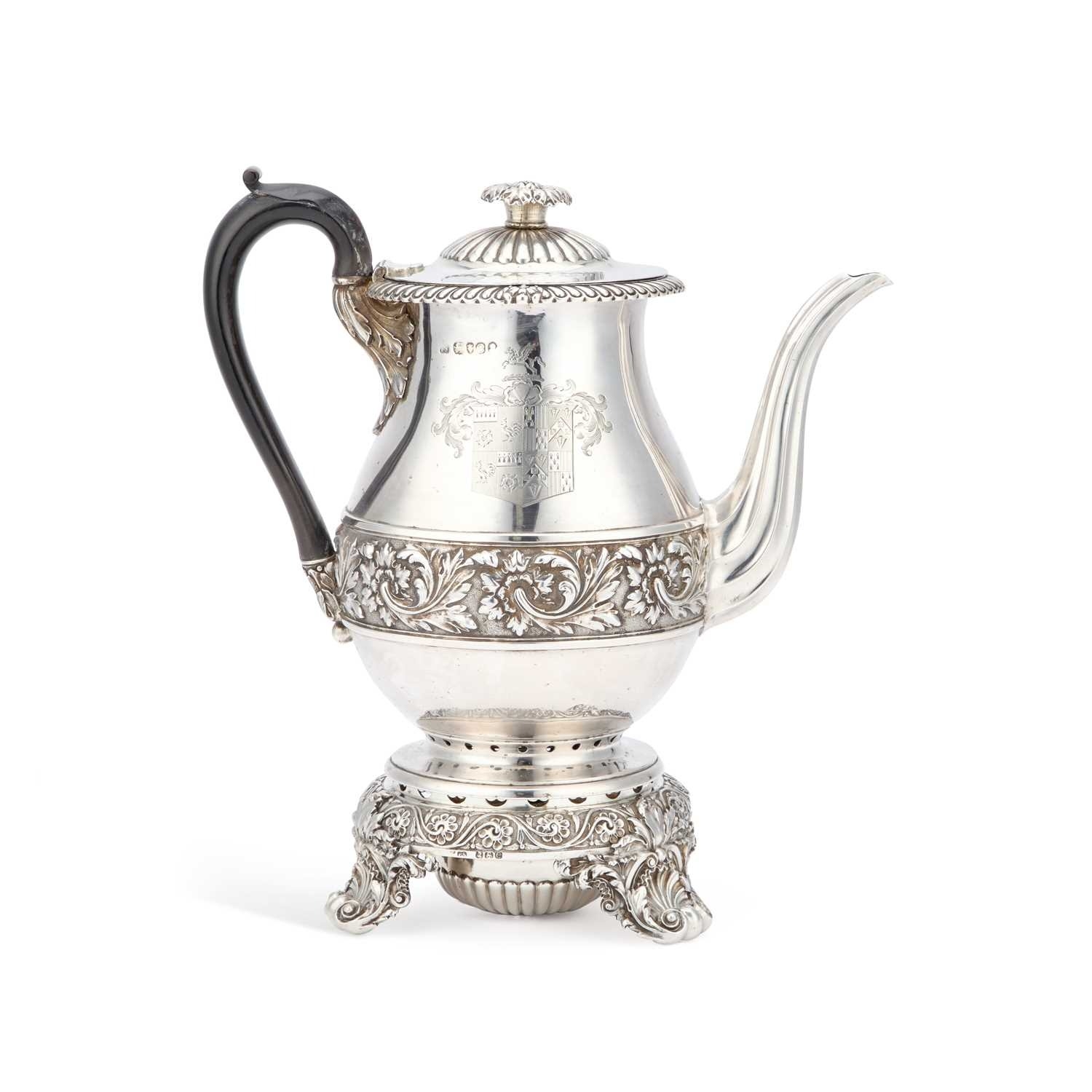 by Paul Storr, London 1820, the baluster form pot on a circular stand with burner, chased with a frieze of scrolling acanthus, the stand with three scroll-form feet, engraved with an armorial. 25cm high, 41.6 troy ounces gross