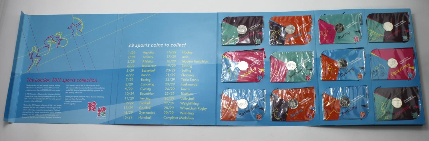 GB 50p's (29) a complete set of London 2012 Olympics, currency issues in the Royal mint folder with medallion