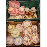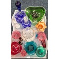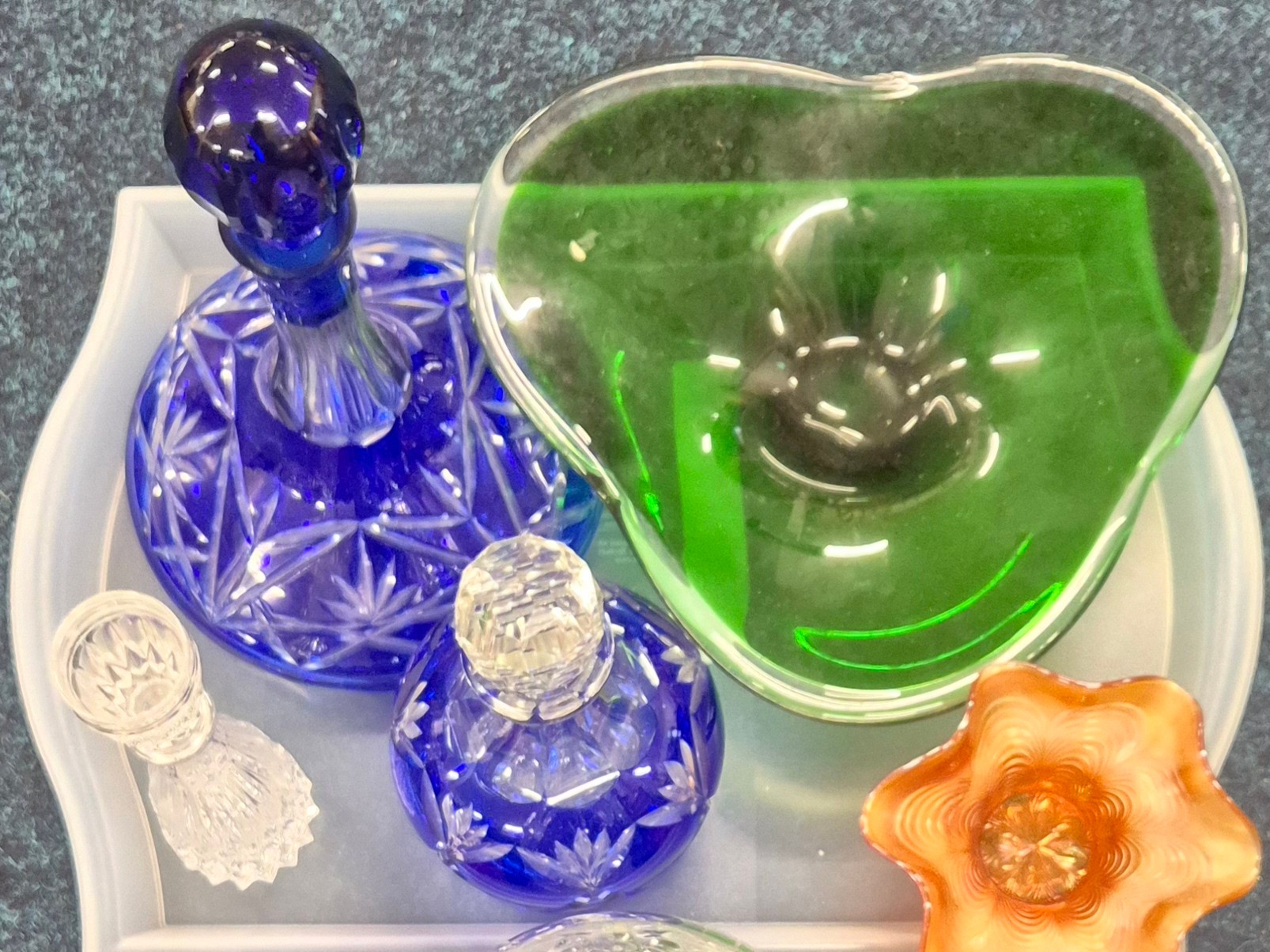Two Trays of Art Glass wares; Etched Blue Decanters, Cranberry Glass wares & other items.