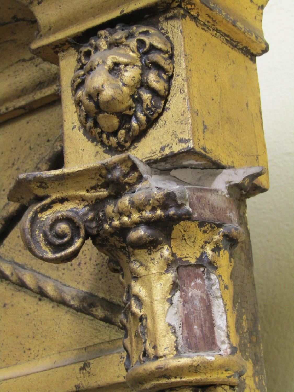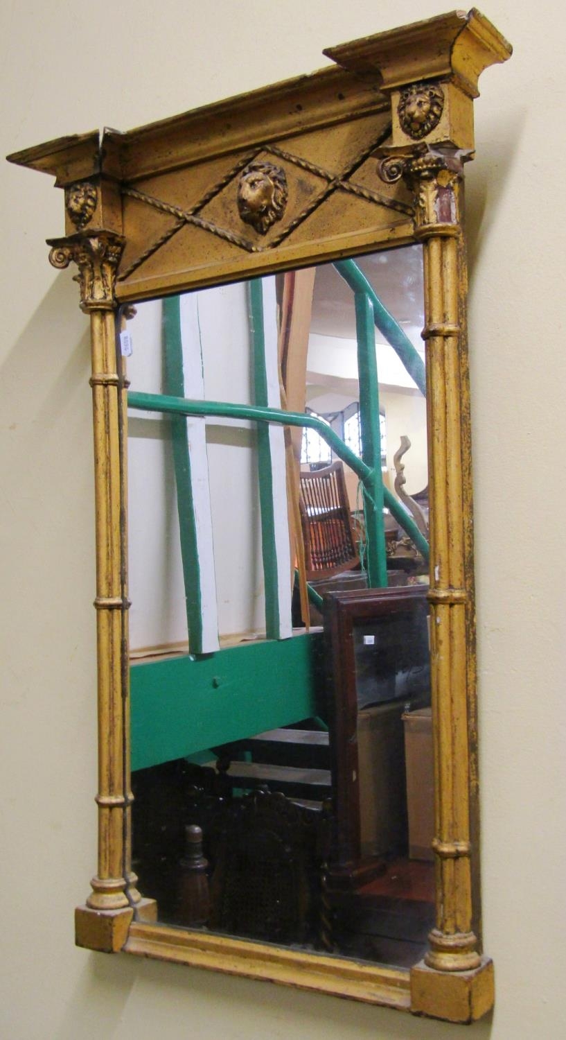 A Regency period pier glass, the mirror set within column supports beneath ionic capitals and further frieze detailing three lions, 78cm long x 42cm wide