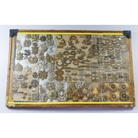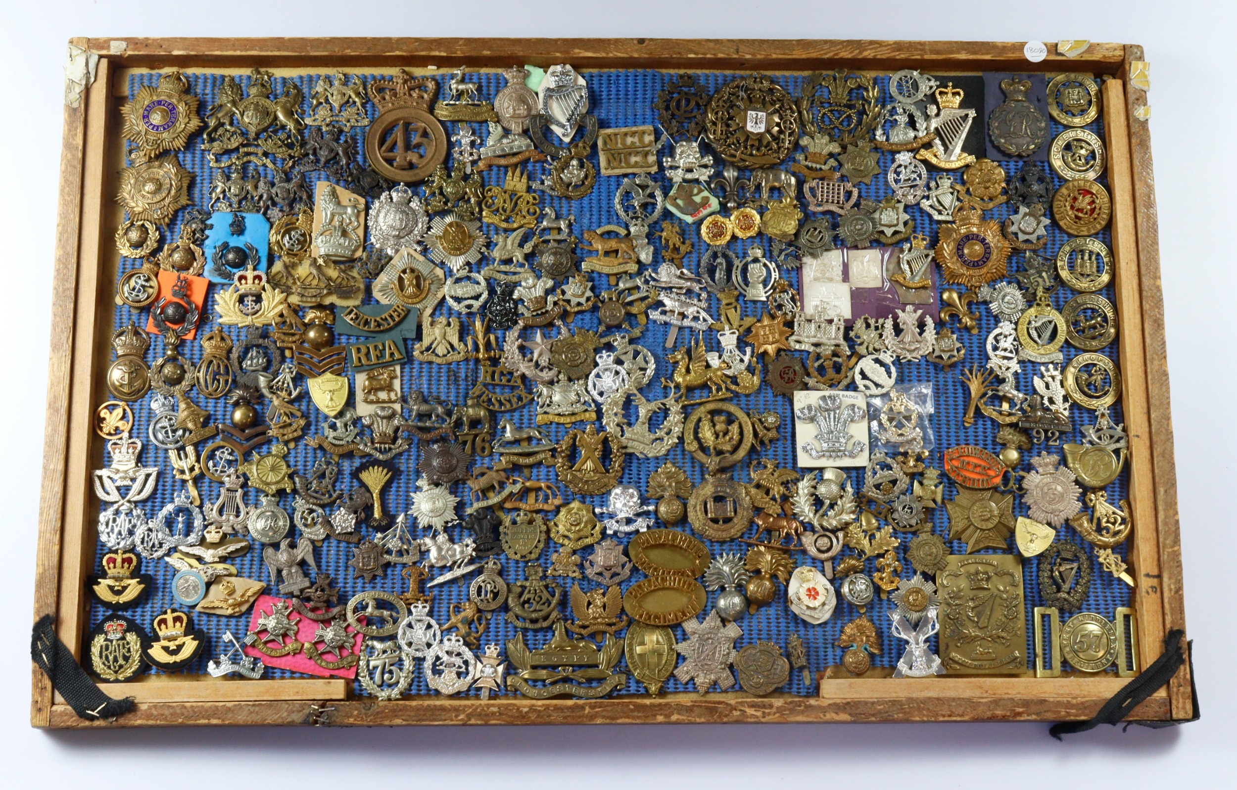 Cap badges, few helmet plate centres, helmet plates, etc housed in a display case (case poor condition) Buyer collects