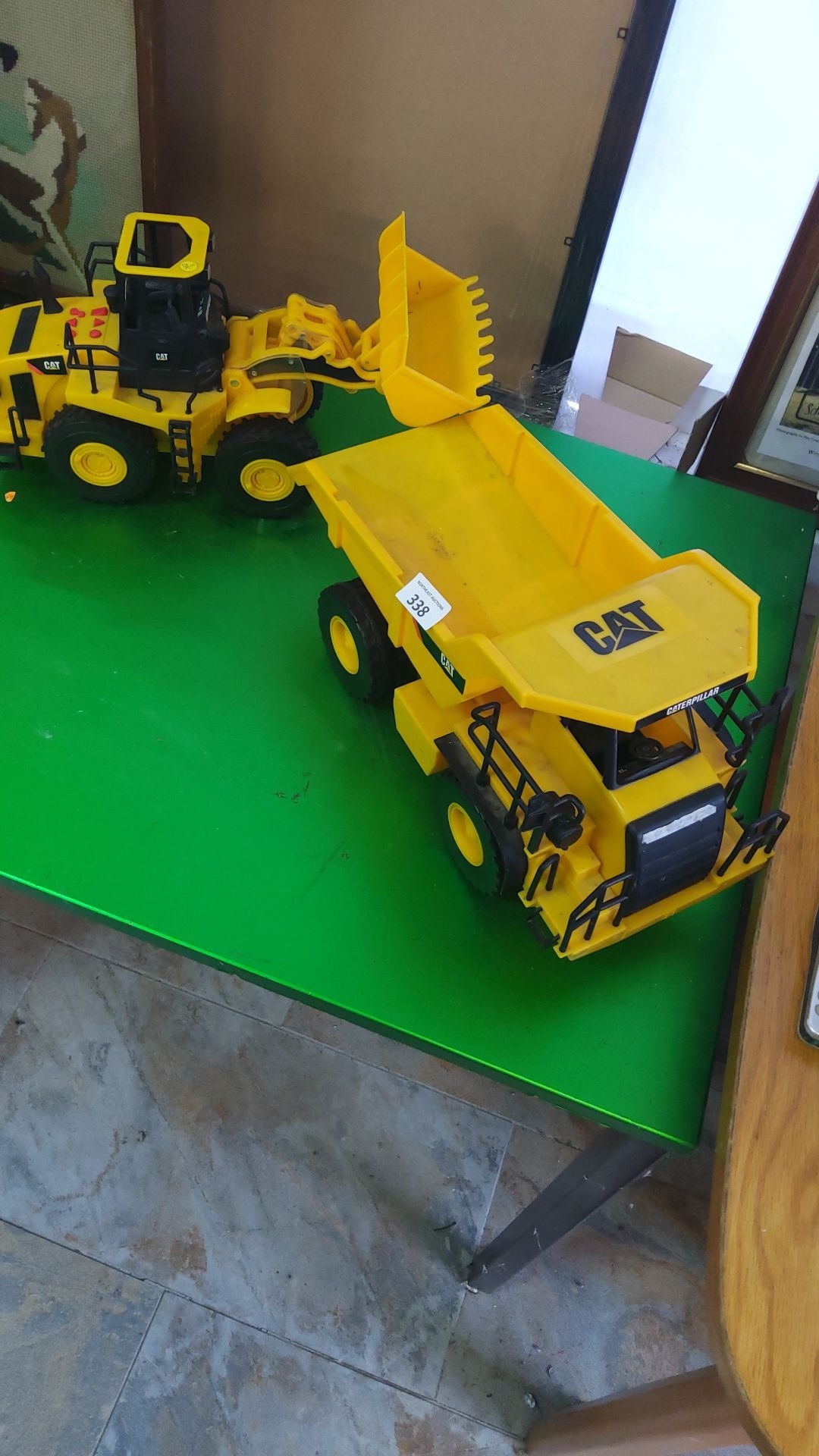 Two CAT construction toy vehicles, including a dump truck and front loader, in bright yellow plastic with black accents.