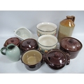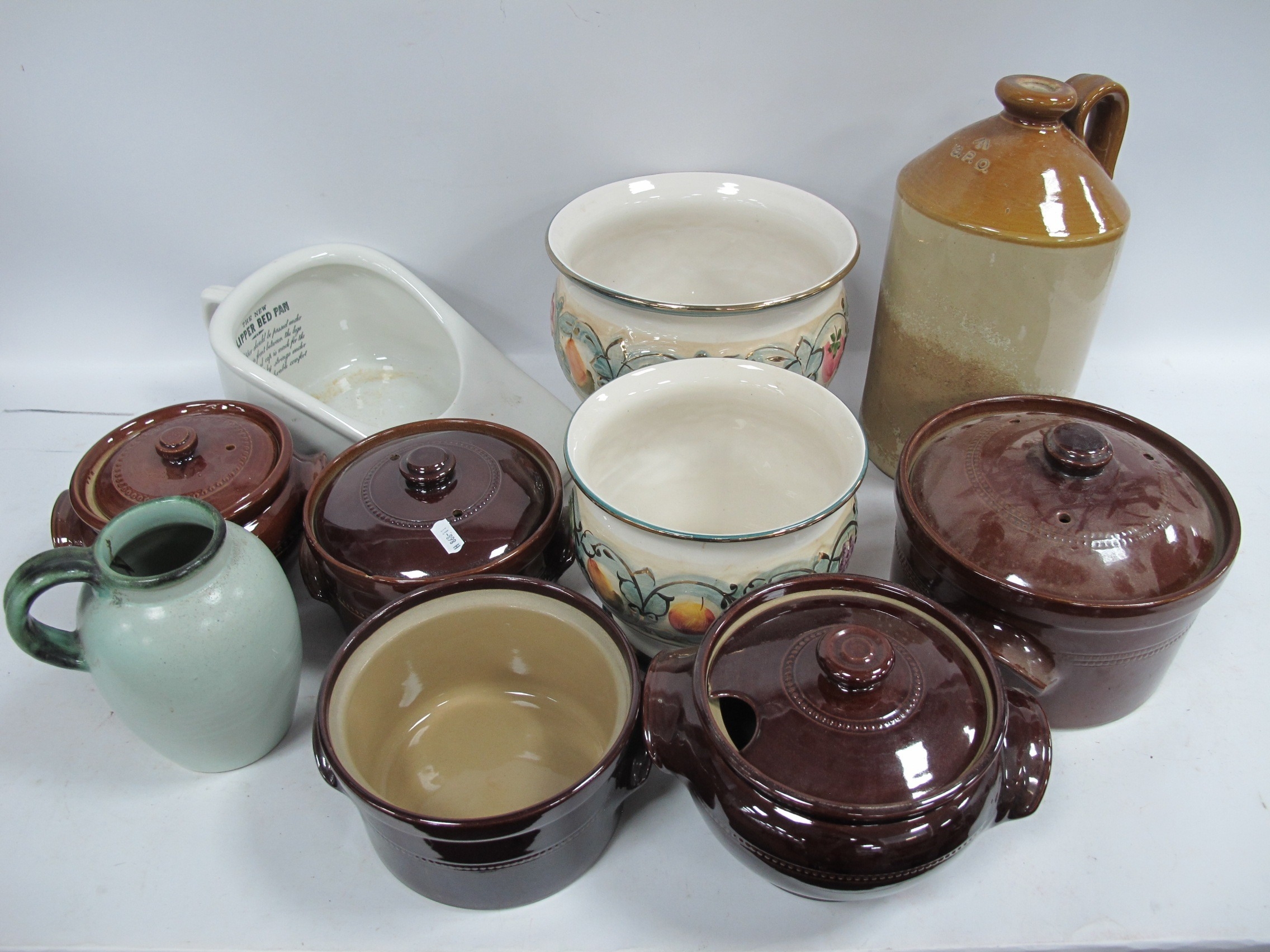 Ceramics, including two large Portuguese floral planters, five Pearson of Chesterfield brown pottery lidded pots in various sizes, a large Pearson GPO earthenware flagon (H32cm), Evan’s slipper bed pan and Bourne Denby pottery jug:- One Box.