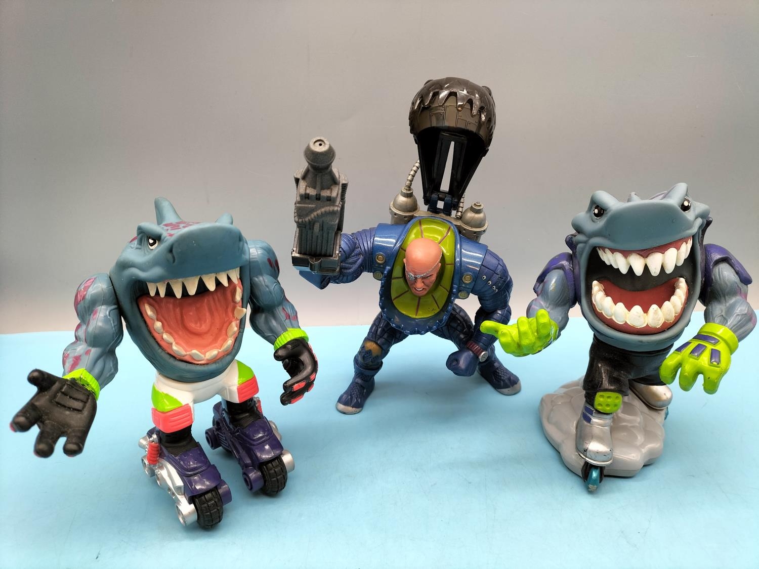 3 x Vintage 1990's Street Sharks Moto Streex Blades 15cm Action Figures to include Dr Piranoid'