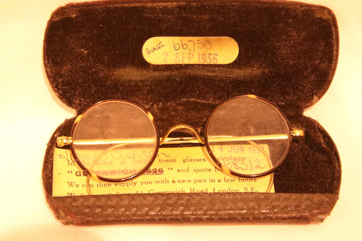 Pair of 1936 tortoiseshell and yellow metal spectacles in metal case. P&P Group 1 (£14+VAT for the first lot and £1+VAT for subsequent lots)