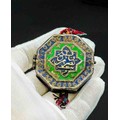 The lid bears an Islamic inscription, likely a Quranic verse or blessing, emphasizing the box’s spiritual purpose. Such boxes were used to safeguard small Qurans or precious amulets, combining devotional significance with exquisite ornamental design.