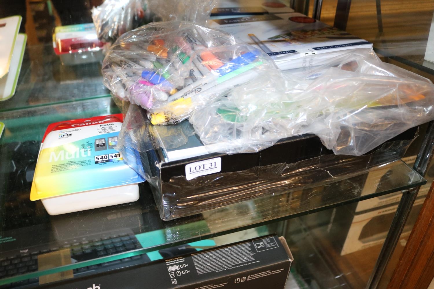 STATIONARY LOT INCL COLOURED SHARPIES, ARTIST PENCILS, CANNON PRINTER CARTRIDGES AND PUKKA PADS