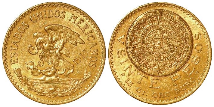 Mexico gold 20 Pesos 1918 EF (0.4822 troy oz AGW)