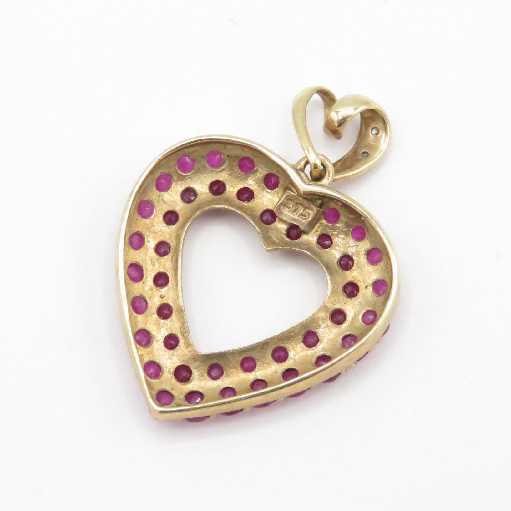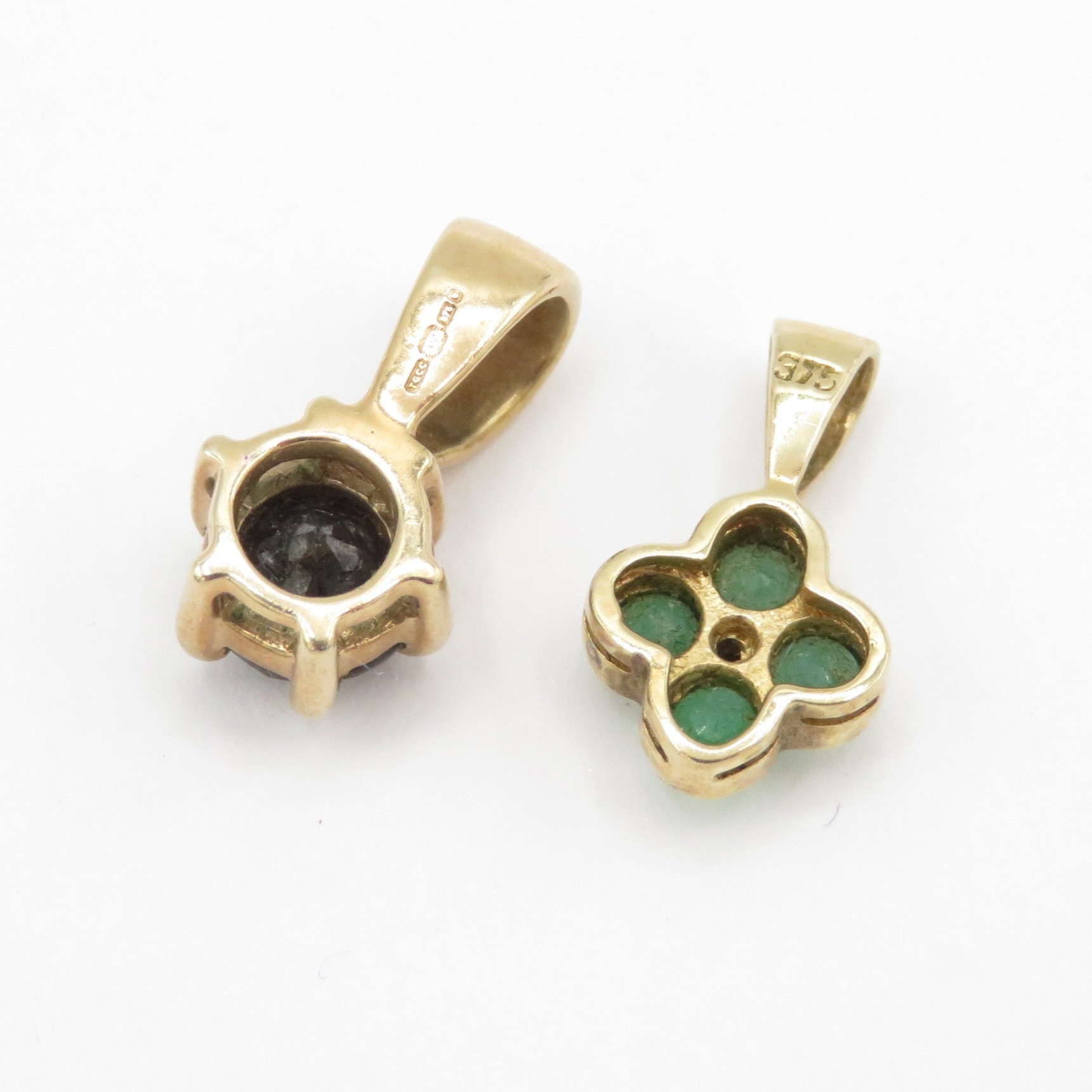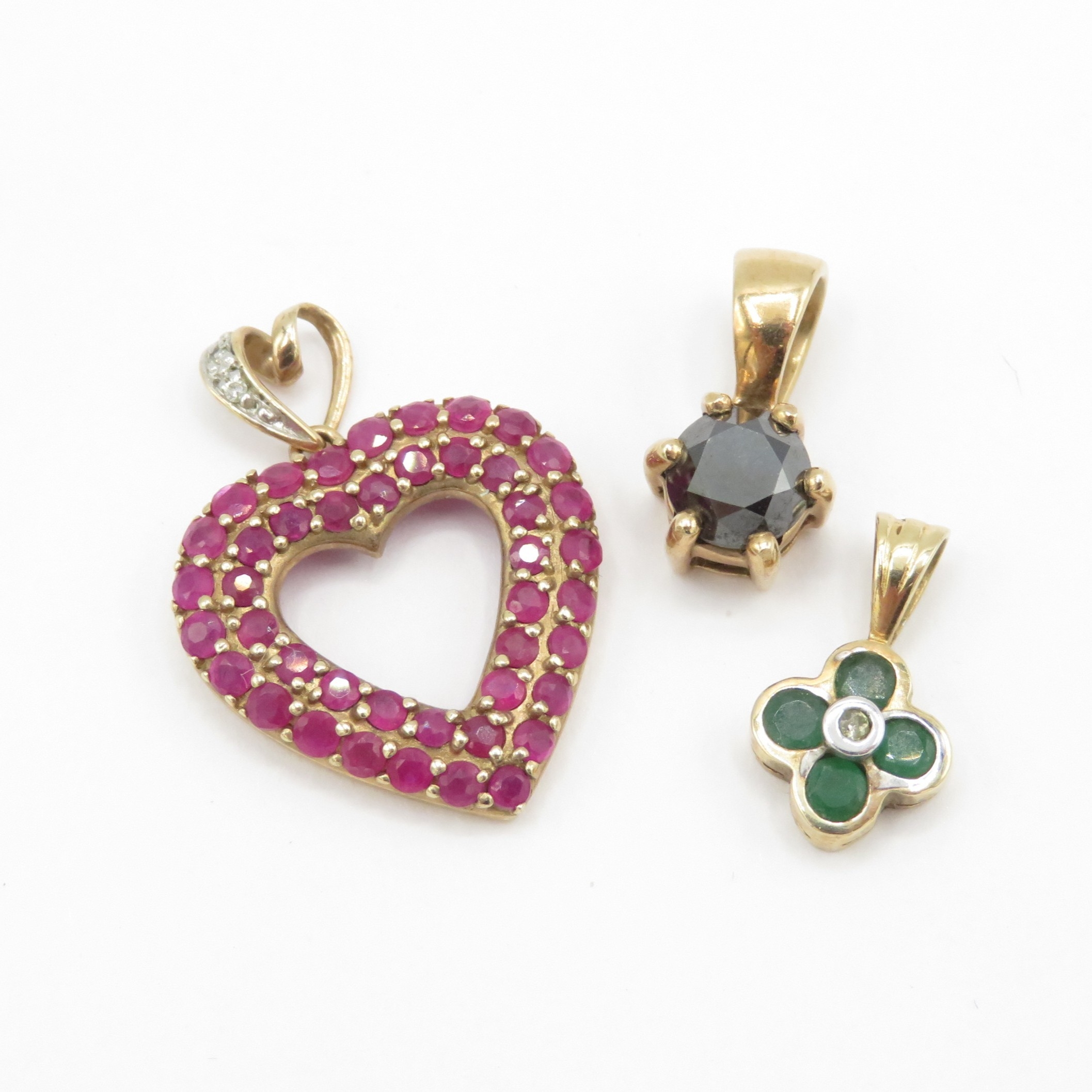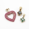 3x 9ct gold pendants including emerald and heart ruby (3.6g)