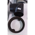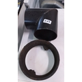 A group of black metal pipe fittings comprising a T-junction and a circular collar, of heavy gauge construction, the junction with welded seams and a plain cylindrical bore.