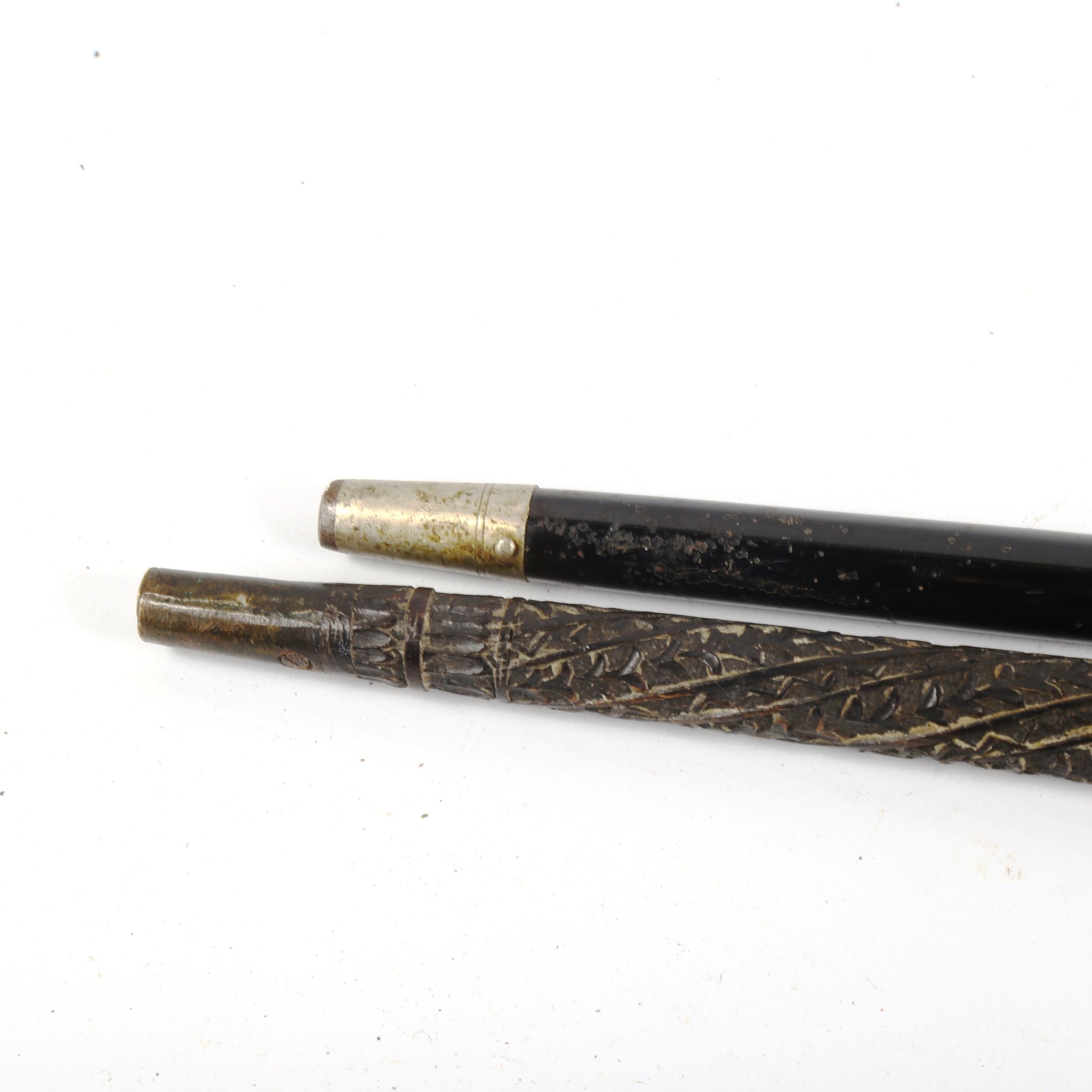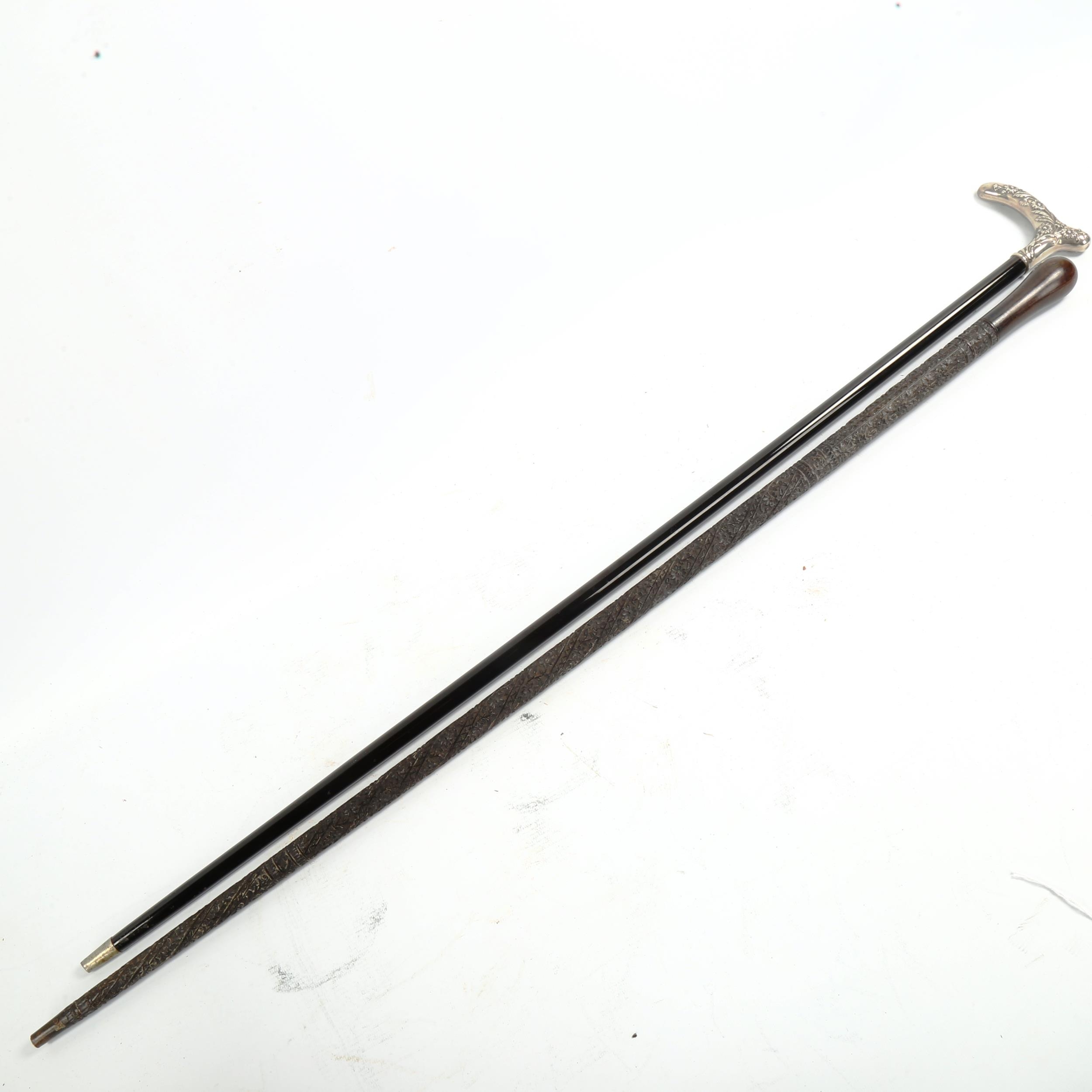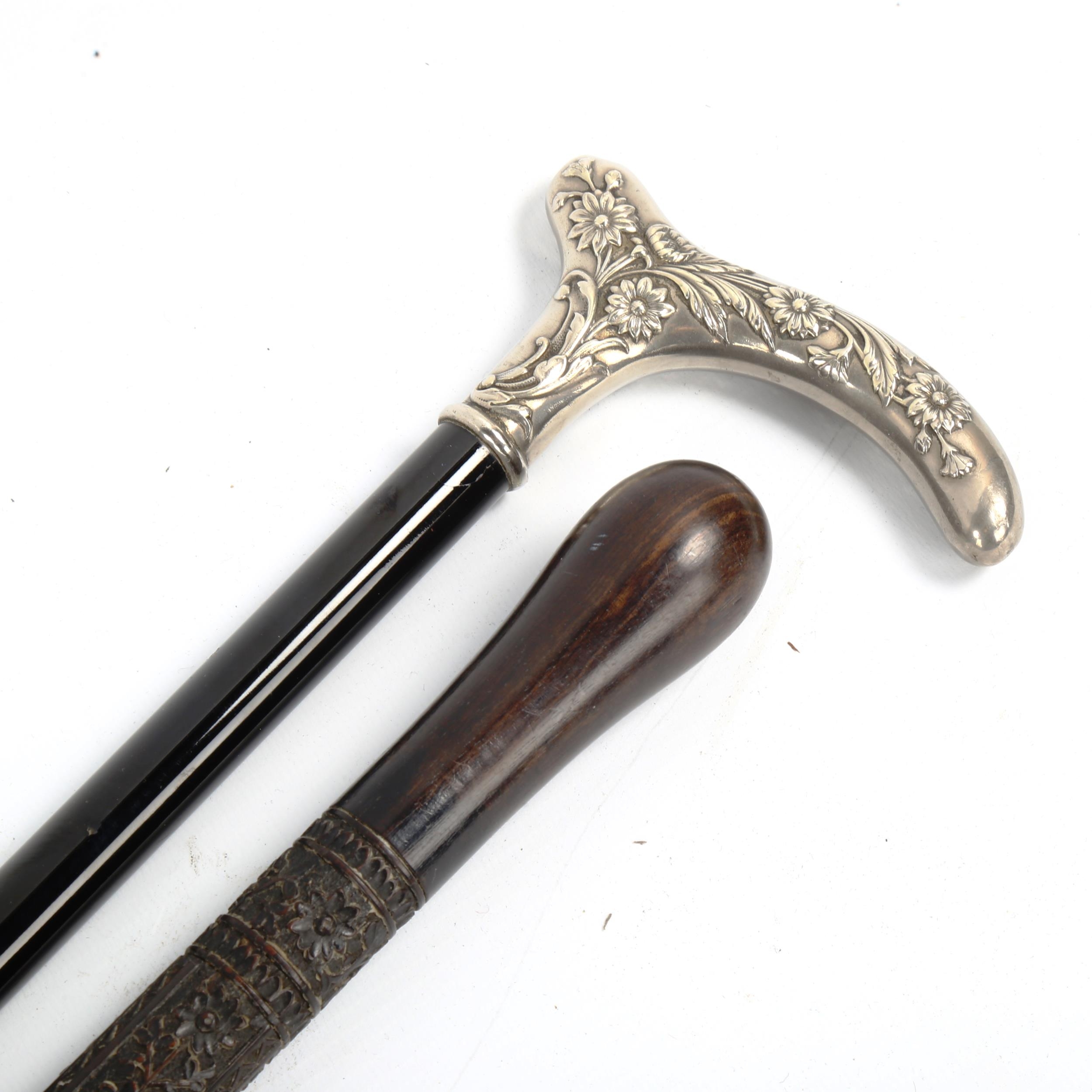 A 19th century walking stick, with unmarked white metal floral decorated handle, and a relief carved hardwood walking stick (2)
