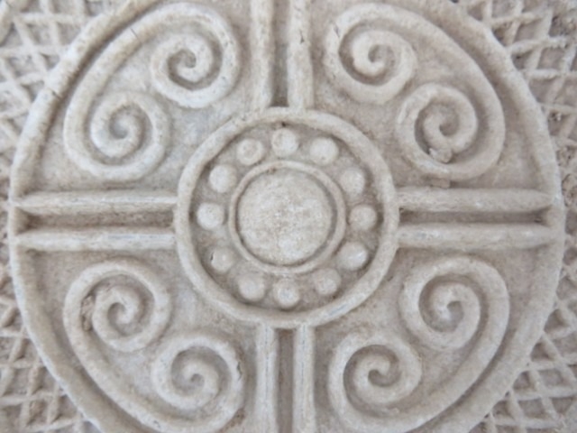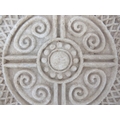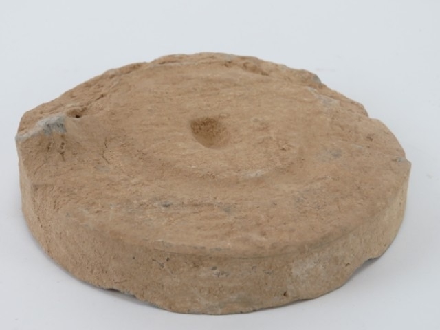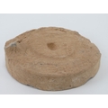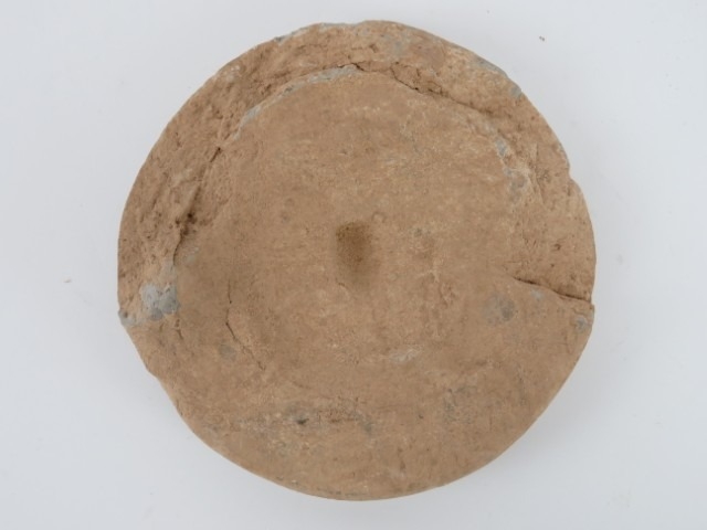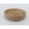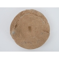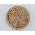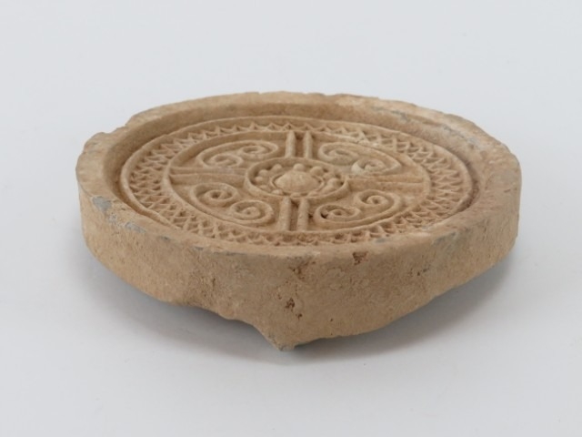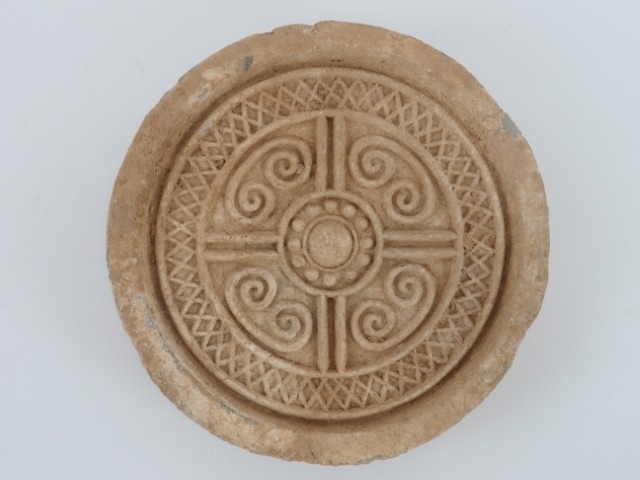 An ancient Chinese architectural earthenware roof end terminal tile, circa Qin dynasty (221 – 206 BCE). Of roundel form with concentric bands of geometric and C-scroll decoration. 15.3 cm diameter.