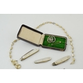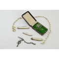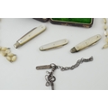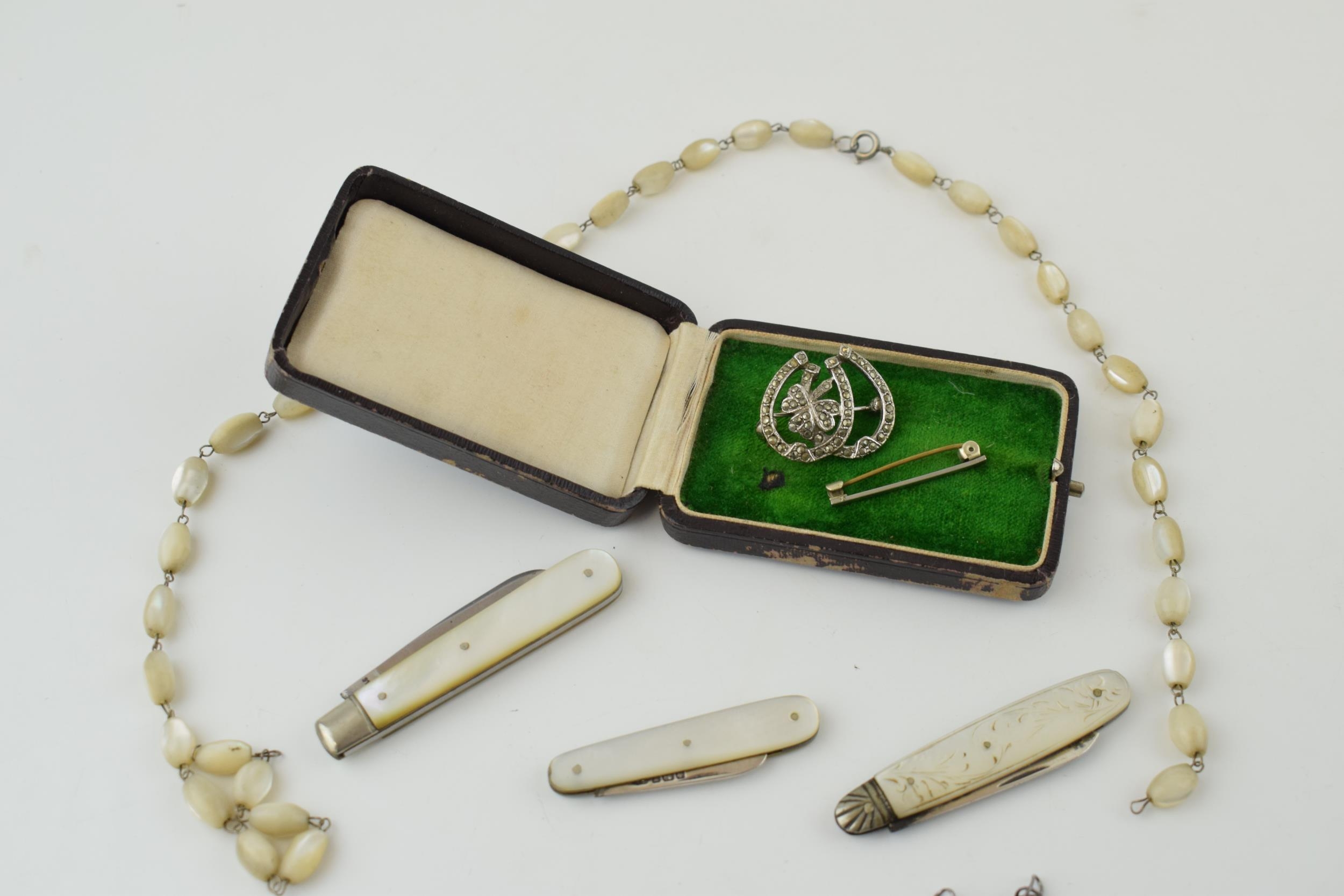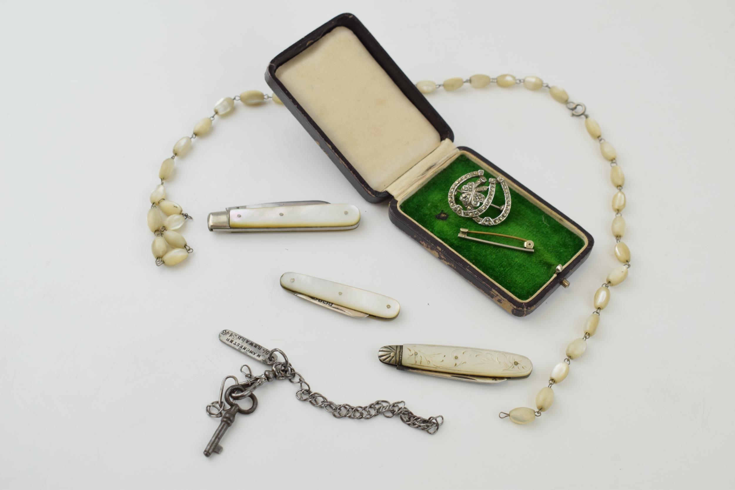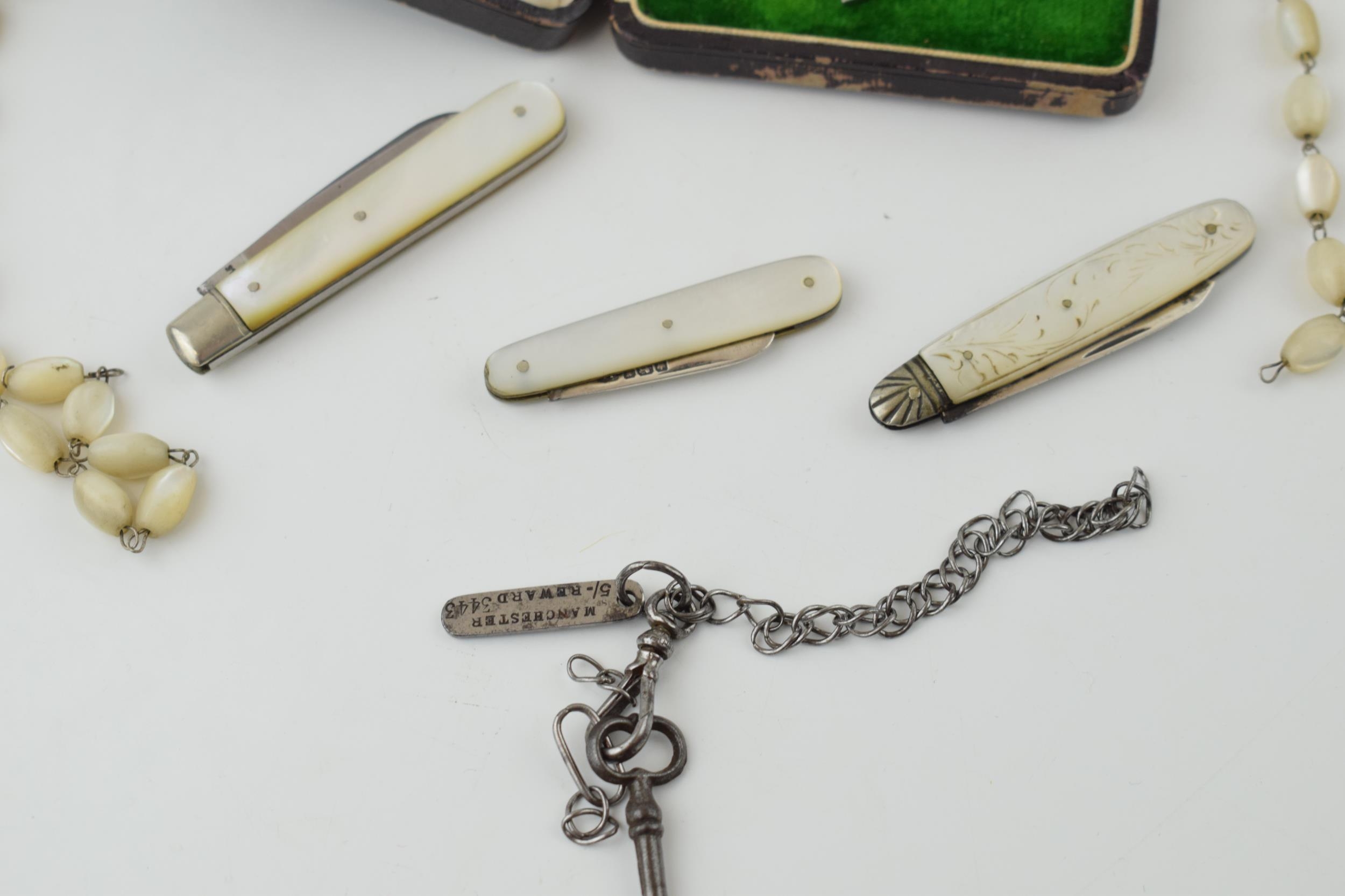 Two silver fruit knives and a stainless steel fruit knife with mother of pearl handles. Two pieces of costume jewellery a/f and white metal bar brooch and gun-metal chain with key, lobster claw clasp and reward tag 'Manchester 5/- 3443 Wood & Son', together with an antique jewellery box. (Qty)