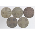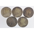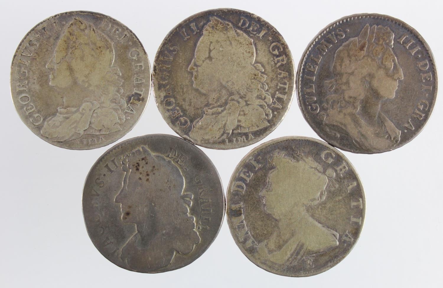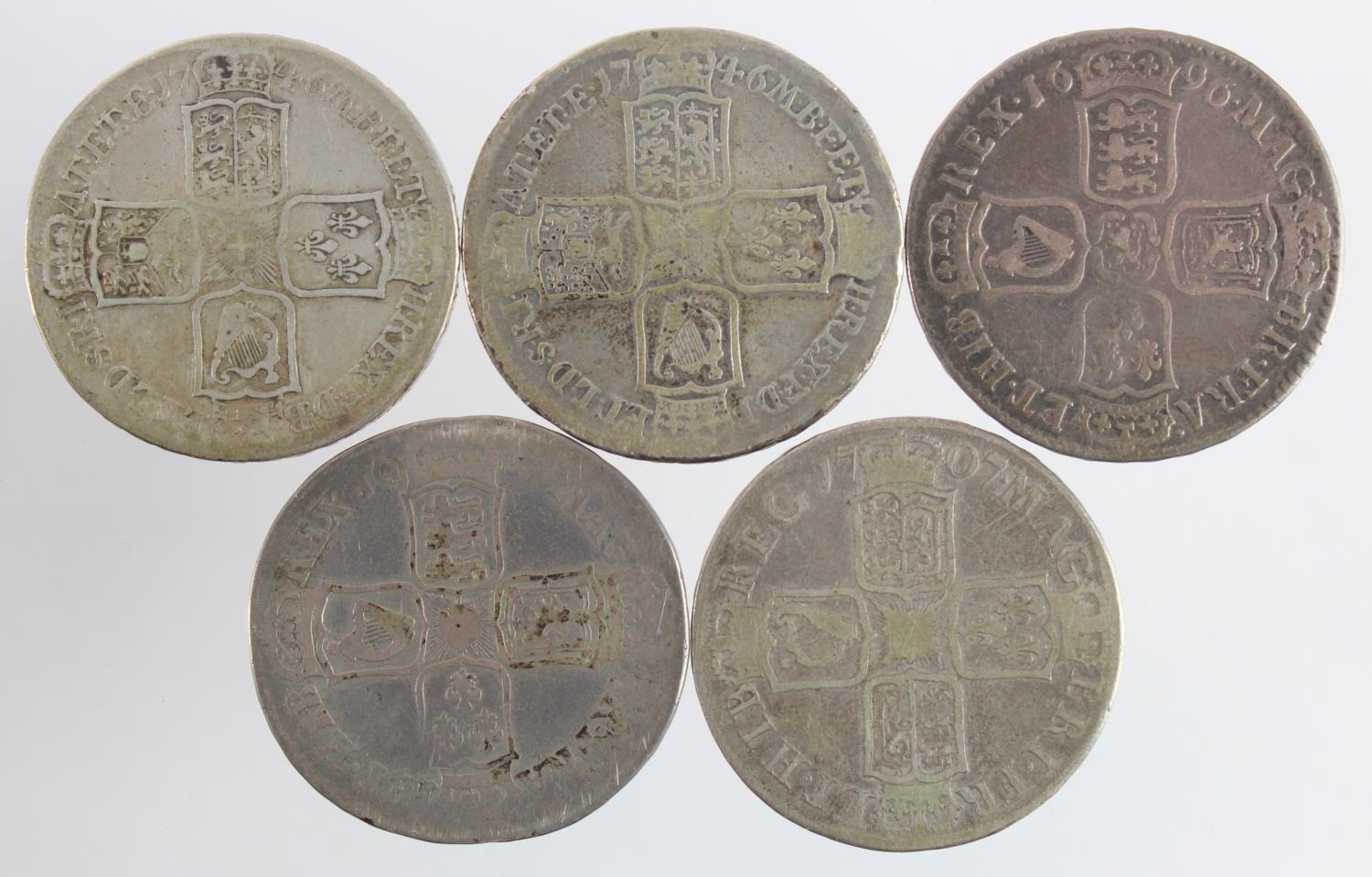 GB Halfcrowns (5) early milled: 1687 Fair, 1696 Octavo large shields, early harp, S.3481, nF, 1707E Sexto VG, 1746 D.Nono LIMA, S.3695A, Fine, and ditto Fair.