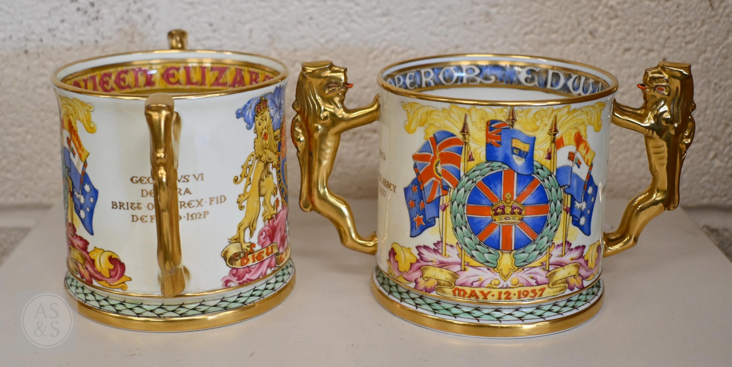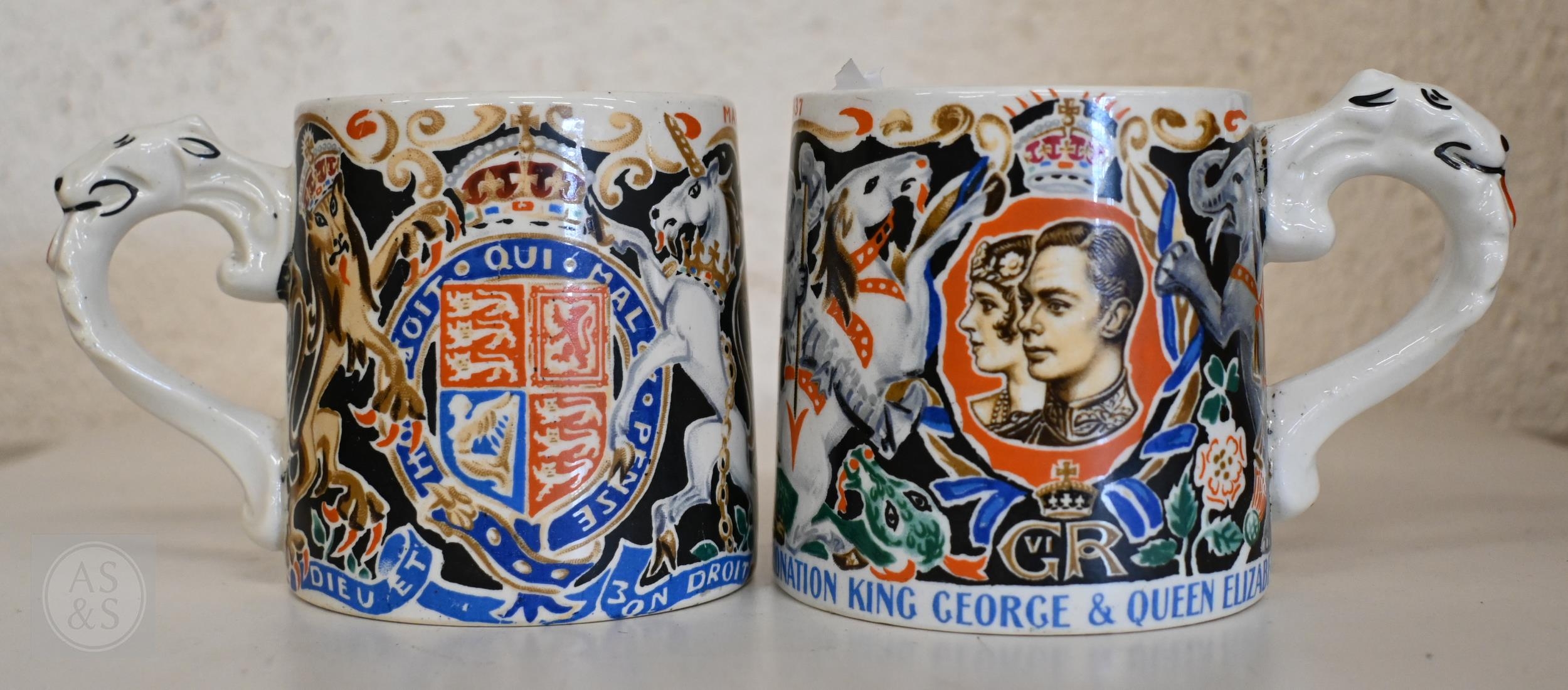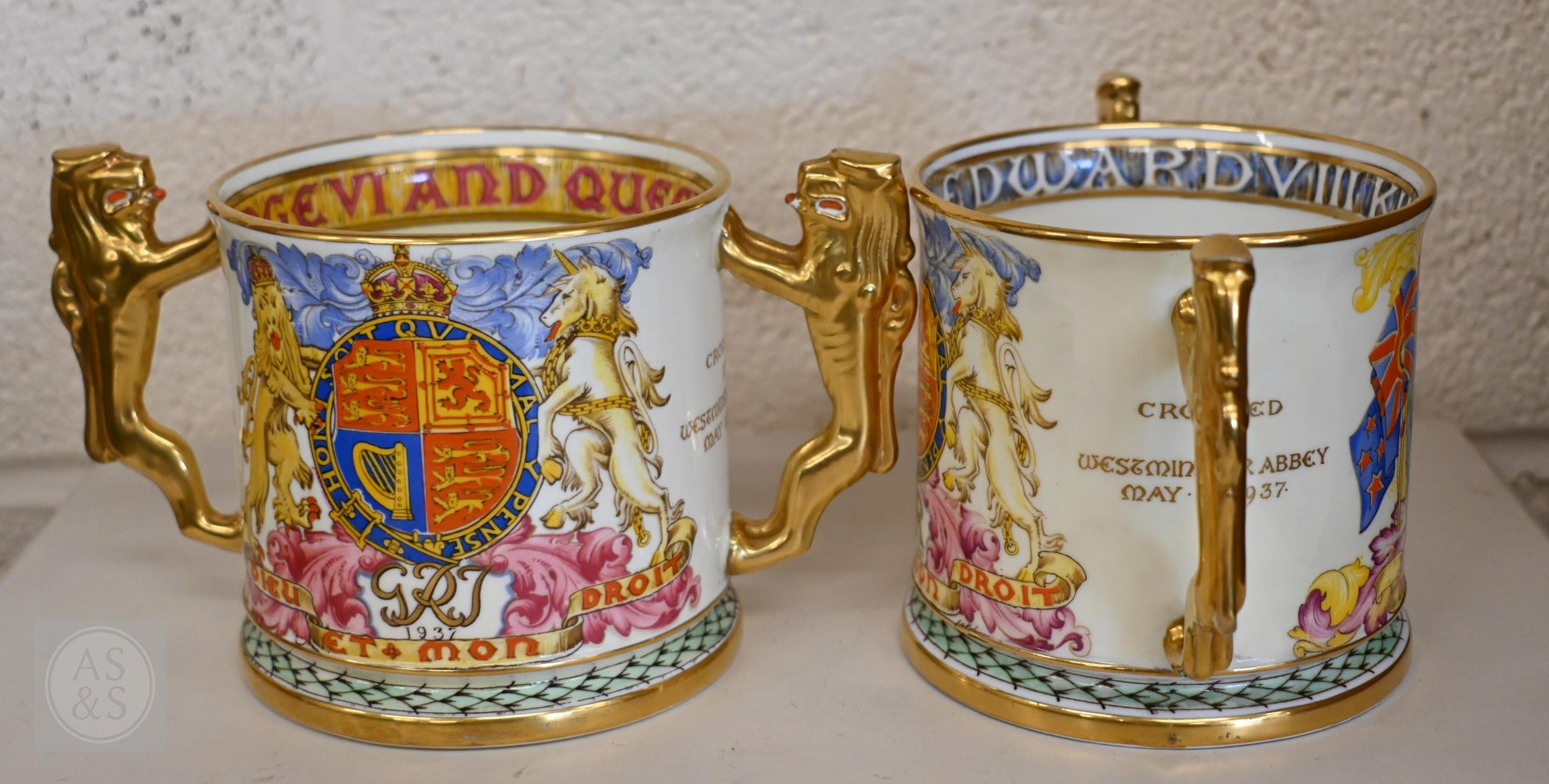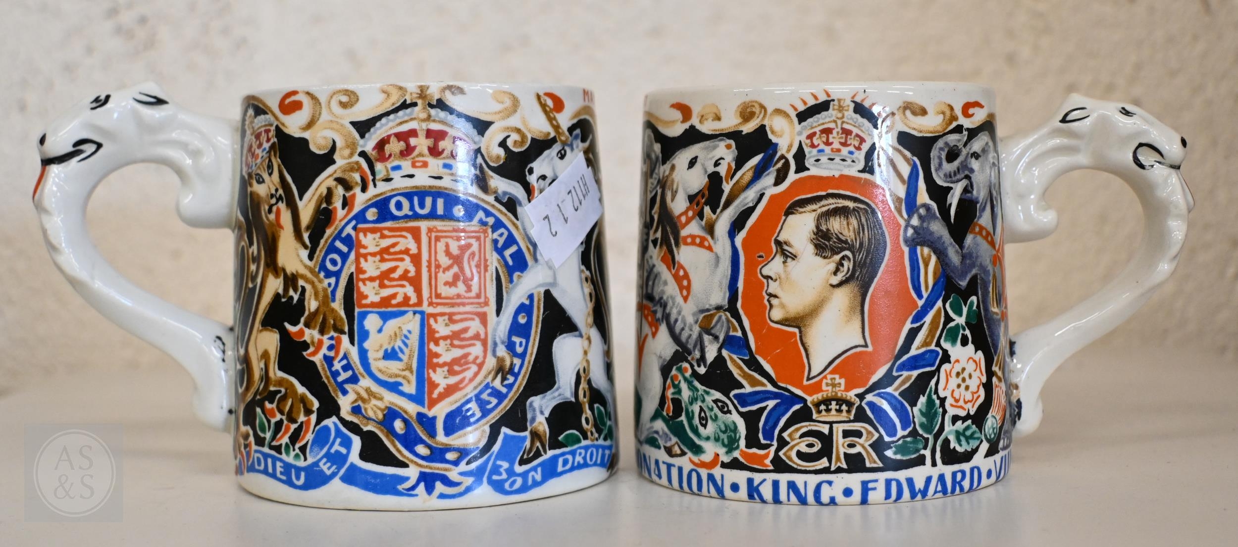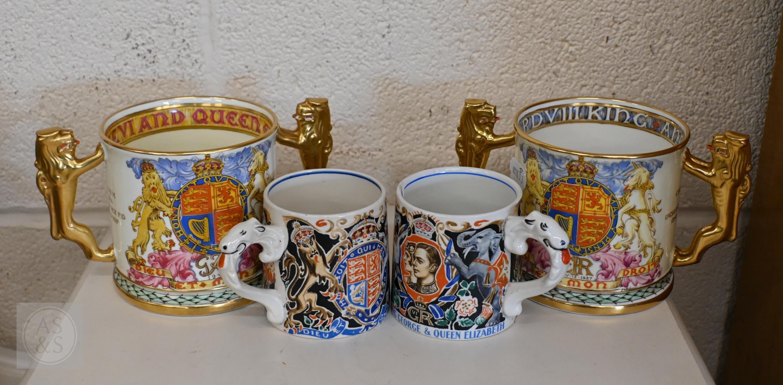 Two 1937 Coronation mugs for Edward VIII and George VI, designed by Dame Laura Knight, to/w two limited edition Paragon china loving cups, also Edward VIII and George VI, ltd ed nos 15 and 699/1000 (4)