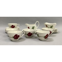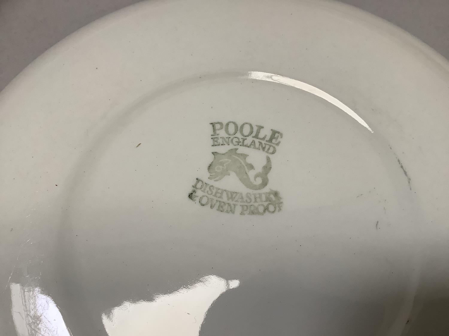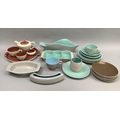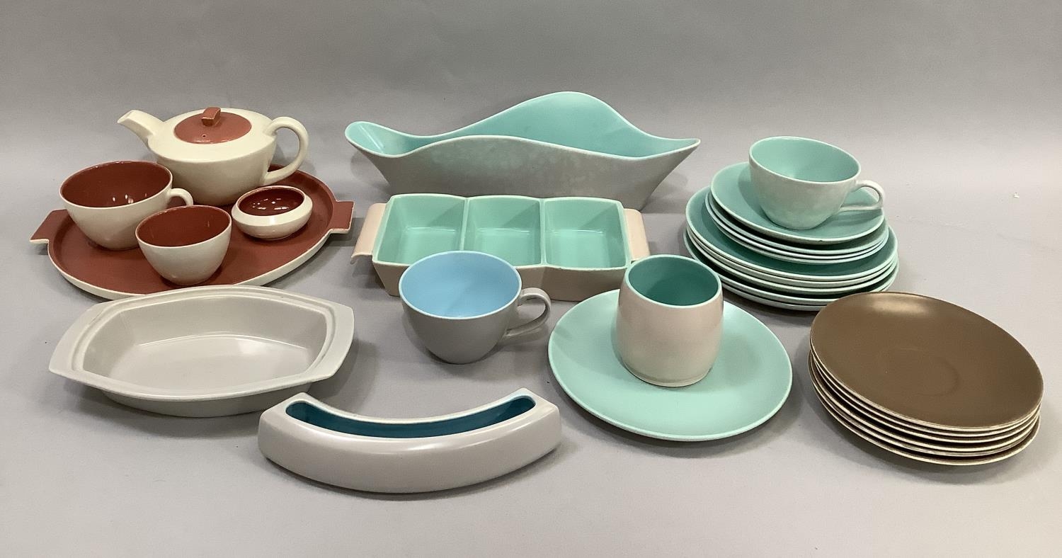 A Poole two-tone cream and deep coral individual breakfast tea set of teapot, sugar, teacup and tray and a similar shallow pot, together with turquoise and mottled grey Poole tea ware, large wavy vase, posy trough, triple hors d'oeuvres dish and other items