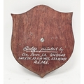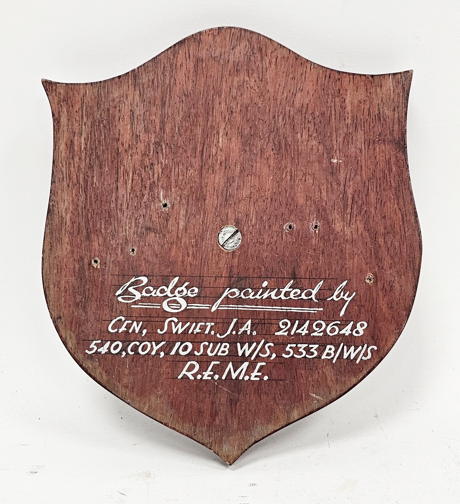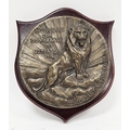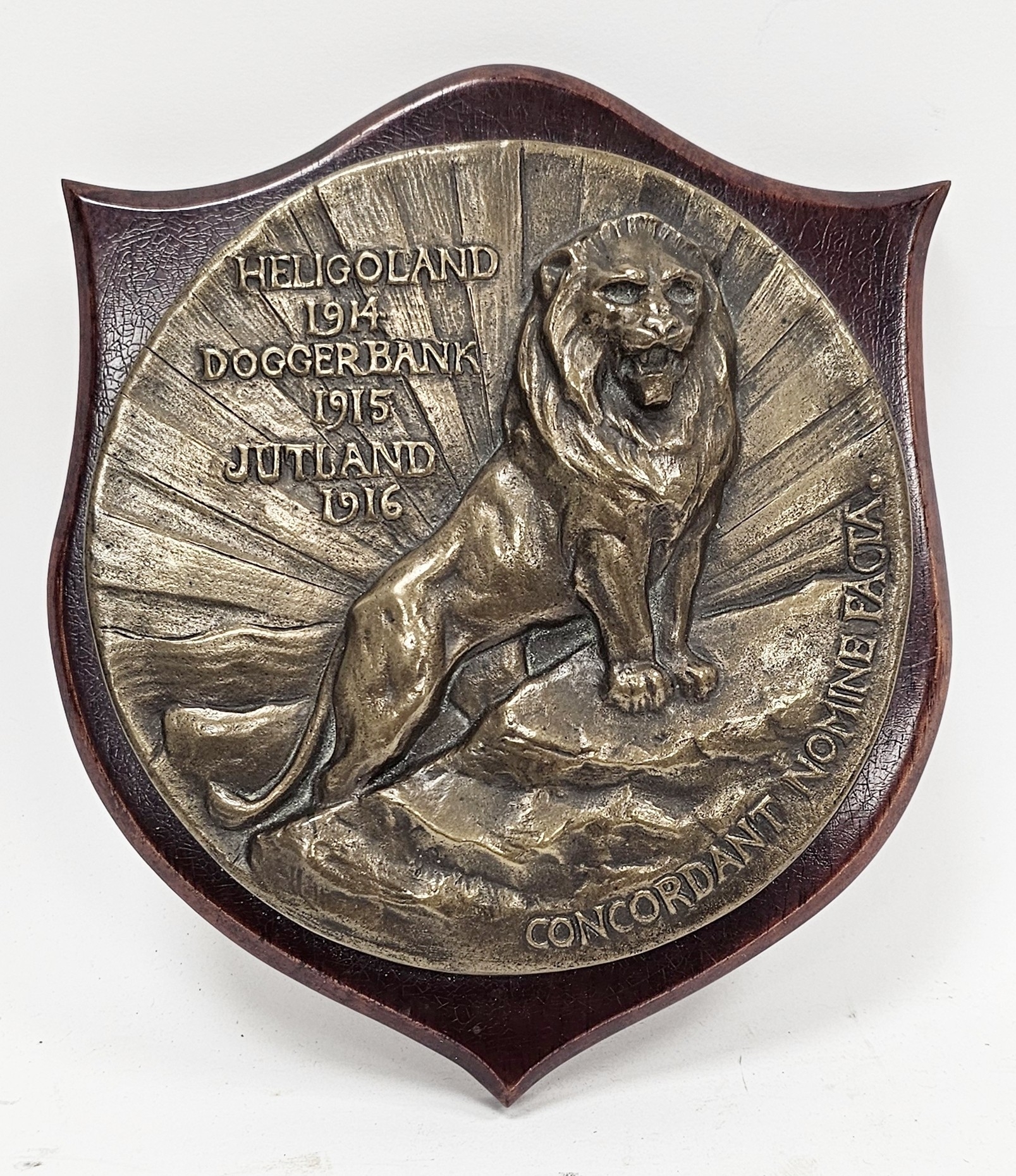 World War I circular bronze badge plaque relating to HMS Lion, decorated in relief with a lion and the wording ' Heligoland 1914, Doggerbank 1915, Jutland 1916 ' and ' concordant nomine facta ', mounted on a wooden shield, the shield marked to verso ' Badge painted by CFN, Swift. J.A. 2142648 540, COY, 10 sub W/S, 533 B/W/S R.E.M.E ' 23cm high