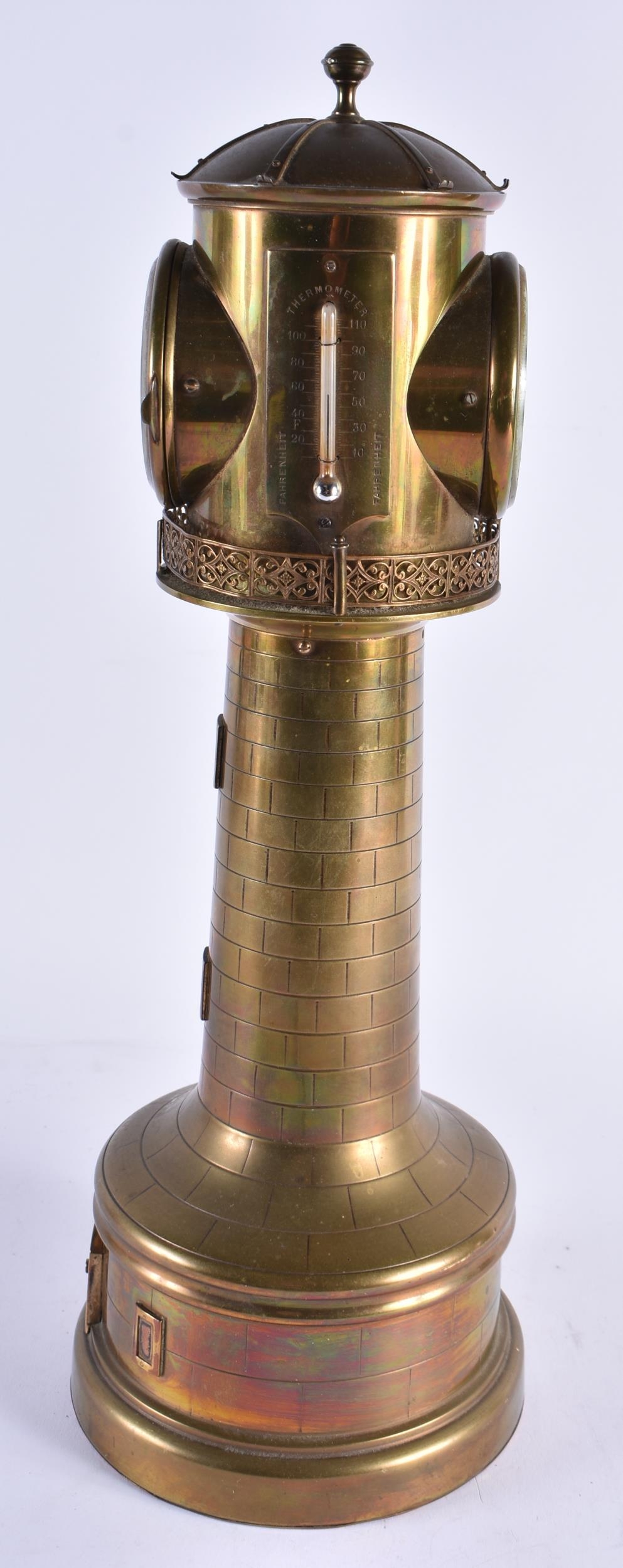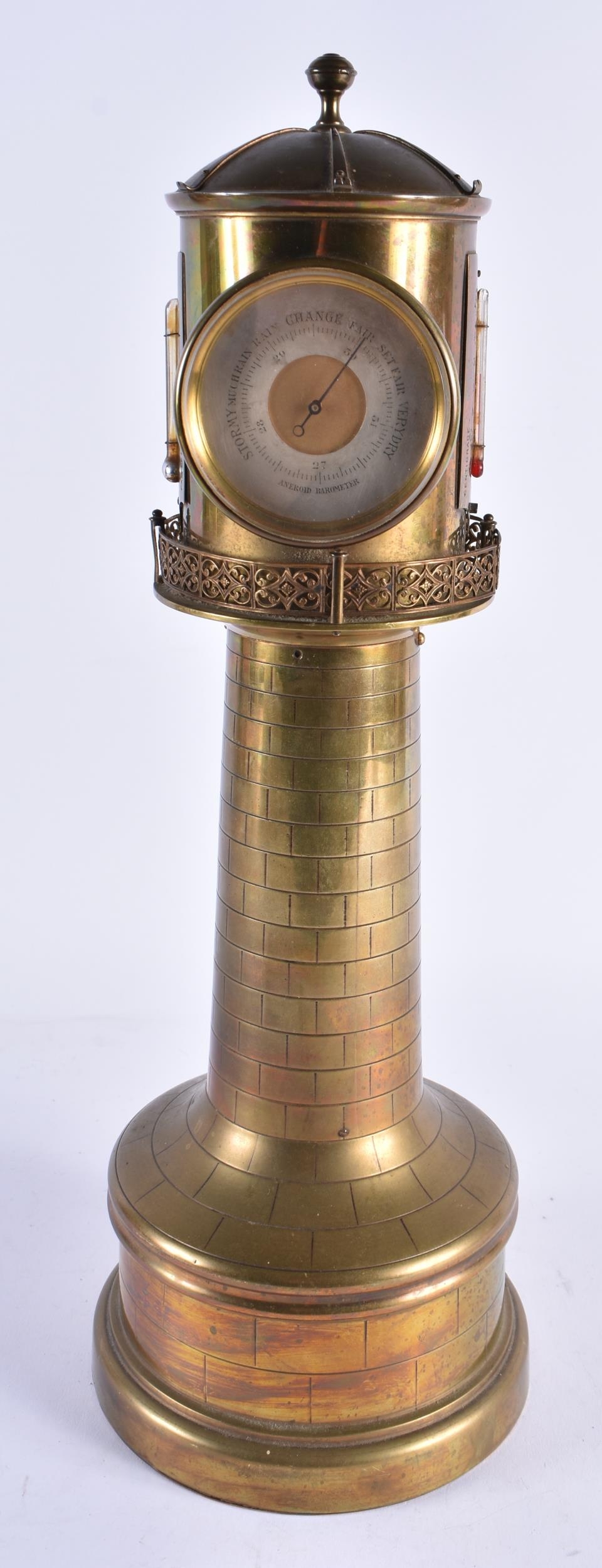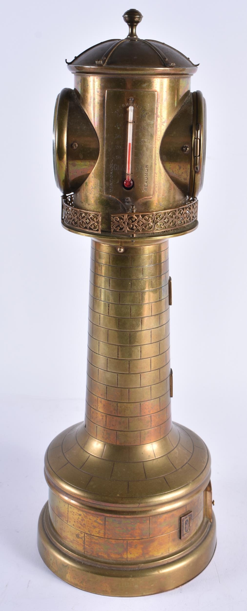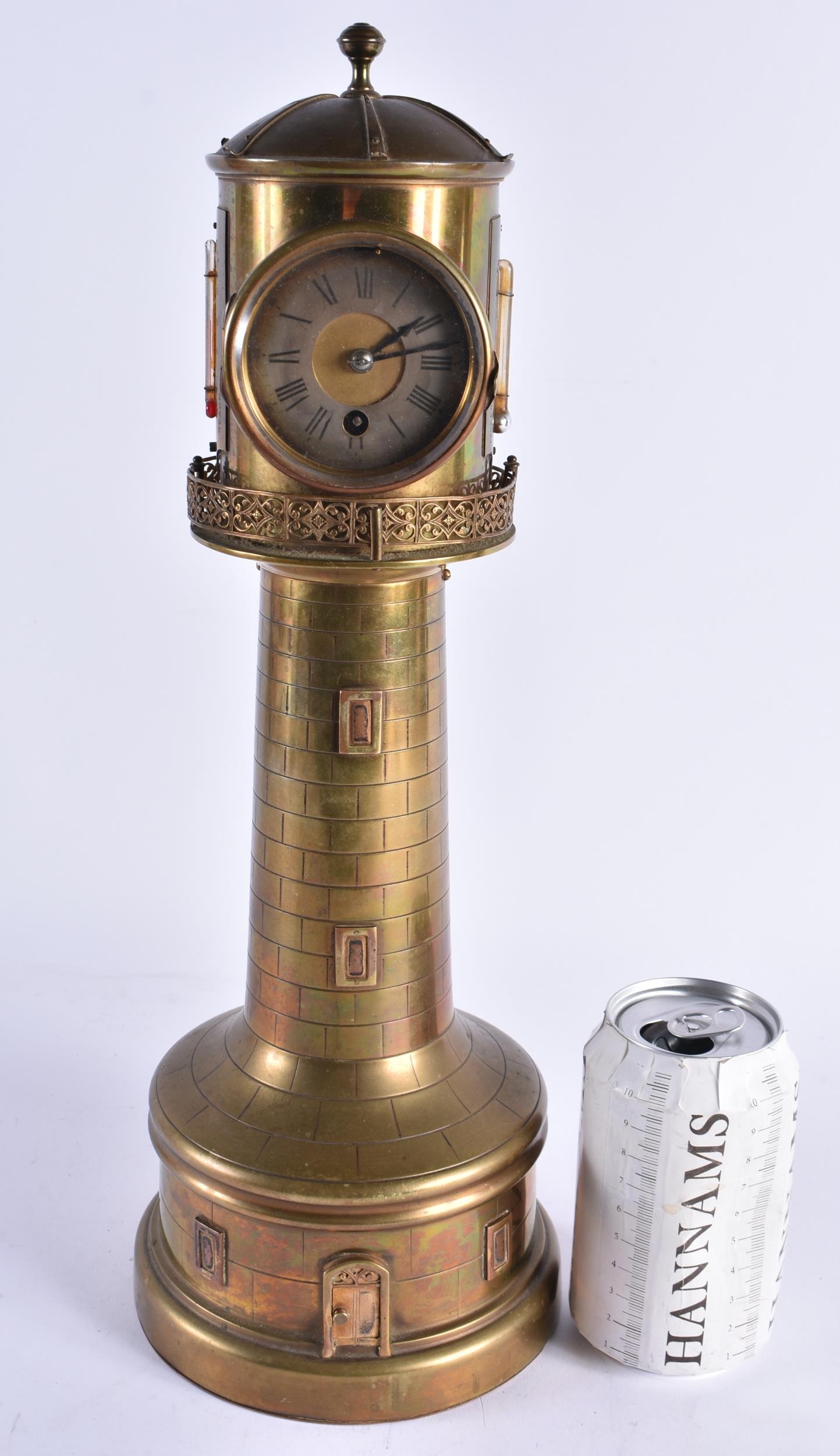 A LOVELY LARGE 19TH CENTURY GUILLEMET INDUSTIRAL BRONZE LIGHTHOUSE CLOCK formed with a silver dial, beside a barometer and thermometer, the front door opening to reveal a winding hole. 40 cm high.