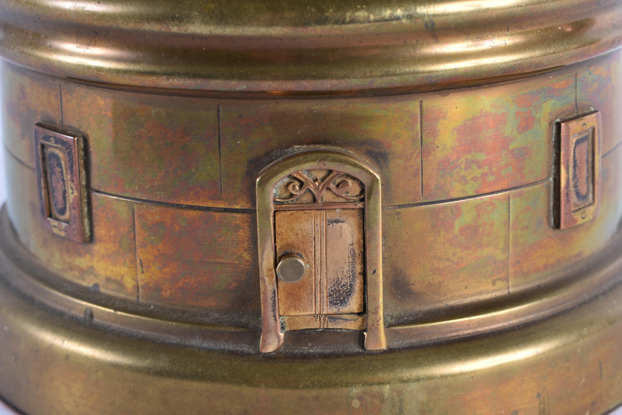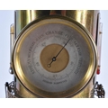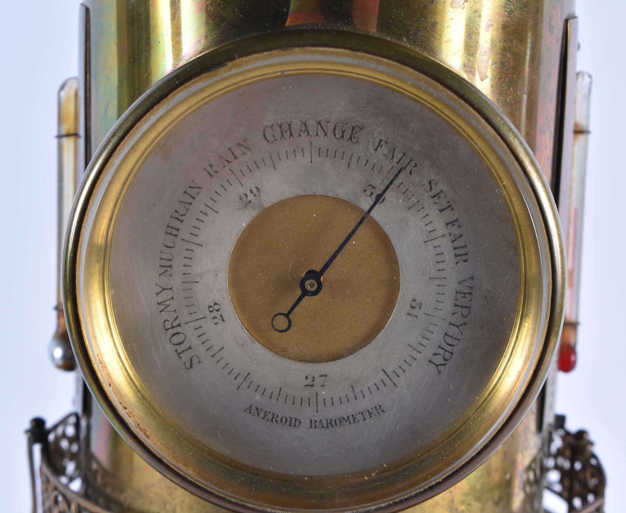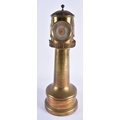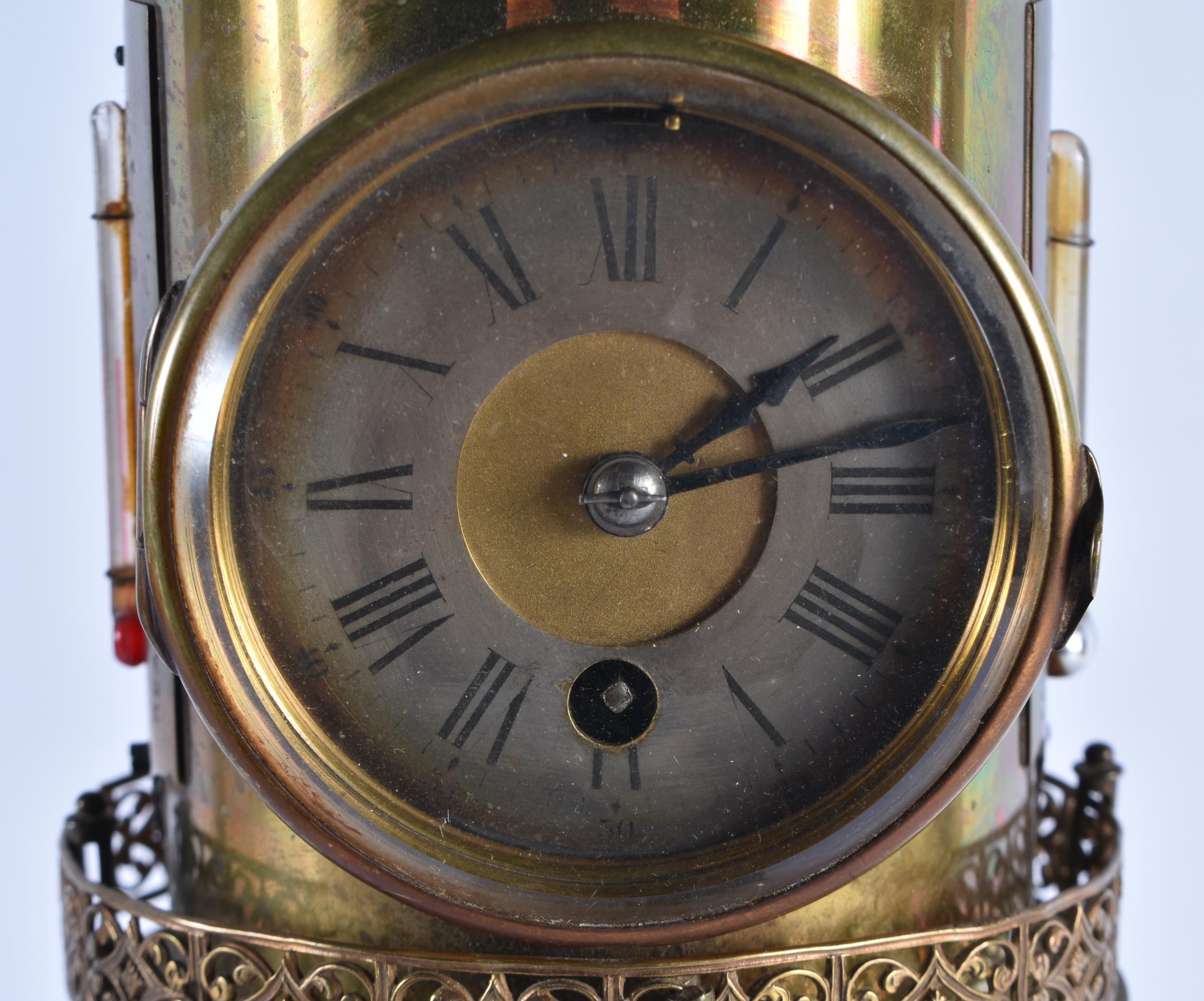 A LOVELY LARGE 19TH CENTURY GUILLEMET INDUSTIRAL BRONZE LIGHTHOUSE CLOCK formed with a silver dial, beside a barometer and thermometer, the front door opening to reveal a winding hole. 40 cm high.
