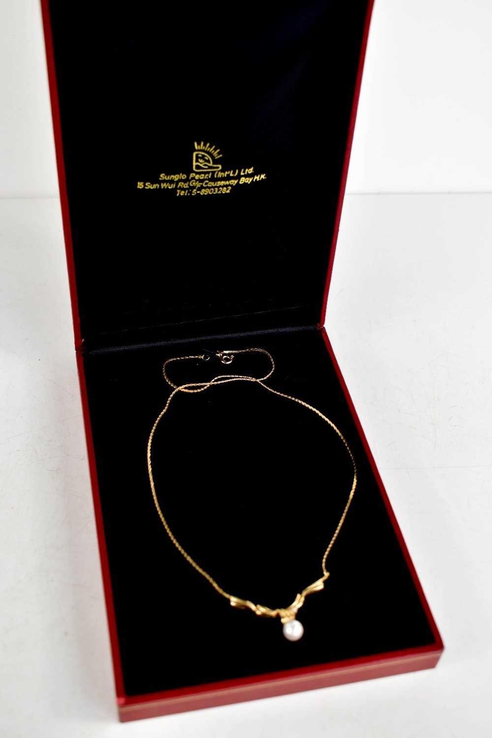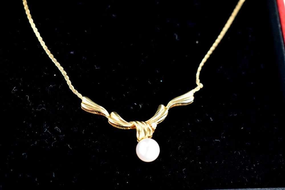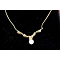 A 14ct gold, pearl and diamond brilliant necklace, the wave pendant set with a single pearl and diamond brilliant, 3.97g, 43cm long.