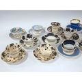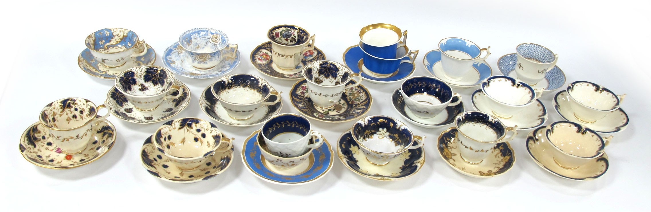 A Collection of Rockingham Porcelain Tea and Coffee Wares, each with floral scrolls or foliate decoration within blue borders, some with Griffin marks, comprising: eighteen saucers, twelve tea cups and eight coffee cups. (38)