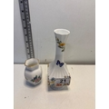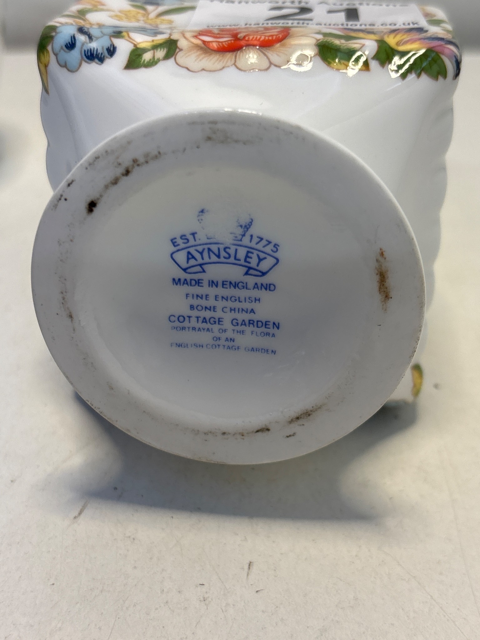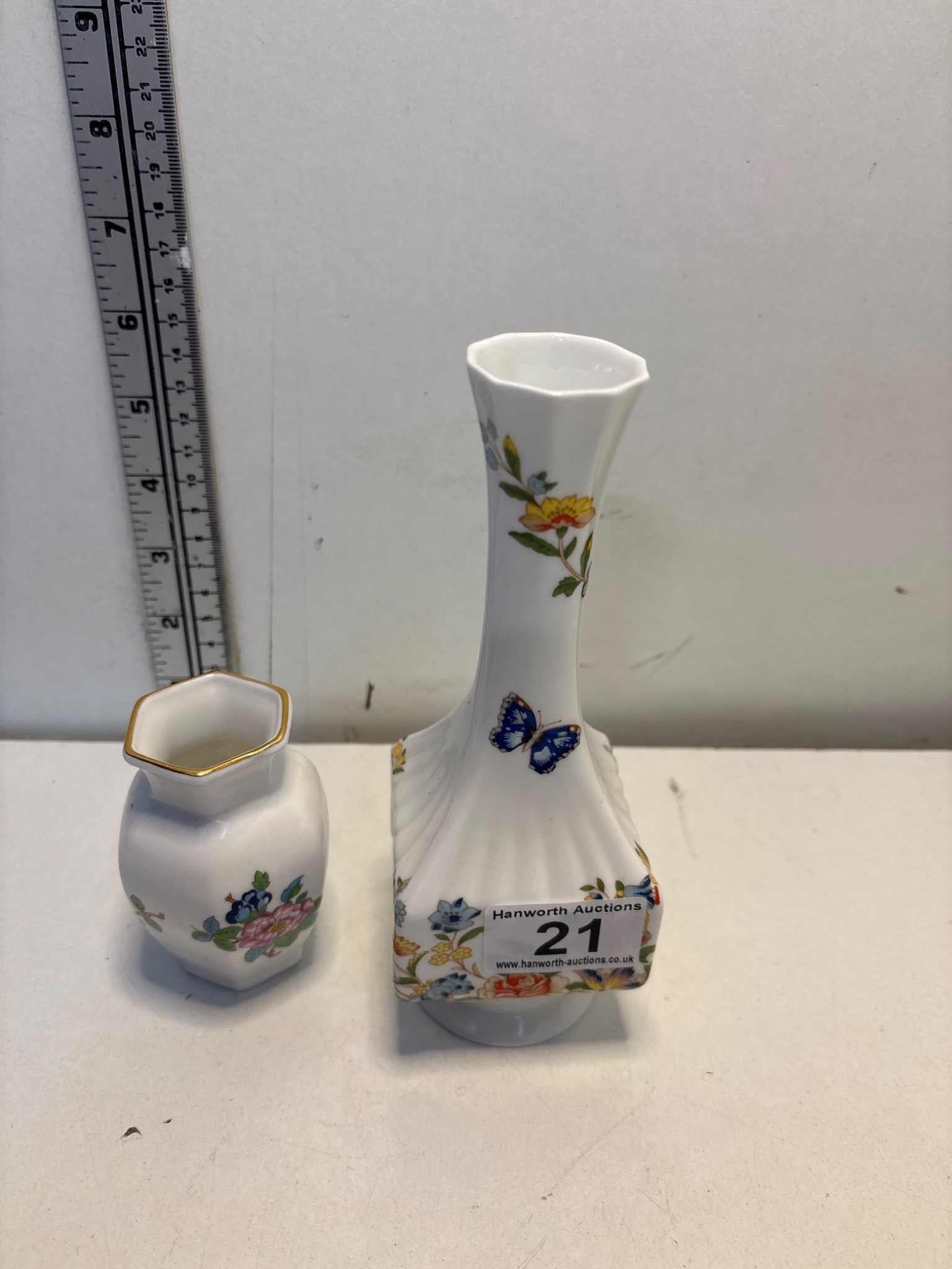 Two Aynsley bone china vases featuring floral patterns. The taller vase is 'Cottage Garden' design, made in England, marked 'Est. 1775'.