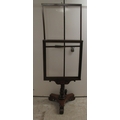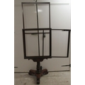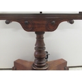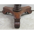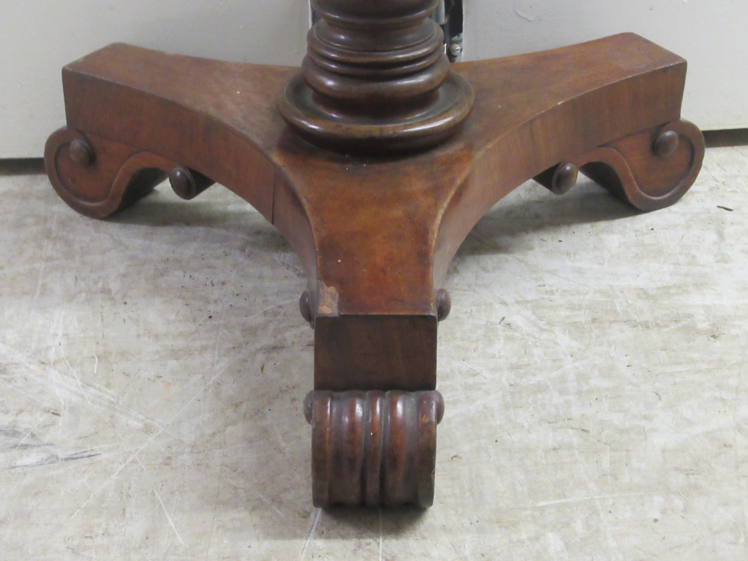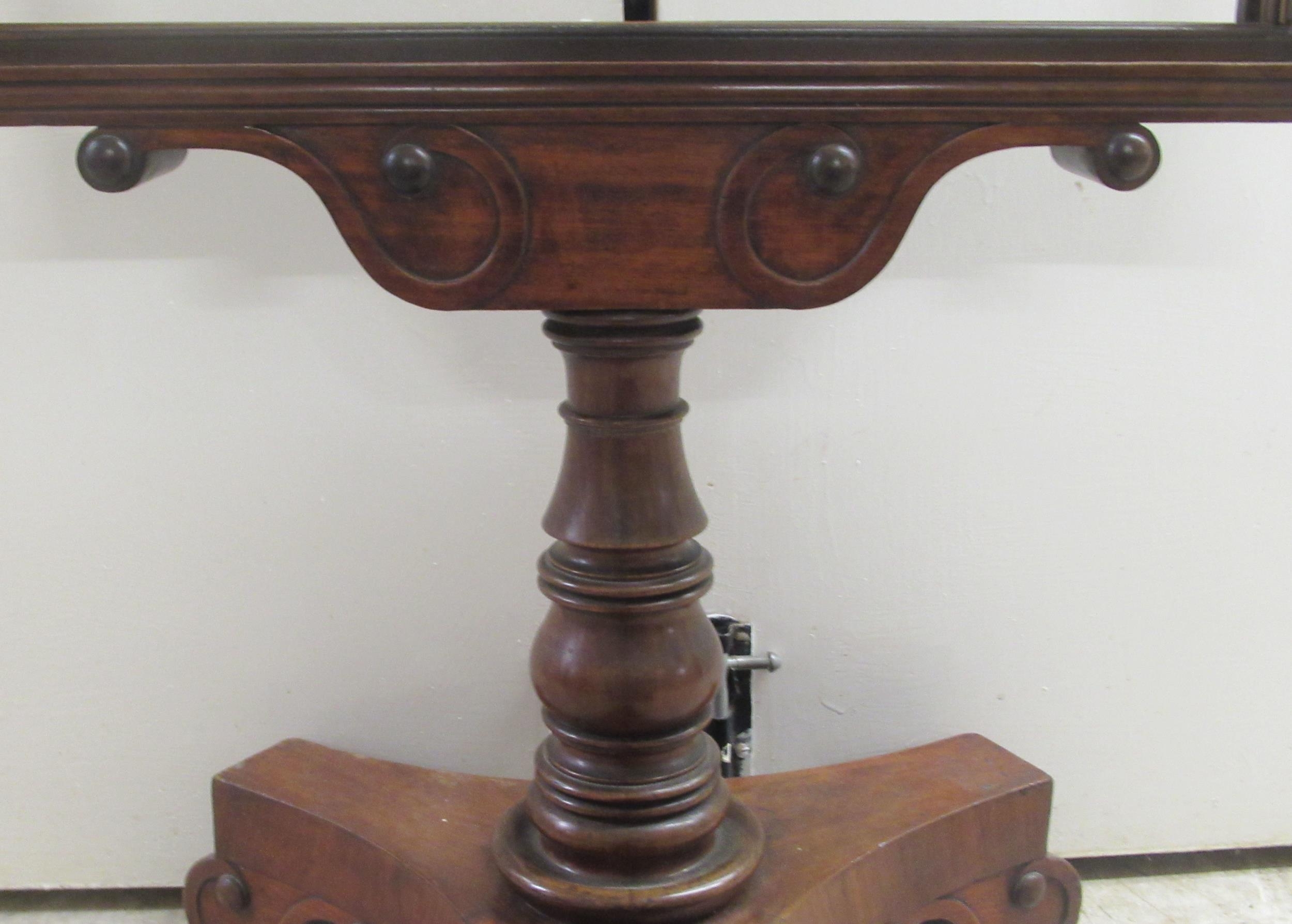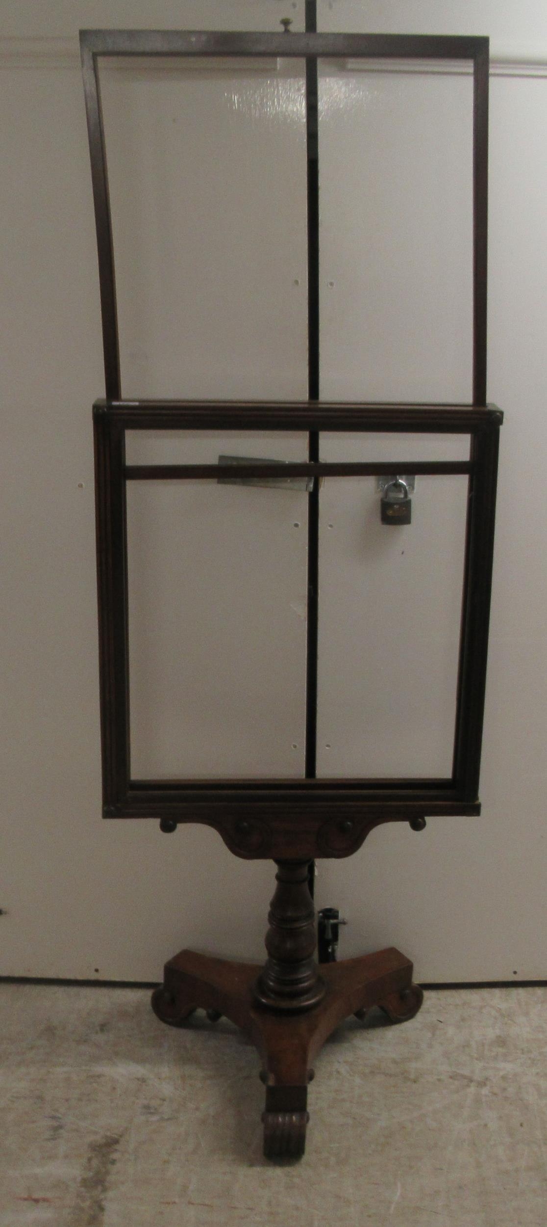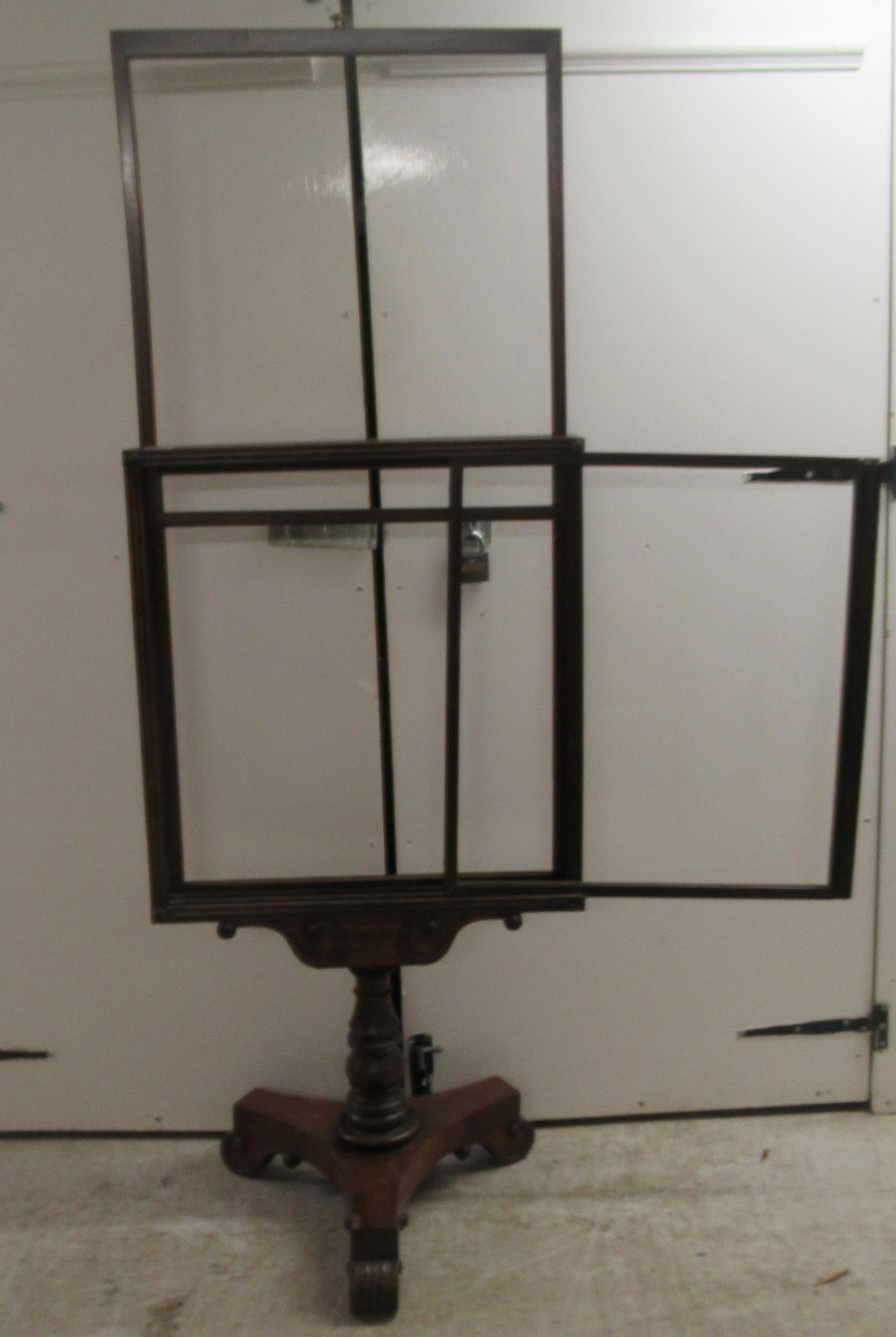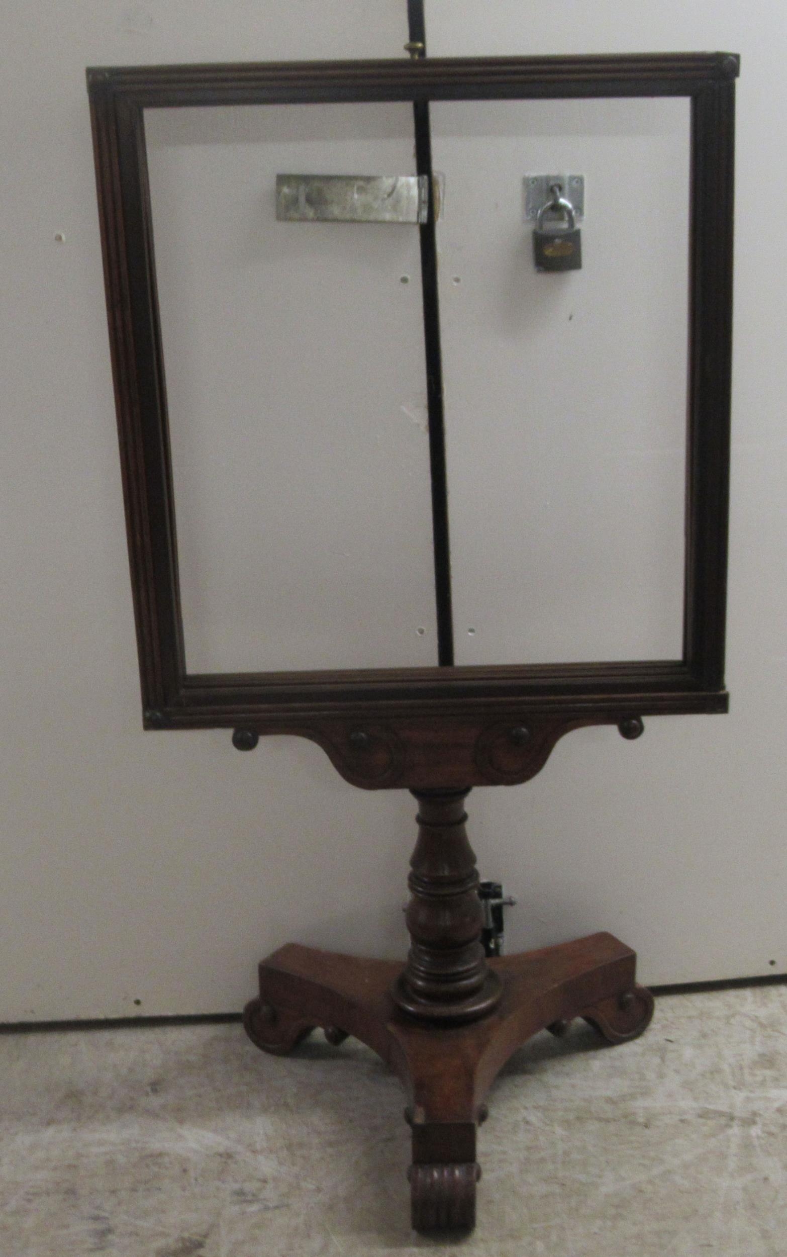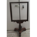 A William IV mahogany framed firescreen, the rectangular framed extending top section on a turned pedestal and splayed concave, tripod base 45"h