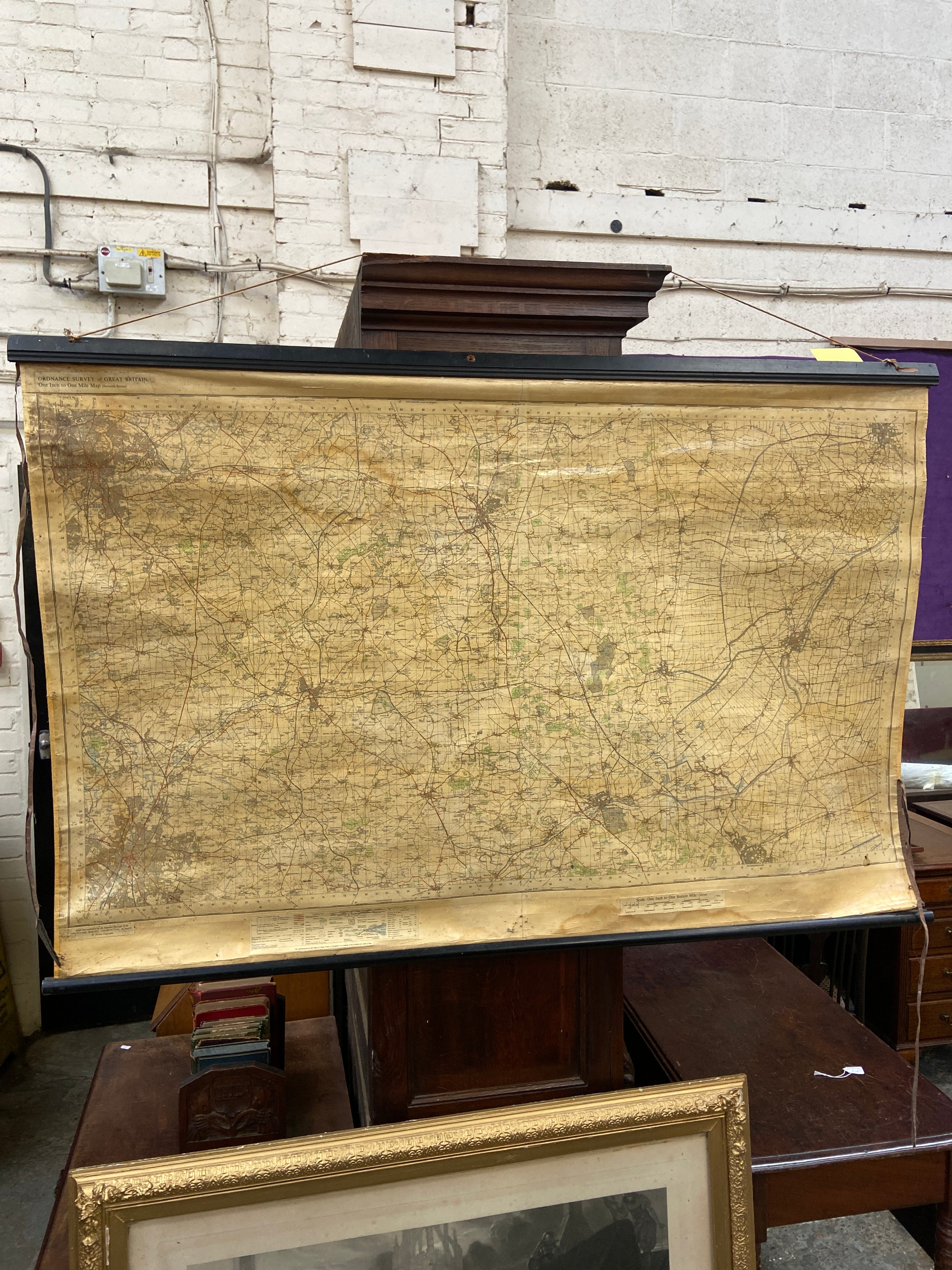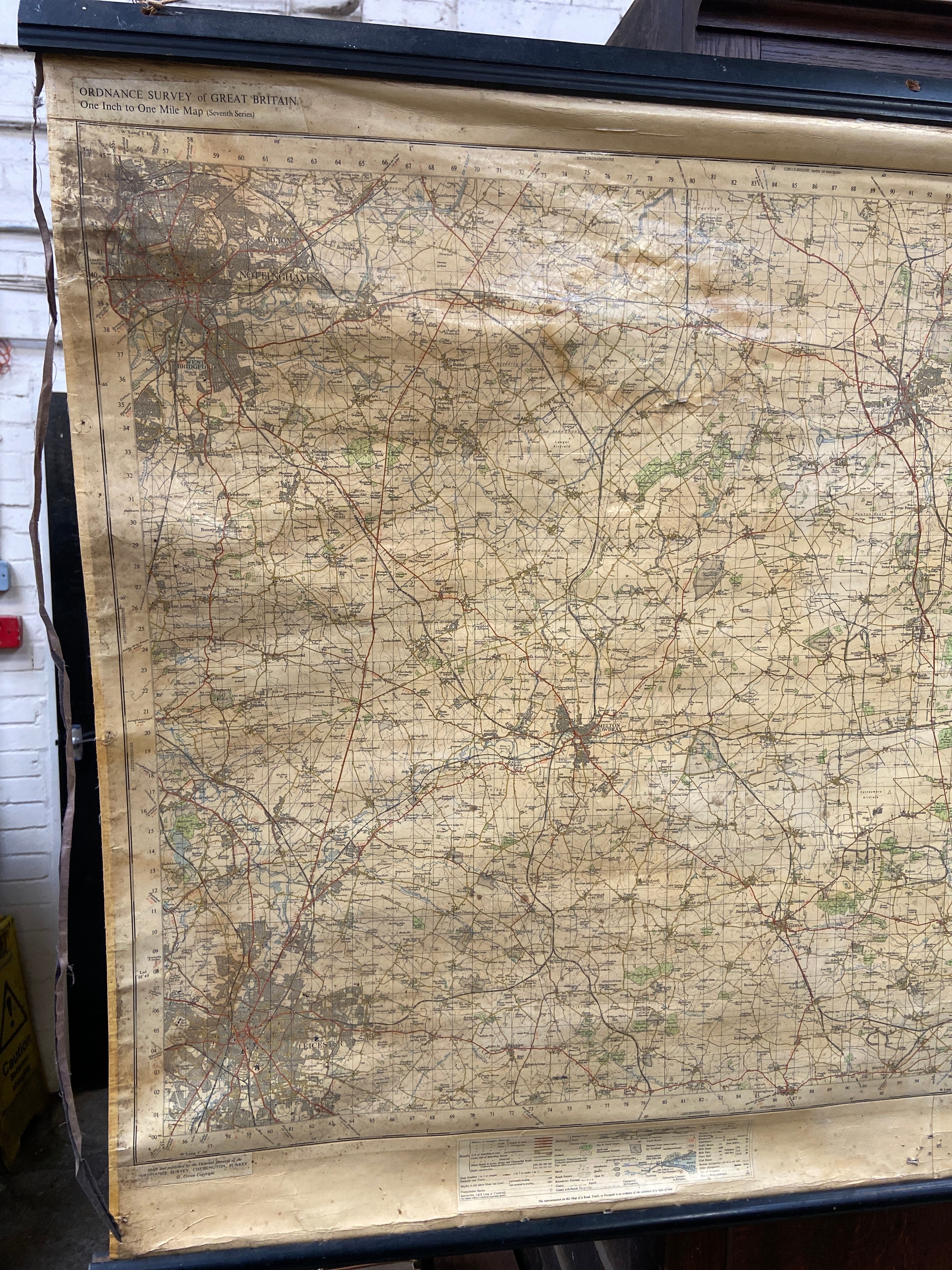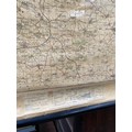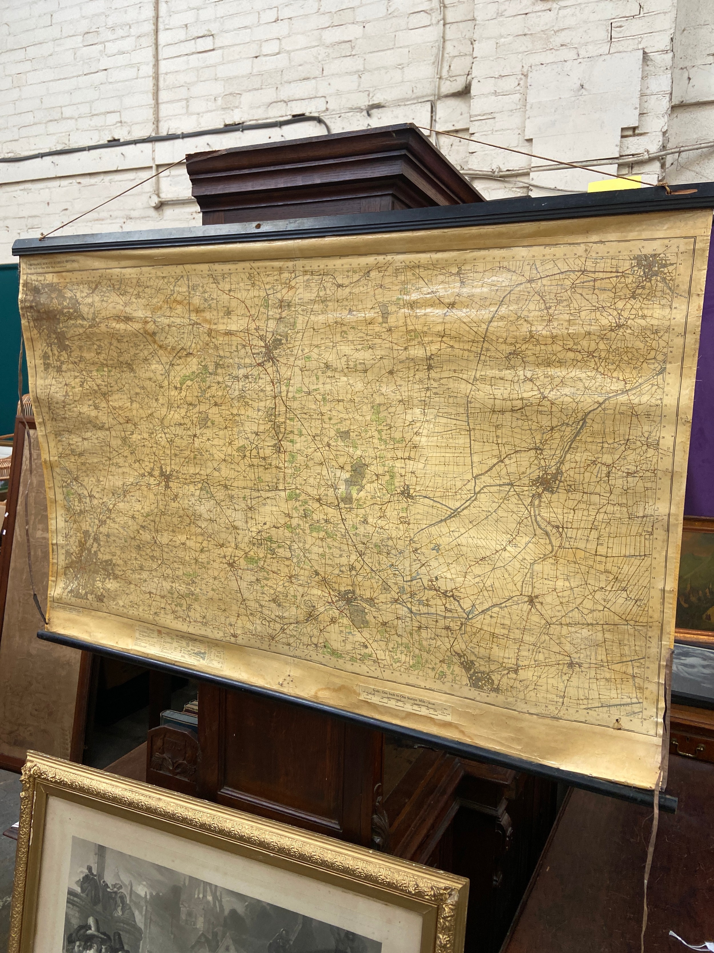Large vintage Ordnance Survey map of Lincolnshire and parts of Kesteven (Little Holland), mounted on wooden rolling bars to be hung on the wall. 137cm wide x 91cm.