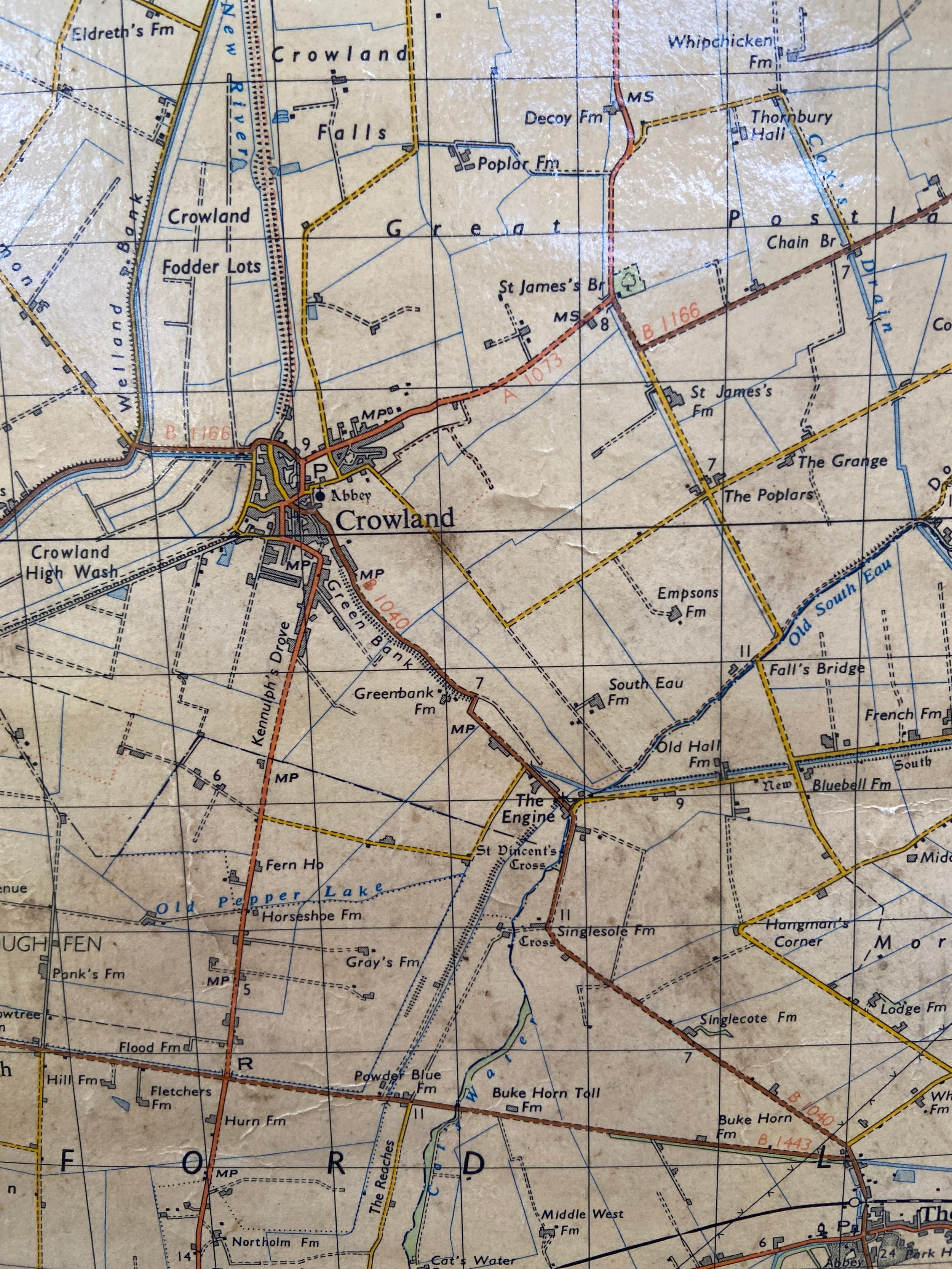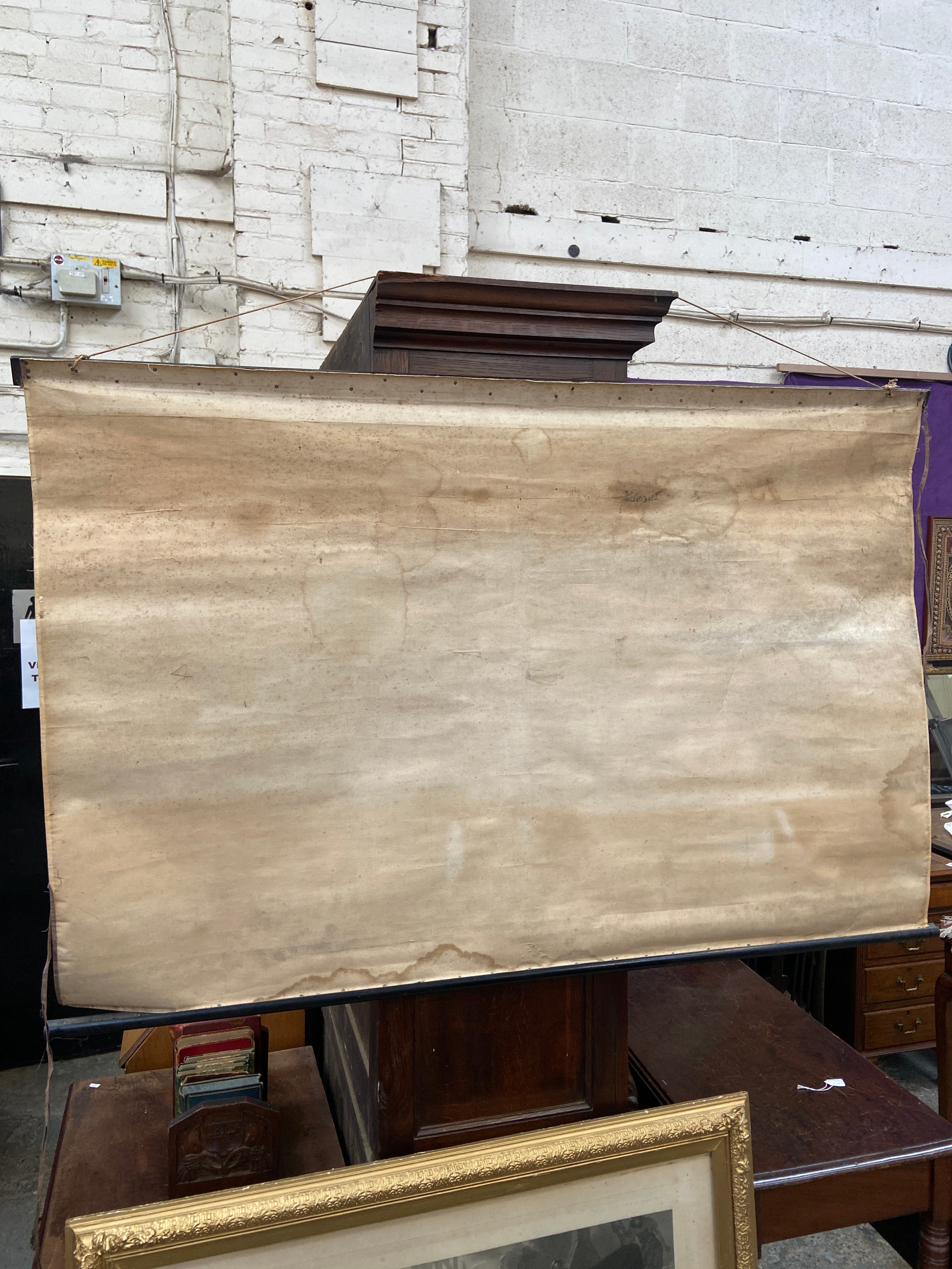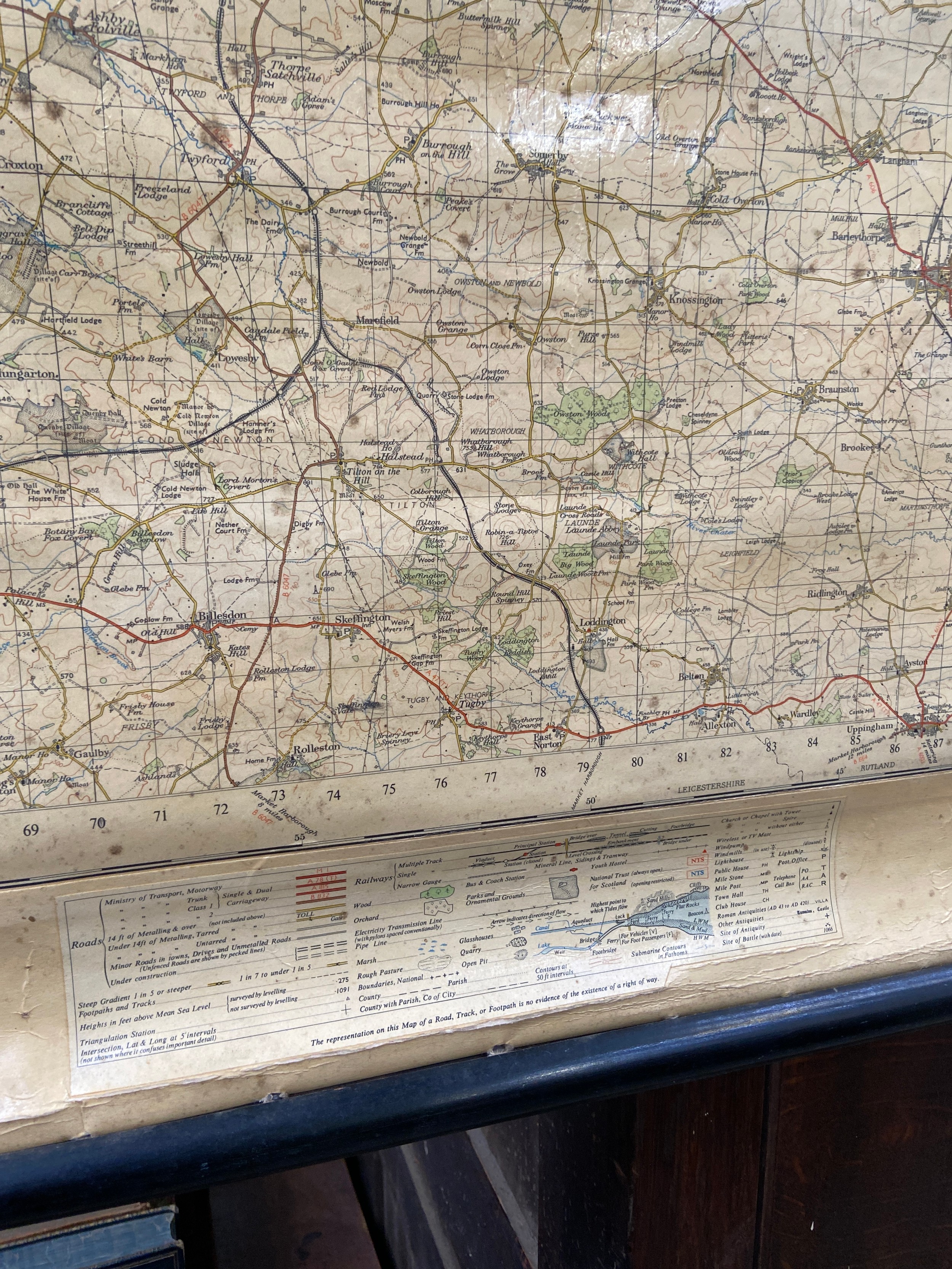 Large vintage Ordnance Survey map of Lincolnshire and parts of Kesteven (Little Holland), mounted on wooden rolling bars to be hung on the wall. 137cm wide x 91cm.