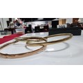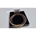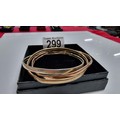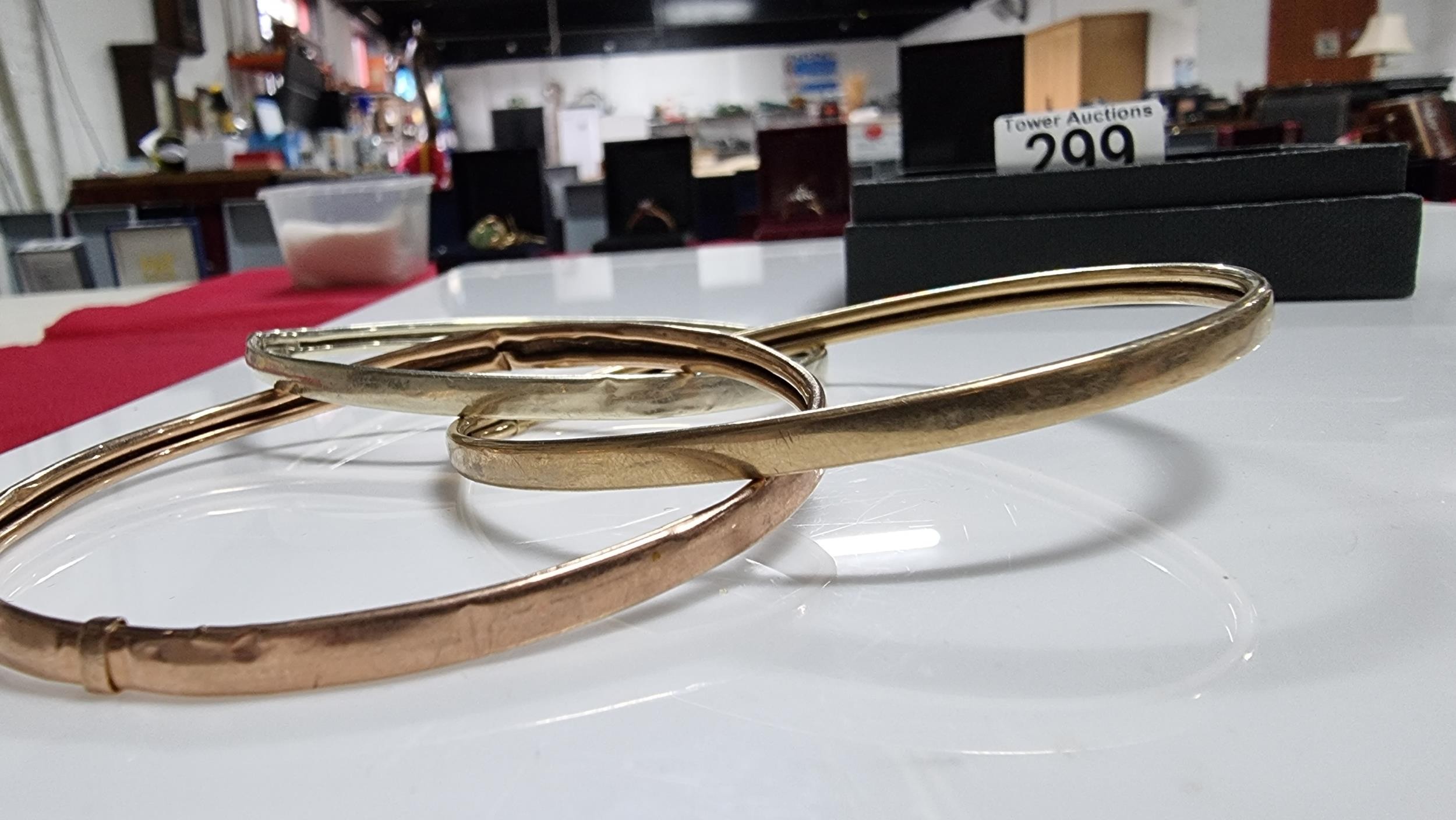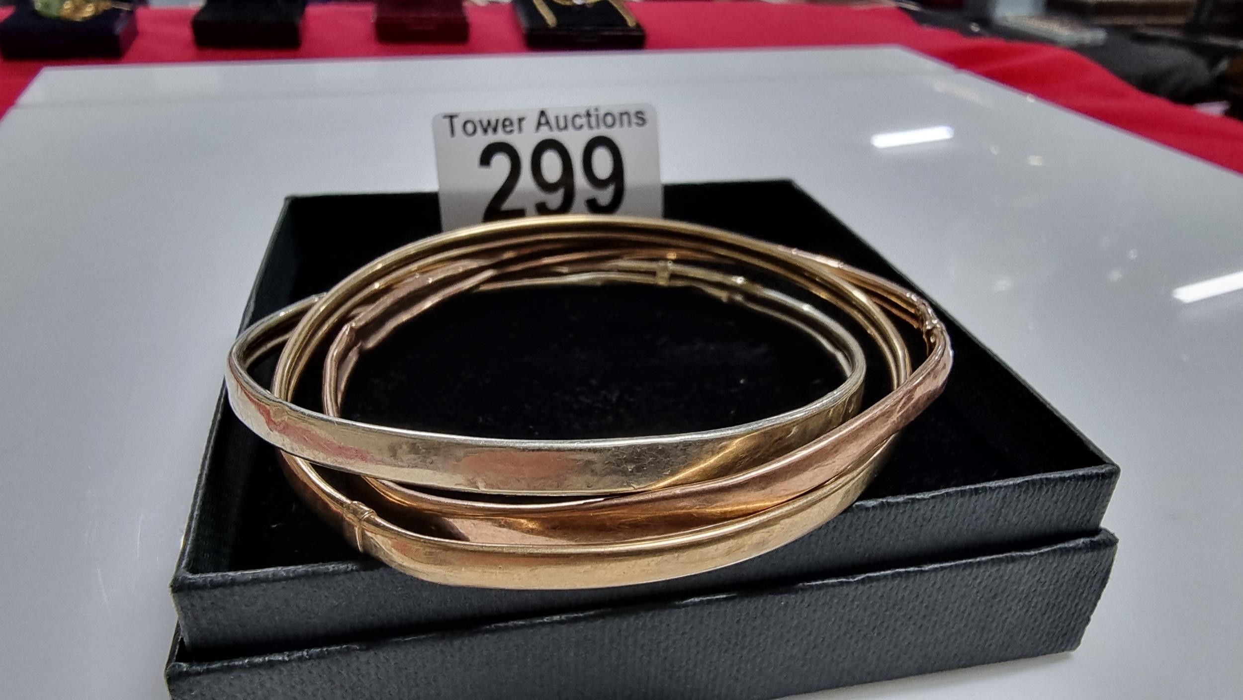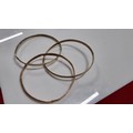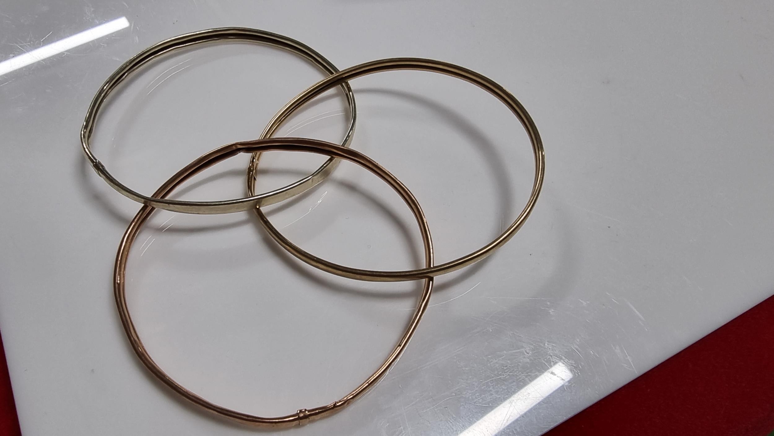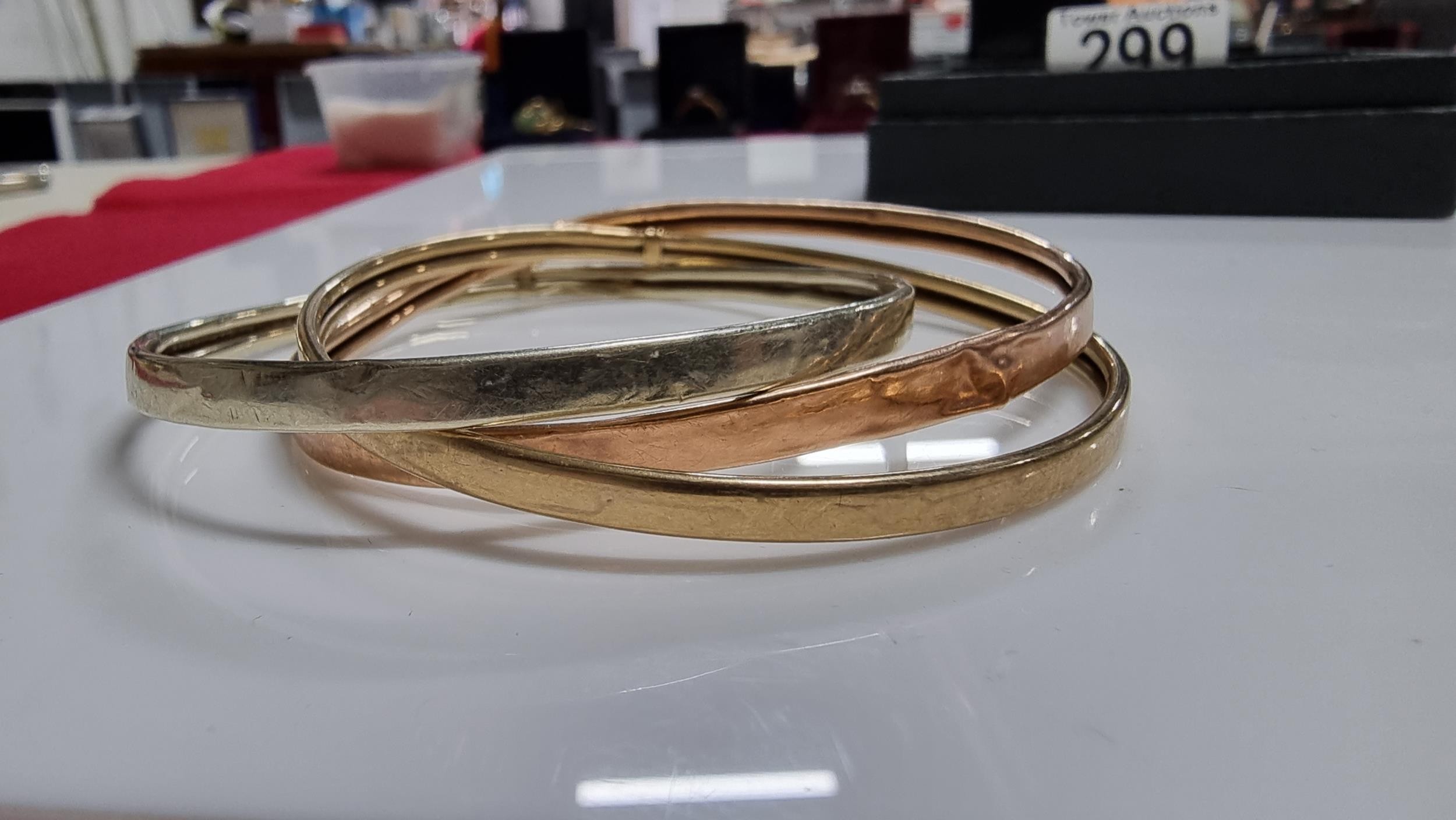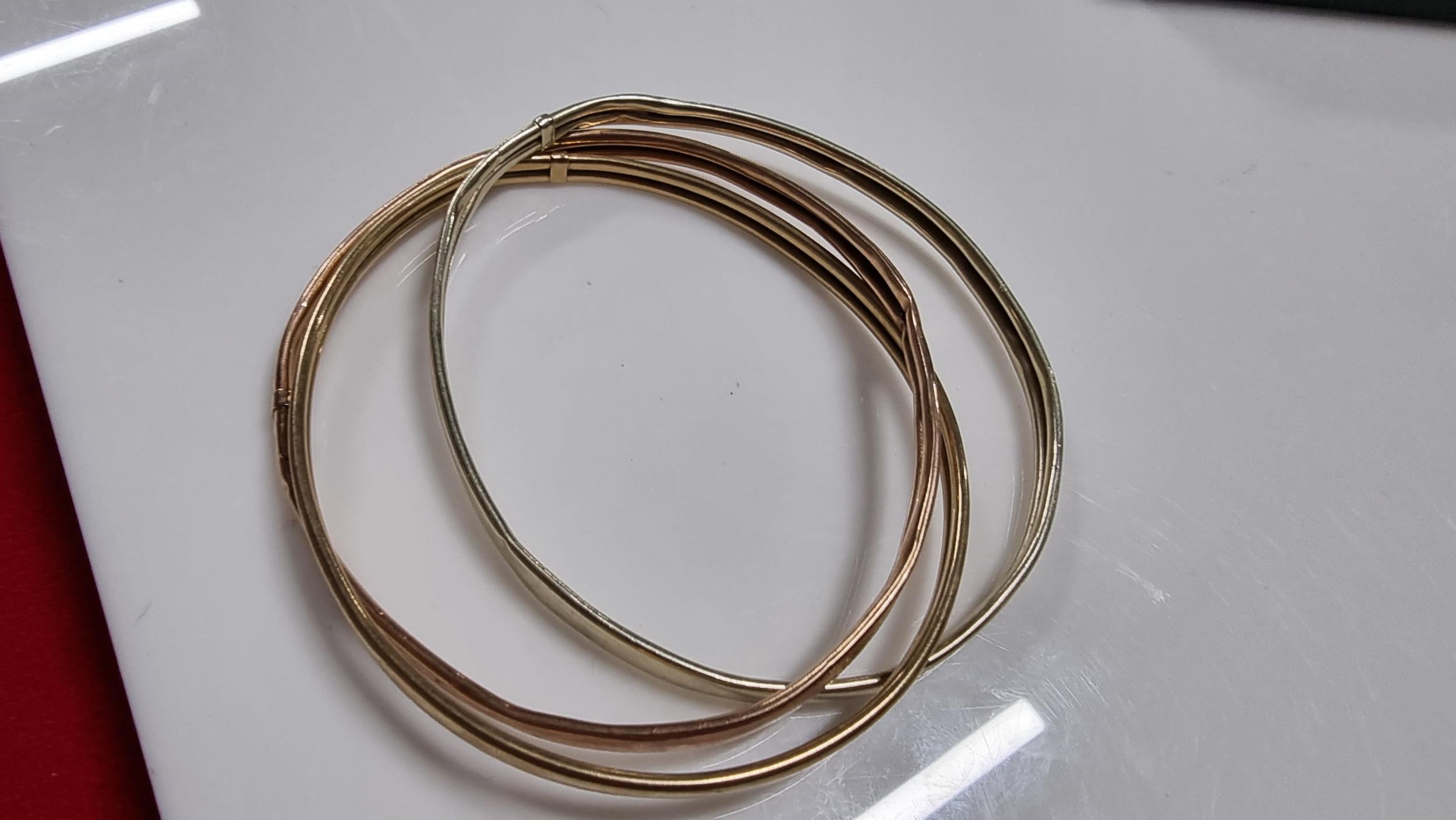 9ct. tri colour gold three piece bangle with white rose and yellow golds unmarked but tests as 9ct. Diameter of 7.5cm weight of 13.1g