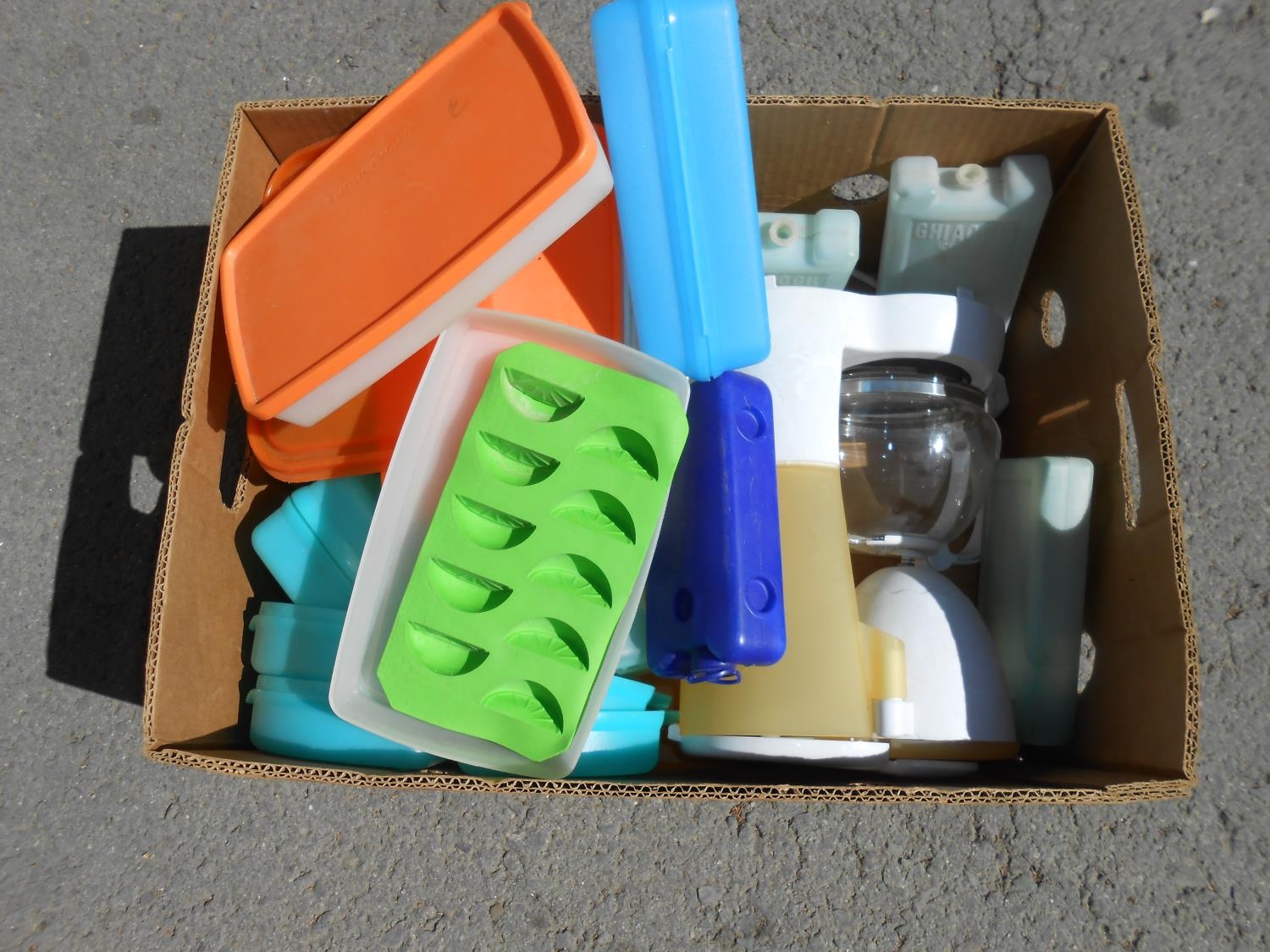 Box of Tupperware and Coffee Maker