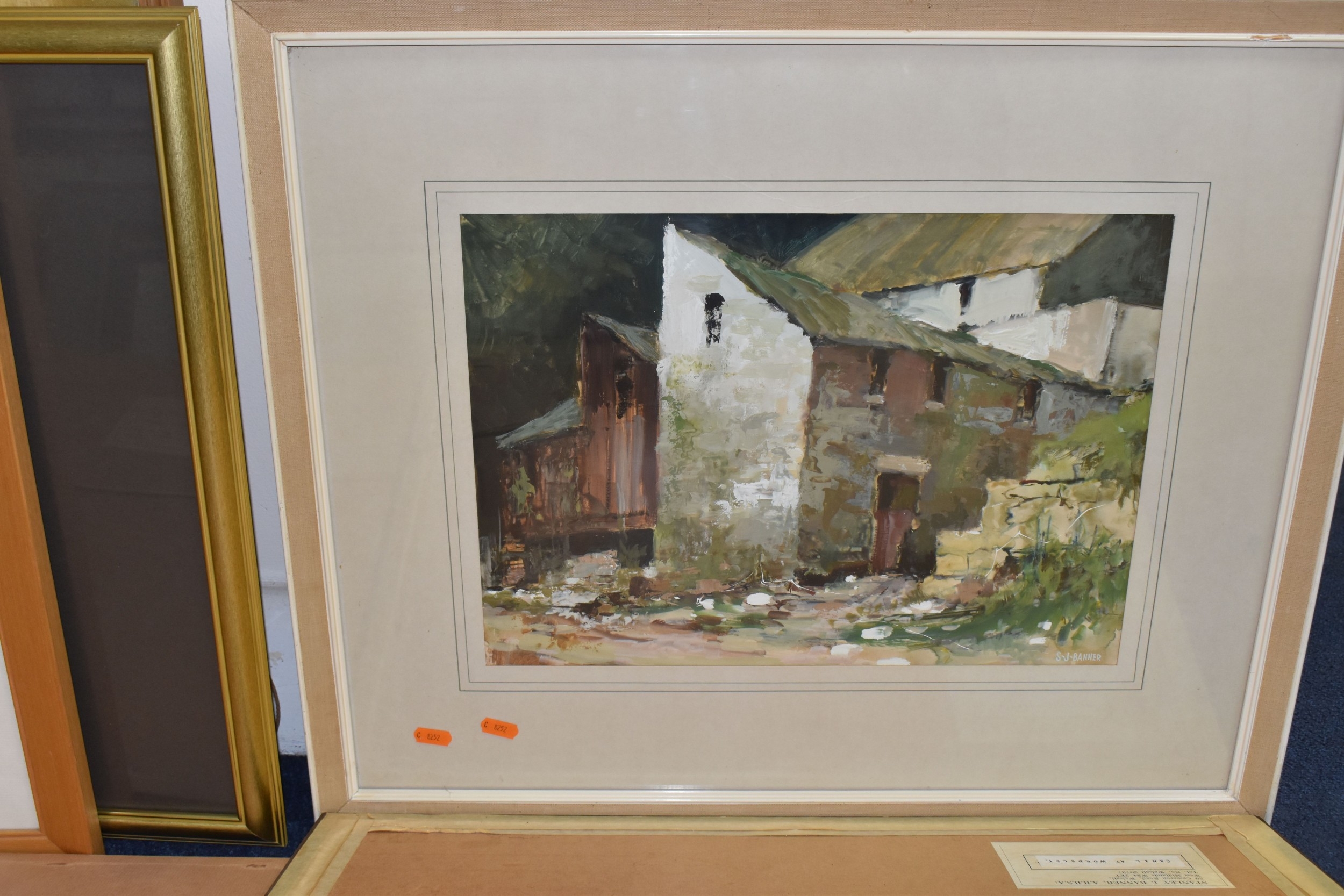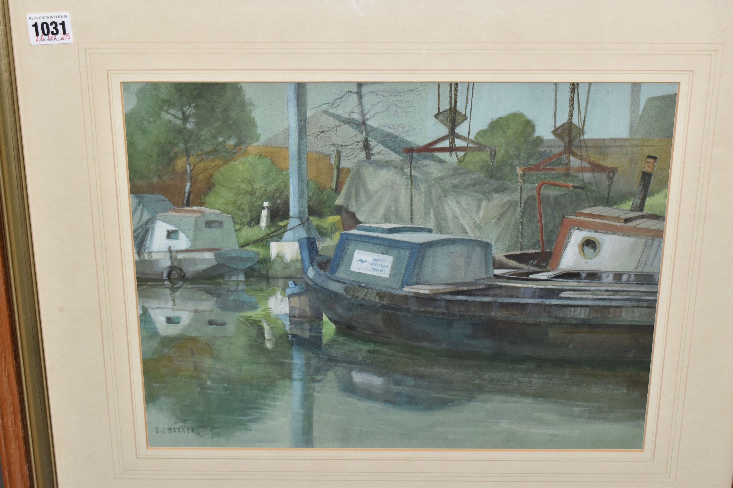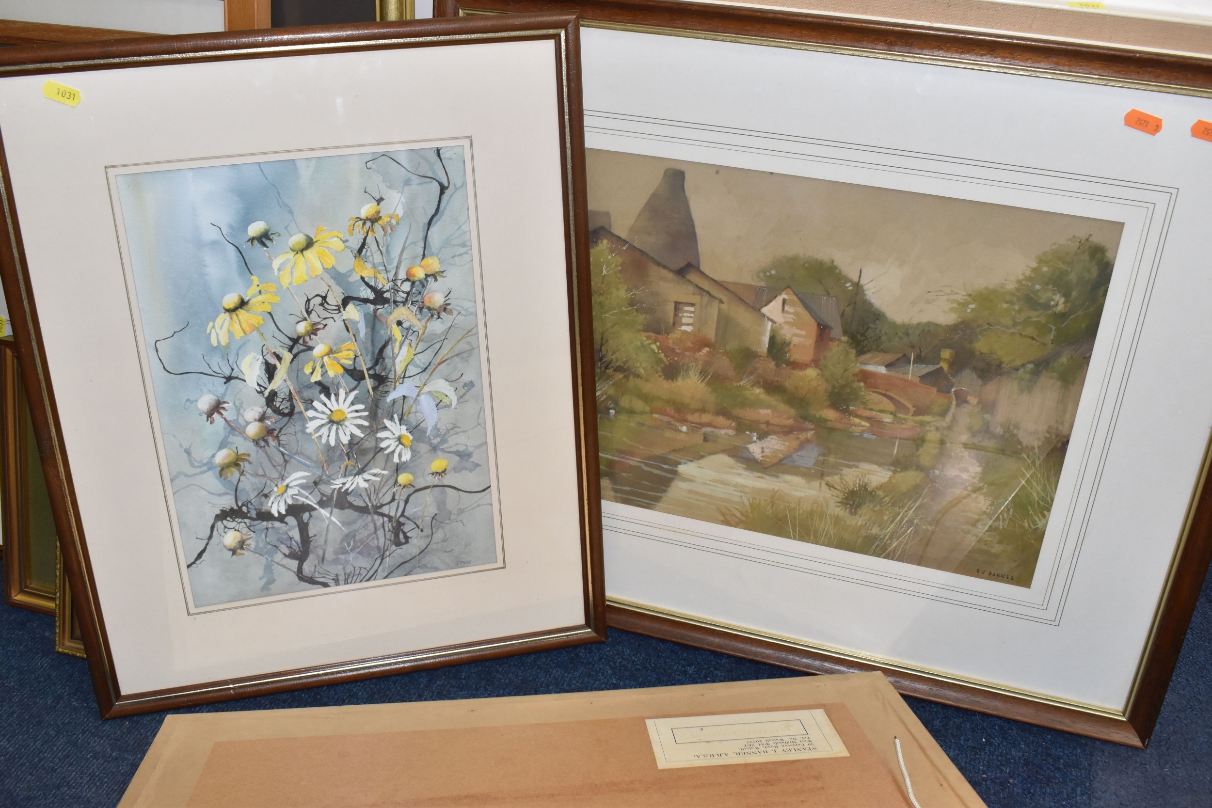 STANLEY J. BANNER (20TH CENTURY) THREE WATERCOLOUR VIEWS OF STAFFORDSHIRE, comprising Canal at Wordsley depicting an industrial canal scene with a bottle kiln to the background, 'Boatyard Birchills' depicting boats on a canal beside a boatyard, and 'Old Buildings' depicting ramshackle factory buildings, largest approximate size 30cm x 40cm, together with a watercolour of wild daisies by JacK Page, an indistinctly signed landscape with silver birch trees against a dramatic sky, an oil on canvas lake view oil on canvas signed L Crowe 1924 - would benefit from a clean, a watercolour of Pool harbour signed Renford '98, with other pictures and prints etc