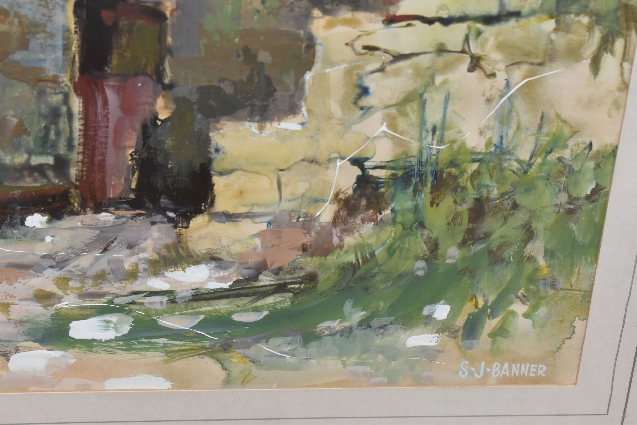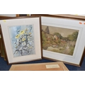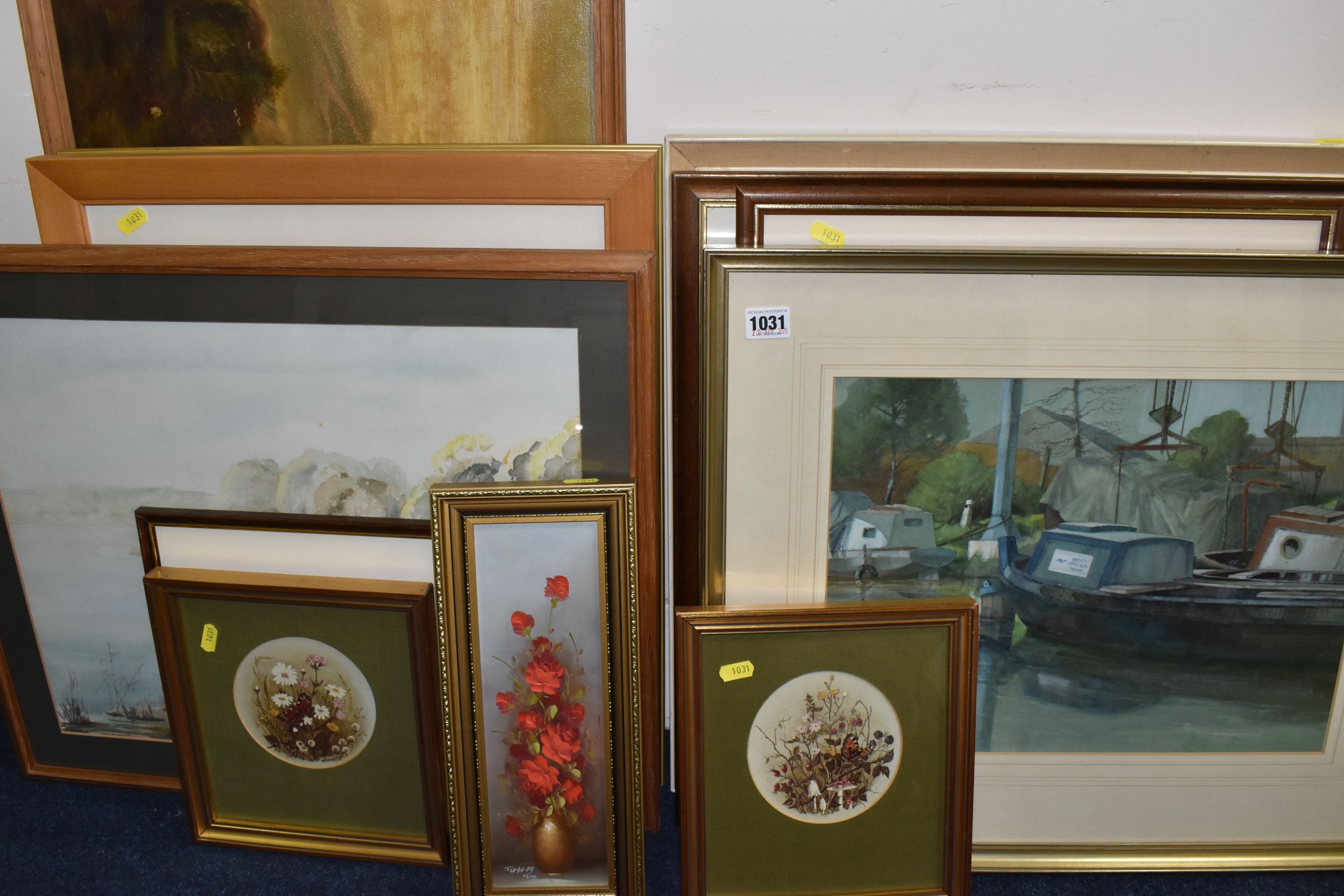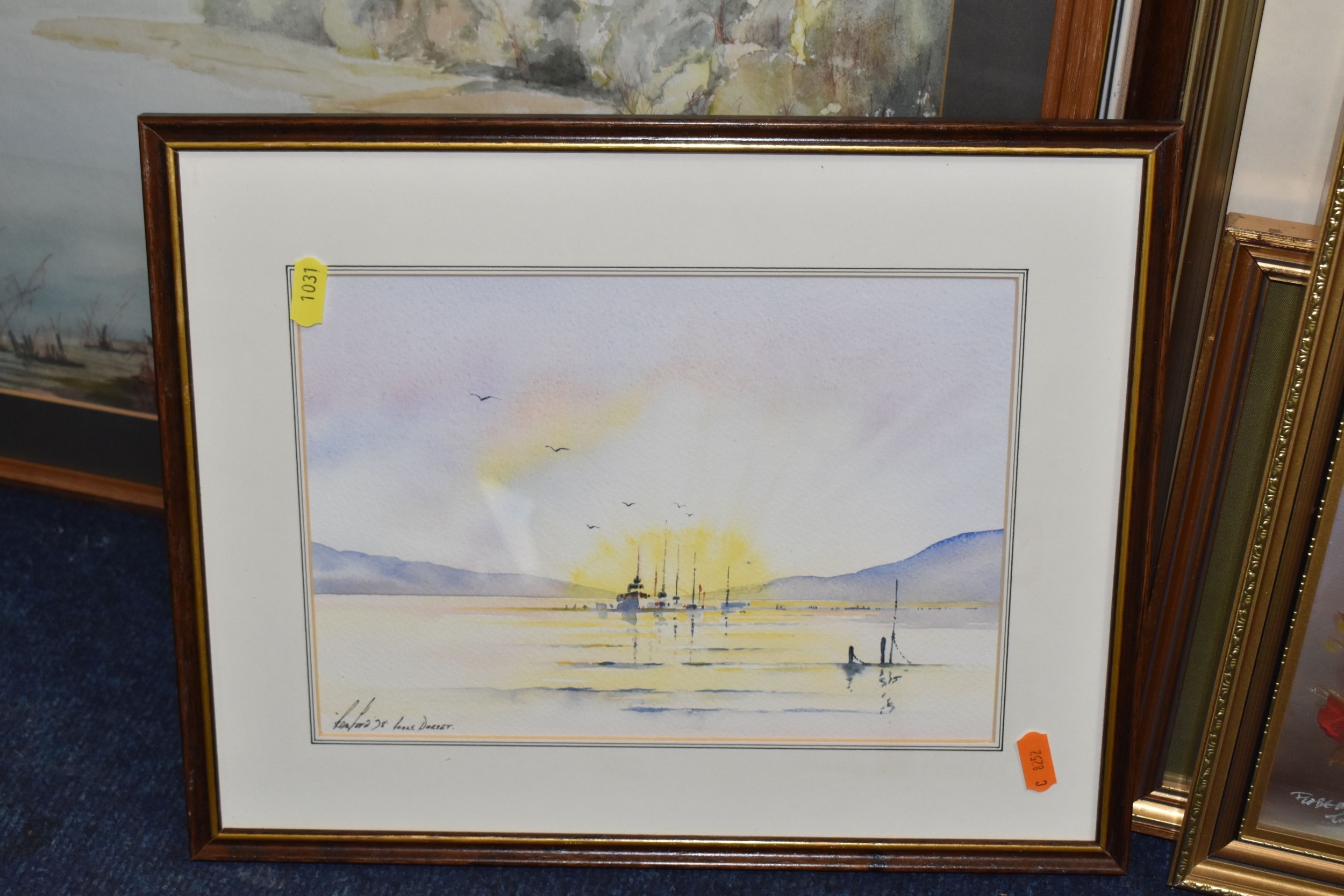 STANLEY J. BANNER (20TH CENTURY) THREE WATERCOLOUR VIEWS OF STAFFORDSHIRE, comprising Canal at Wordsley depicting an industrial canal scene with a bottle kiln to the background, 'Boatyard Birchills' depicting boats on a canal beside a boatyard, and 'Old Buildings' depicting ramshackle factory buildings, largest approximate size 30cm x 40cm, together with a watercolour of wild daisies by JacK Page, an indistinctly signed landscape with silver birch trees against a dramatic sky, an oil on canvas lake view oil on canvas signed L Crowe 1924 - would benefit from a clean, a watercolour of Pool harbour signed Renford '98, with other pictures and prints etc