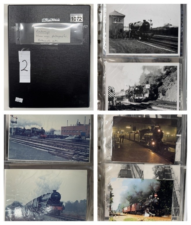 Steam Railways - Black binder containing 20+ strips of 35mm black and white negatives of steam trains and related subjects. Also, many old black and white, and colour railway related photographs and postcards. Subjects include steam engines, carriages, trackside signals and signal boxes.
