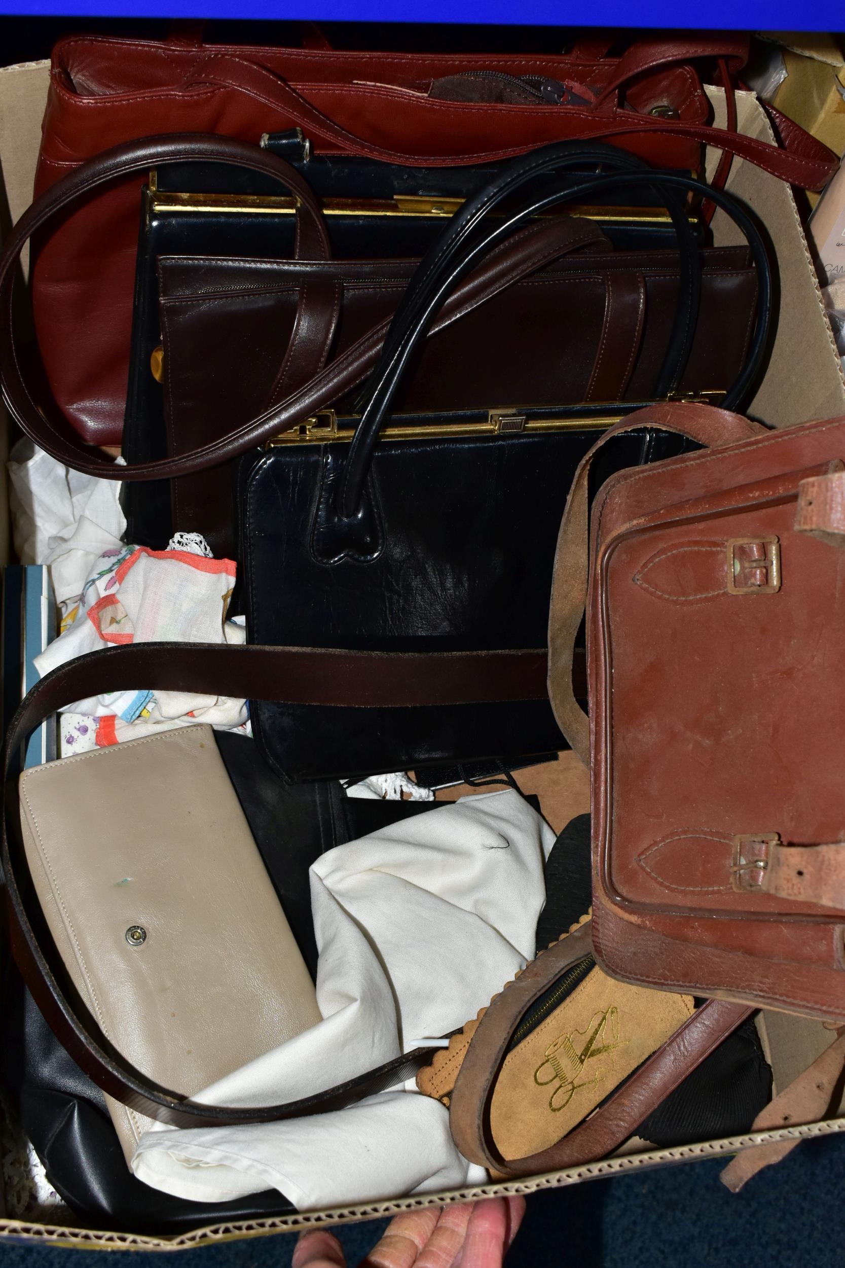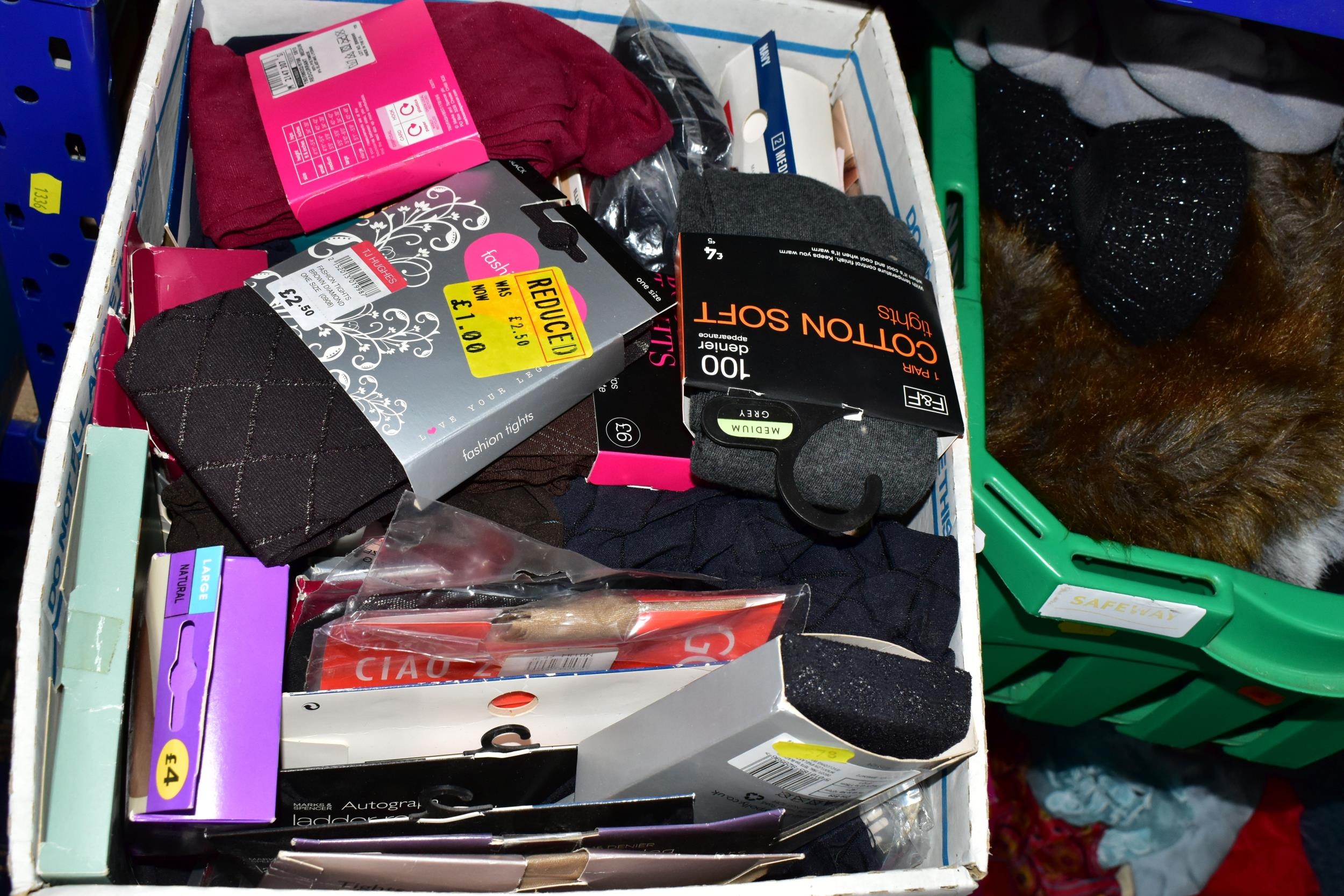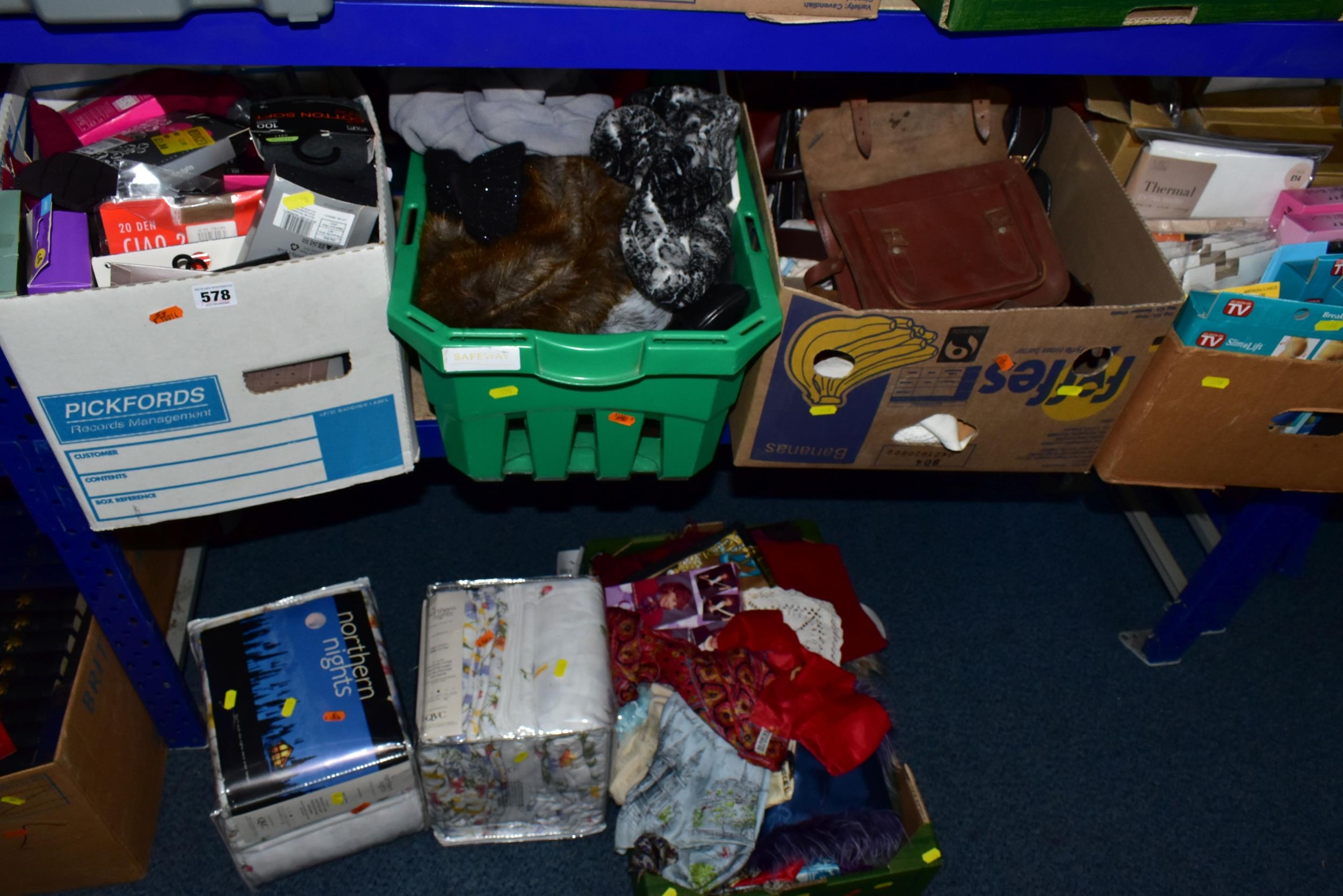 FIVE BOXES OF LADIES ACCESSORIES, to include vintage handbags, hats, gloves, a quantity of new and unused packets of tights, brown leather school satchel, a quantity of unused woollen tights and socks, two new and unused Northern lights flannel king sized duvet sets, etc. (5 boxes + loose)