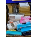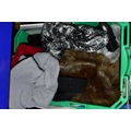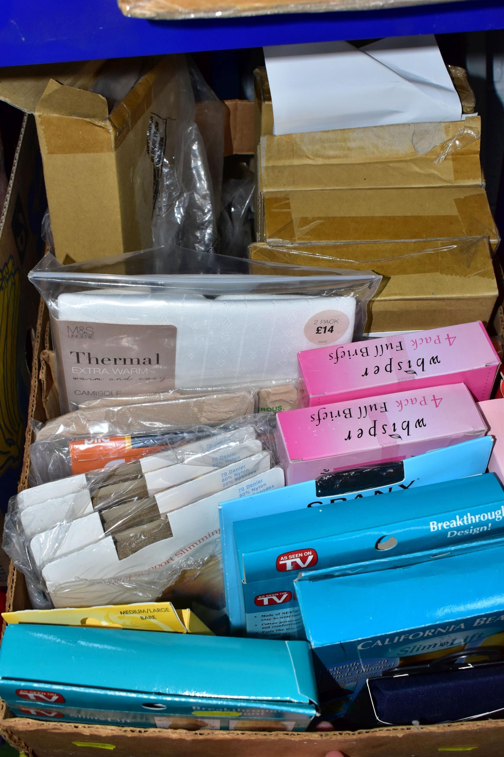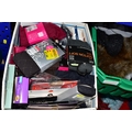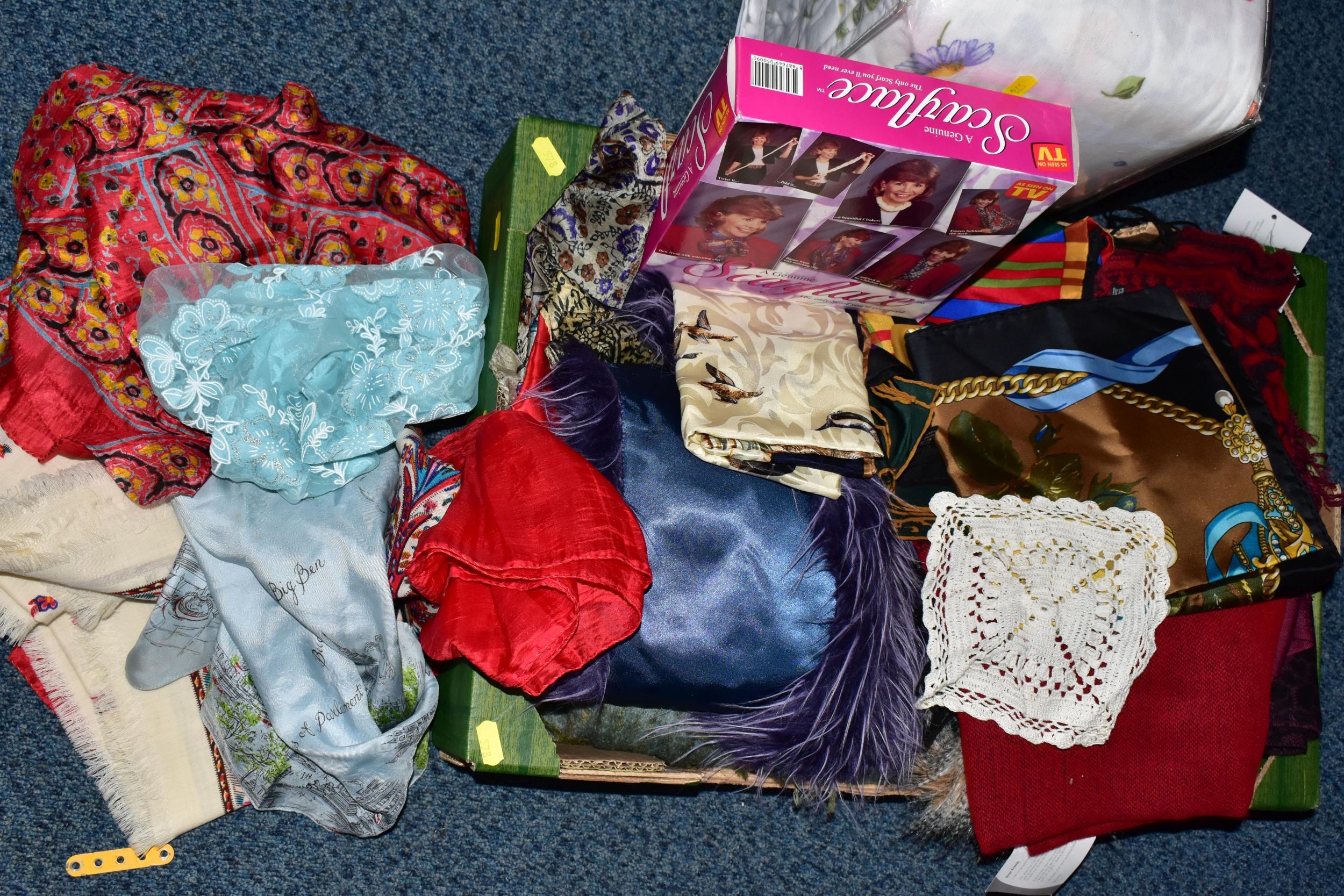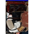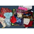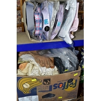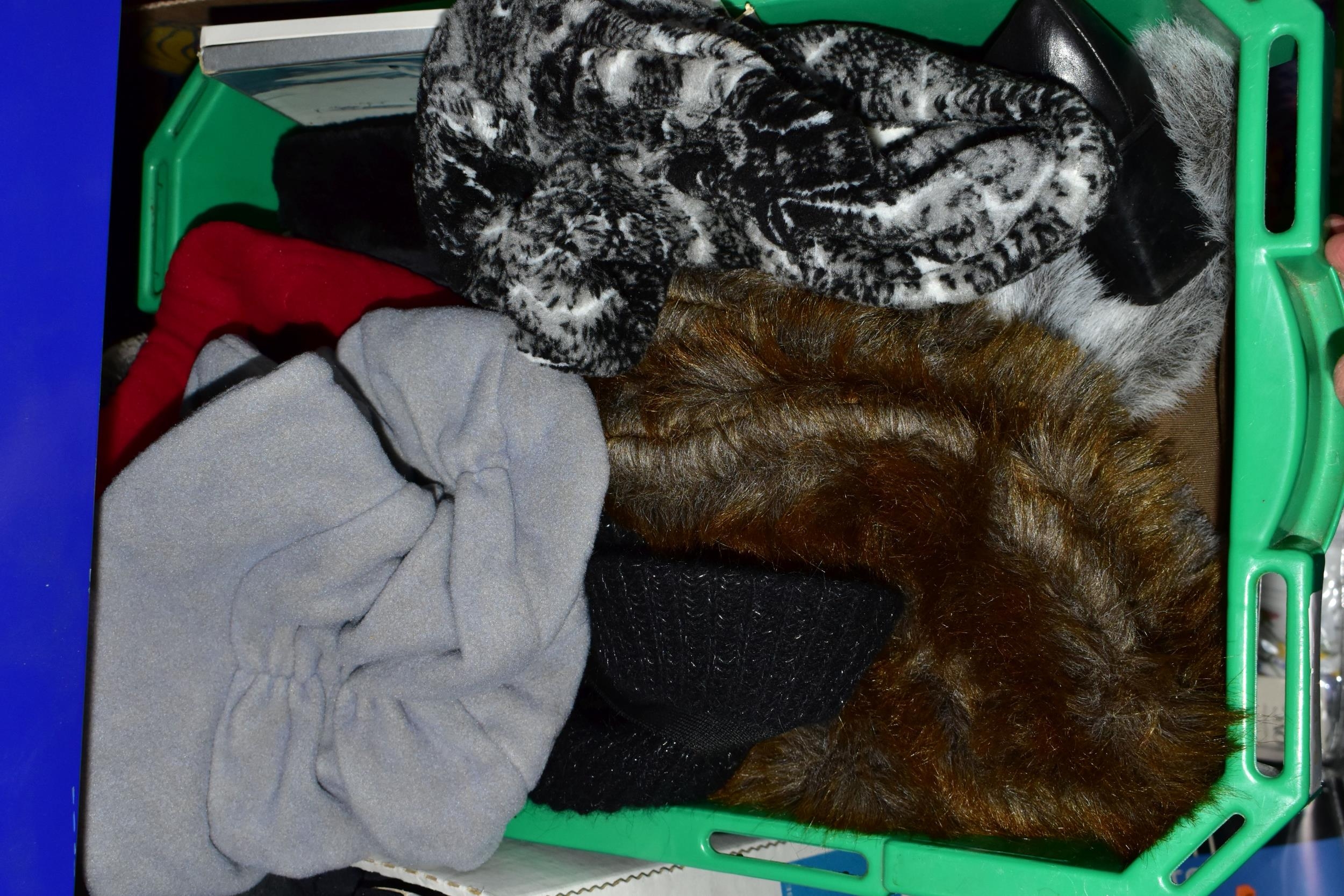 FIVE BOXES OF LADIES ACCESSORIES, to include vintage handbags, hats, gloves, a quantity of new and unused packets of tights, brown leather school satchel, a quantity of unused woollen tights and socks, two new and unused Northern lights flannel king sized duvet sets, etc. (5 boxes + loose)