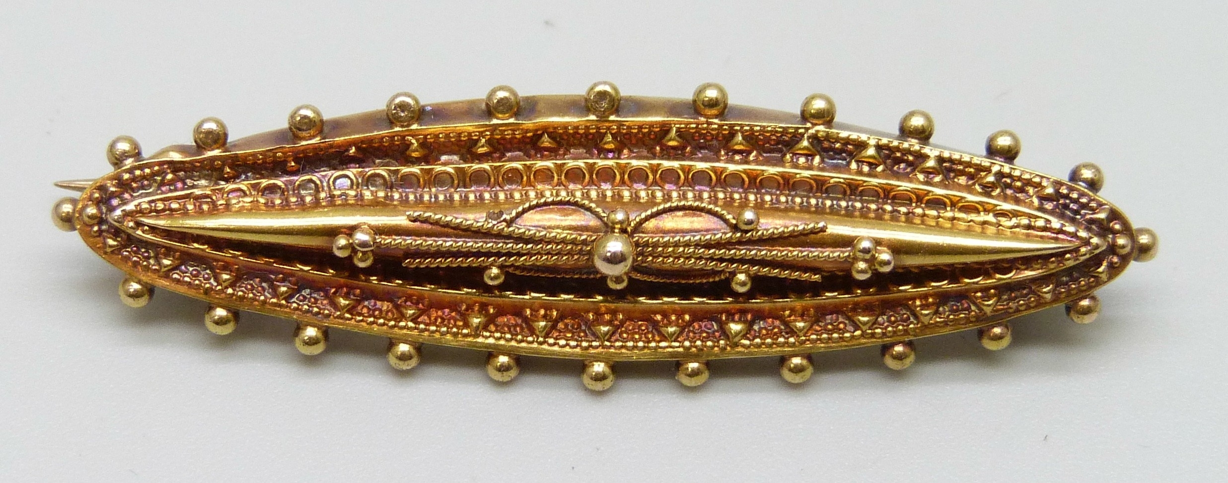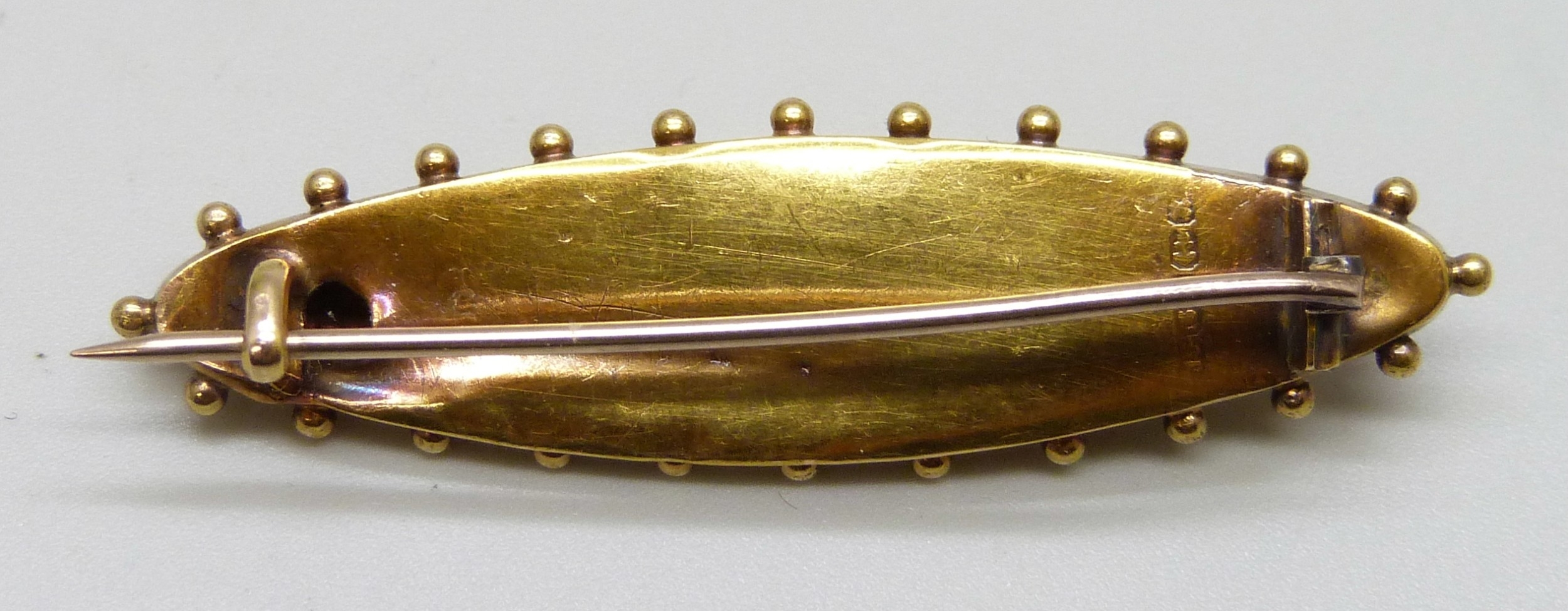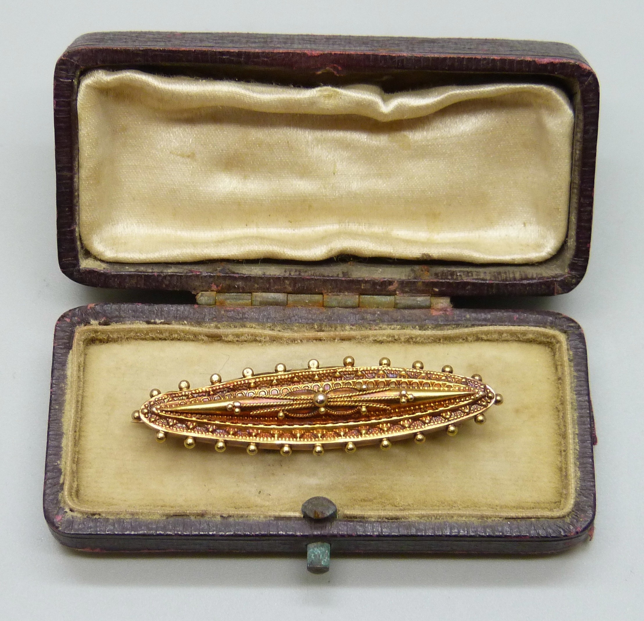 A Victorian 15ct gold bar brooch, Birmingham, 1897, 3.2g, 4.7cm, boxed