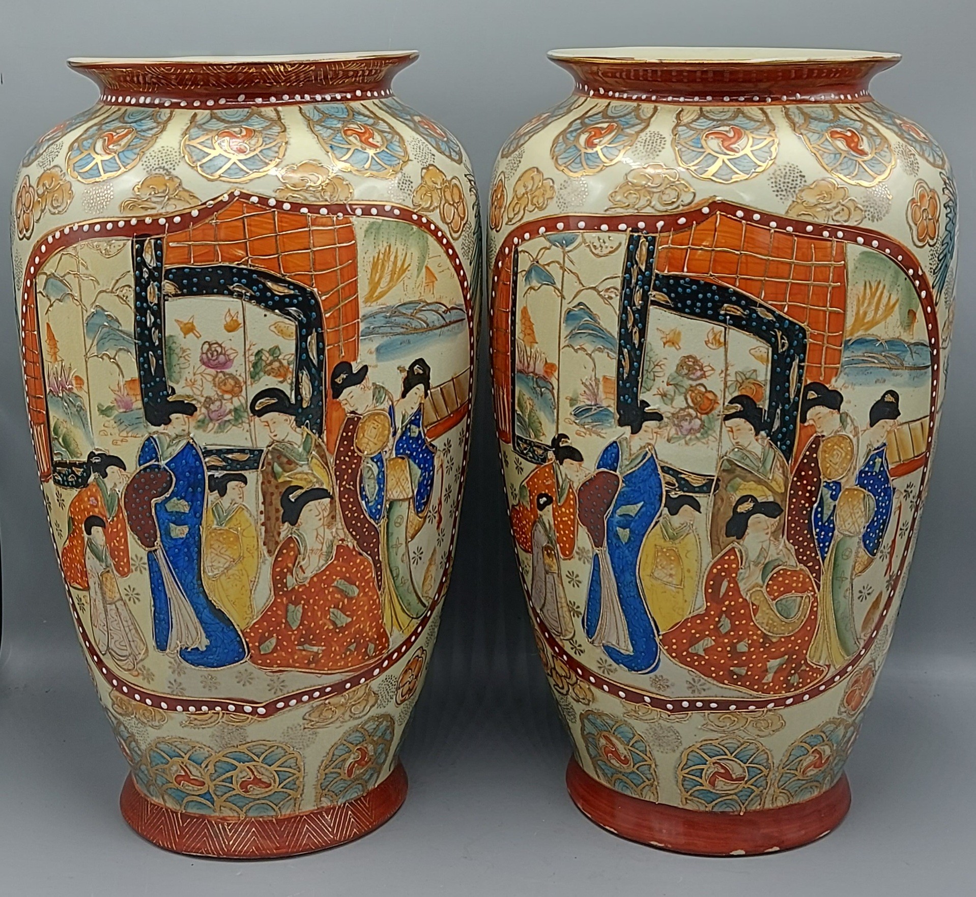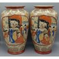 A pair of Satsuma vases decorated in polychrome enamels, 34cms tall