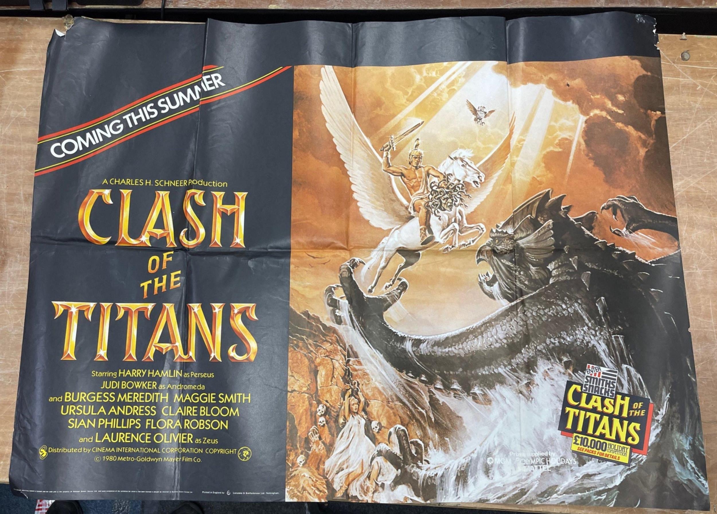 CLASH OF THE TITANS giant wall poster starring Harry Hamlin - 1980 Metro Goldwyn Mayer with Laurence OLIVIER - top two edges torn but this does in way detract from this FABULOUS DECORATIVE ITEM! - 30" x 40" approx