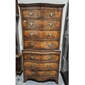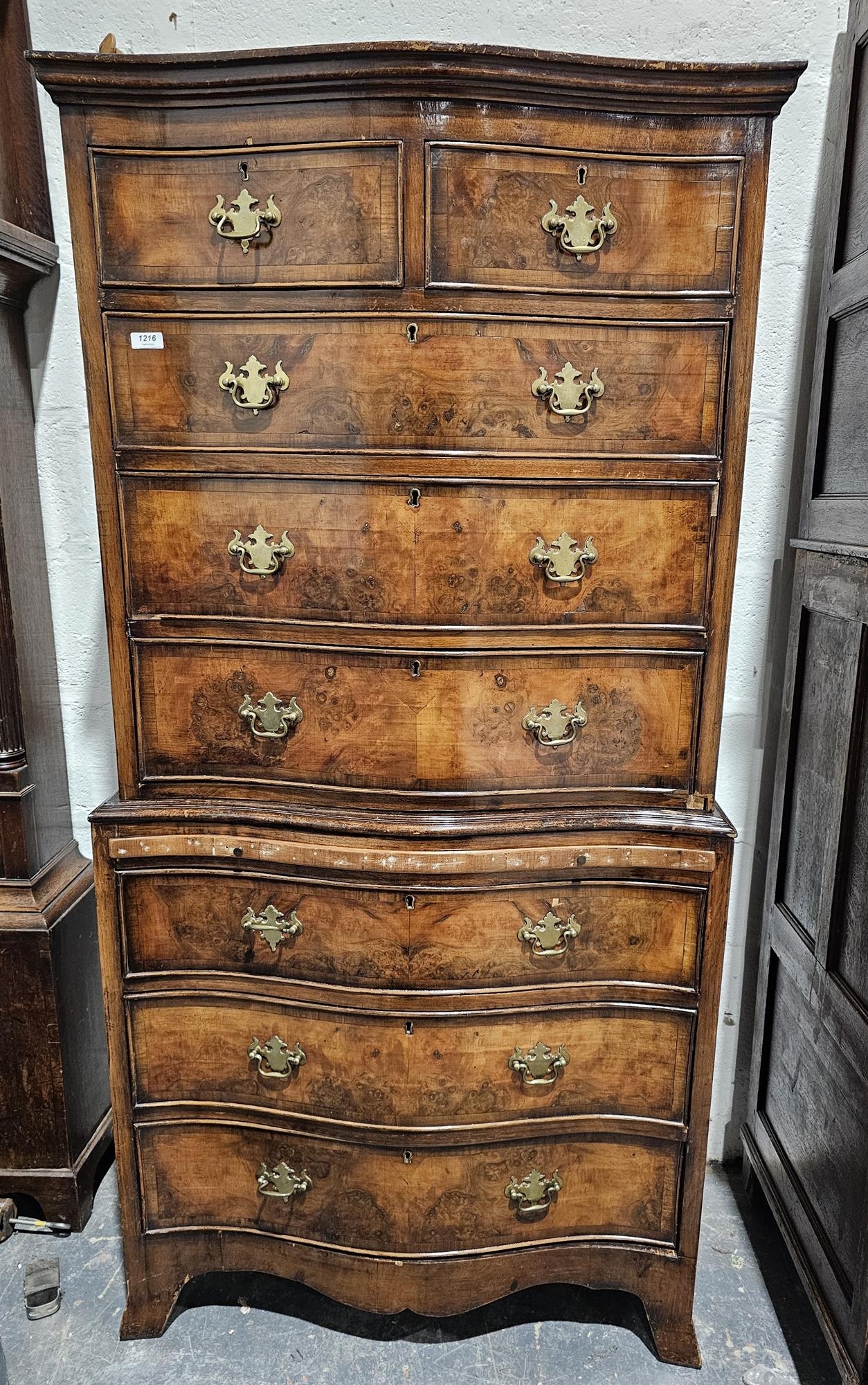 Georgian-style walnut serpentine tallboy, the chest-on-chest with two short drawers above three long graduating drawers and a brushing slide, above three long graduating drawers, with brass swing handles, on splayed feet, 167.5cm high x 82cm wide x 42cm deep