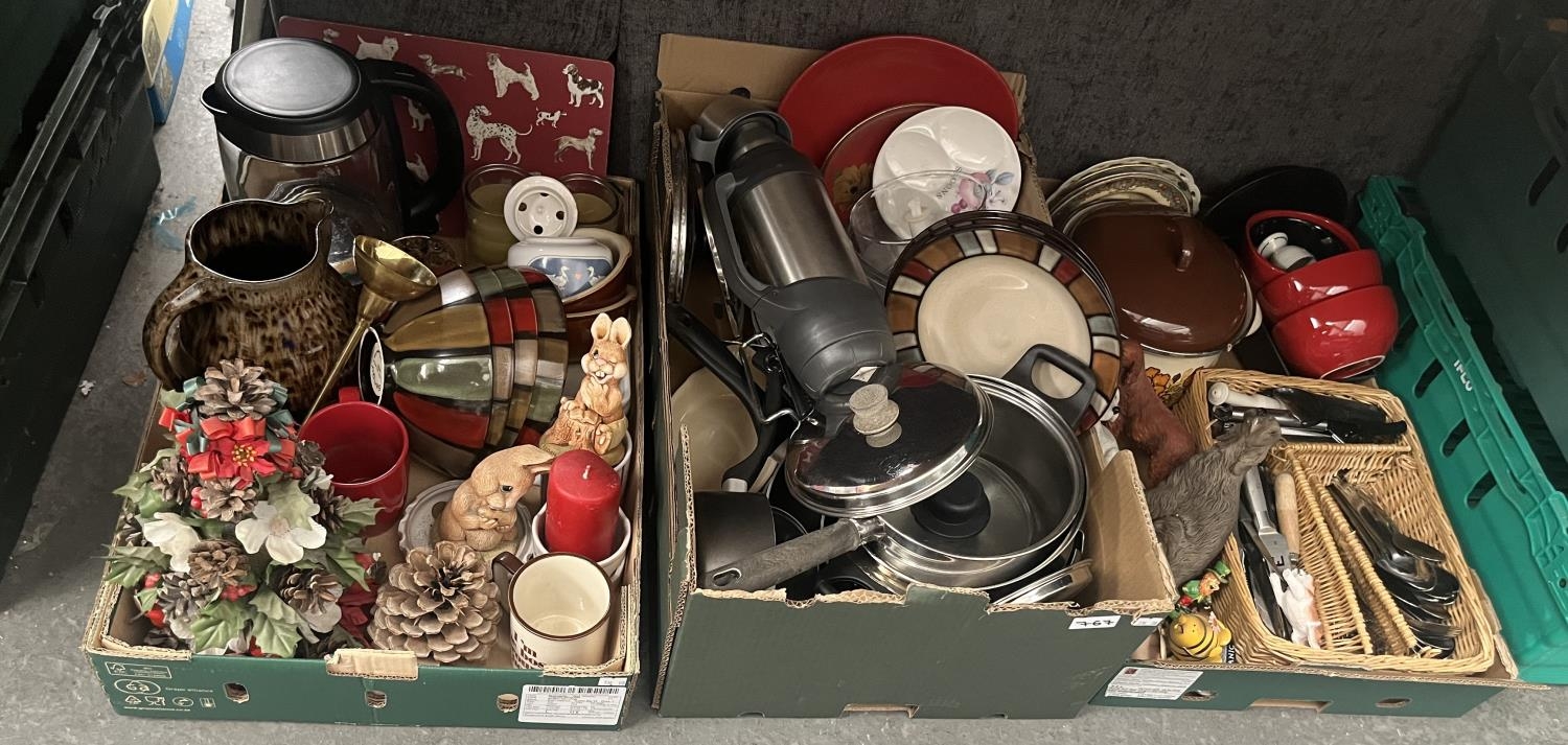 3 Boxes containing a quantity of home decor and kitchenalia including pans, cutlery etc