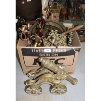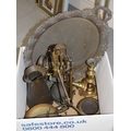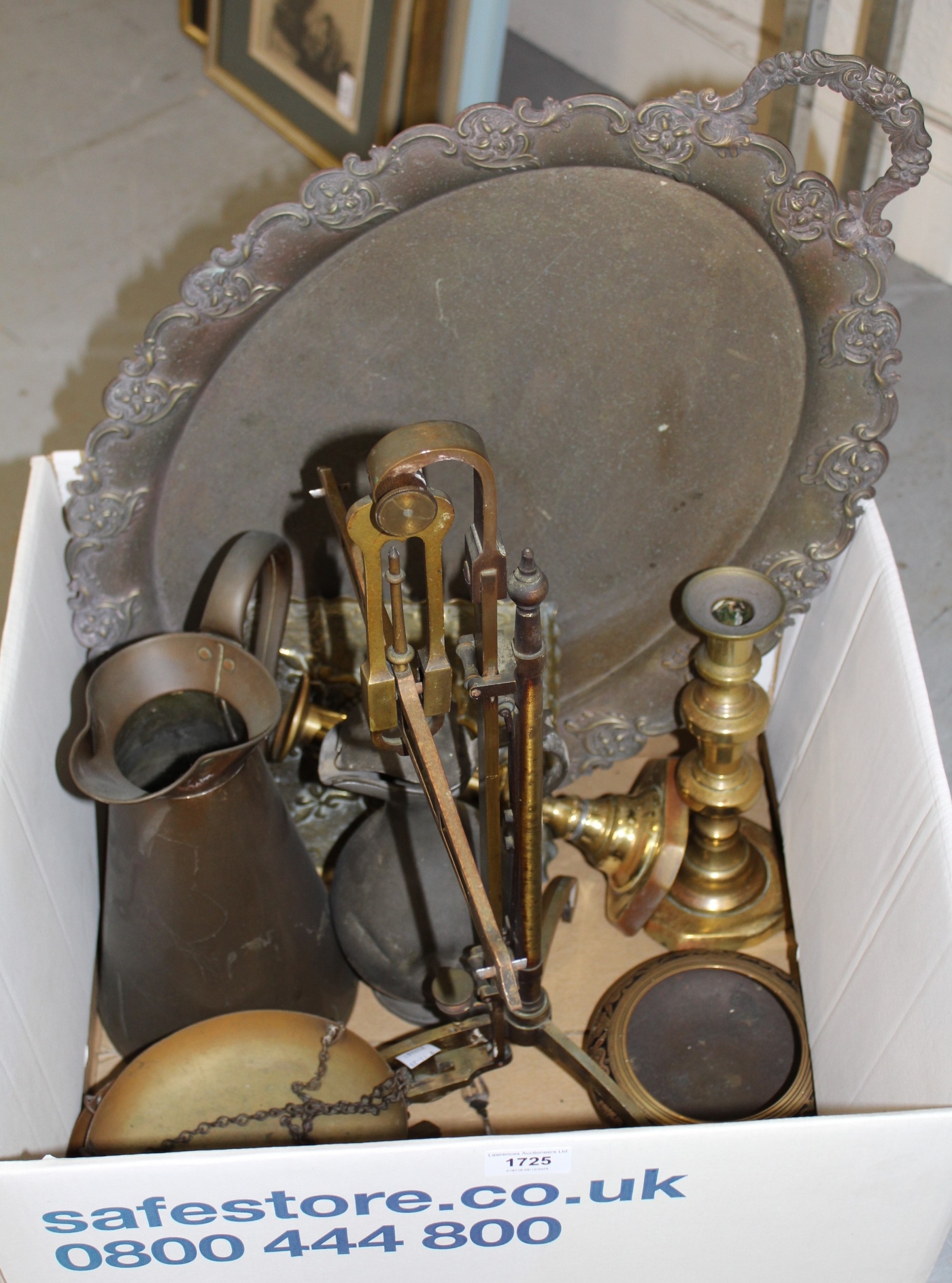 Pair of brass balance scales, pair of brass candle sticks and other miscellaneous metalware