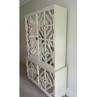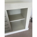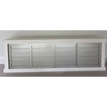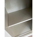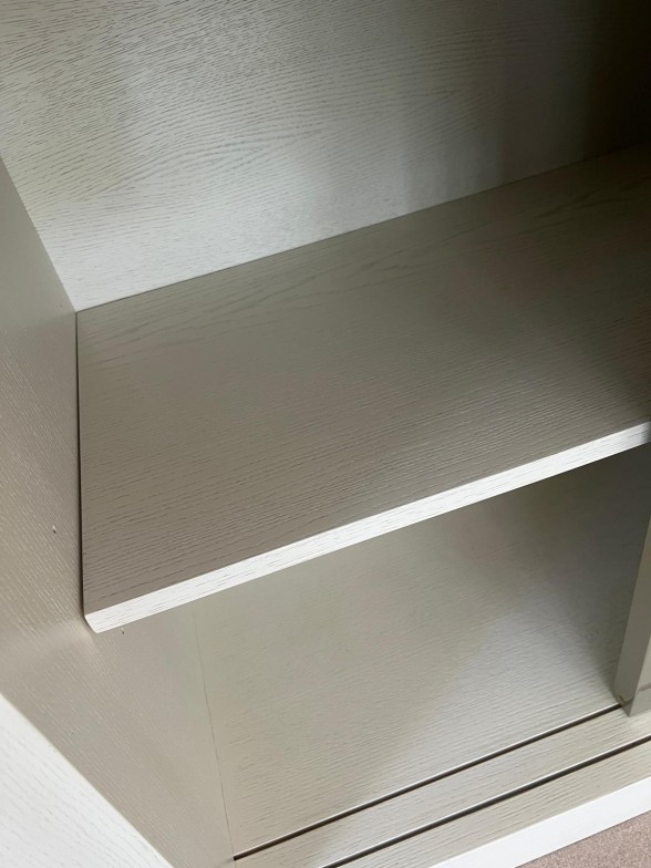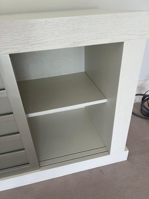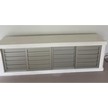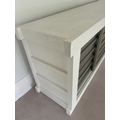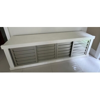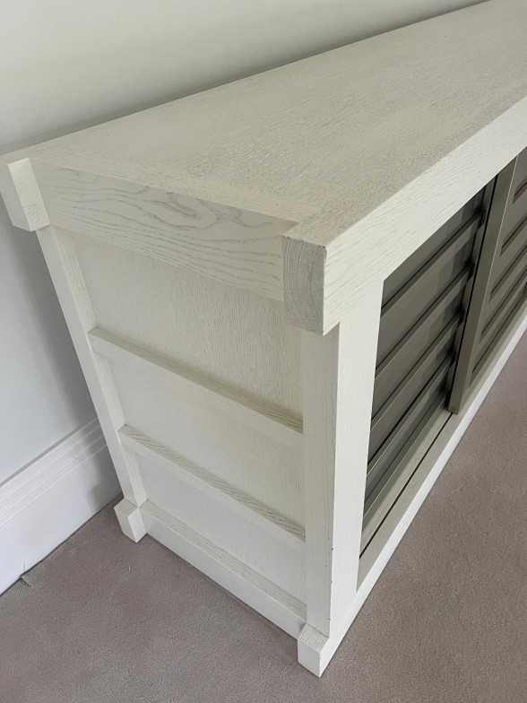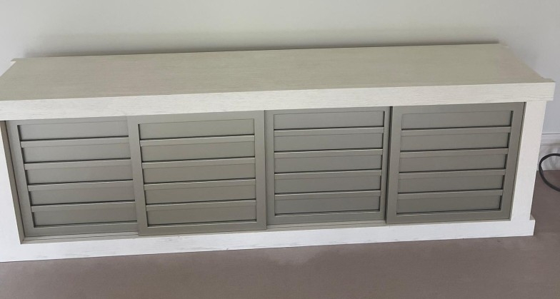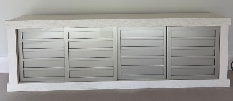 Contemporary low profile unit with slatted grey sliding doors H80cm W250cm D50cm