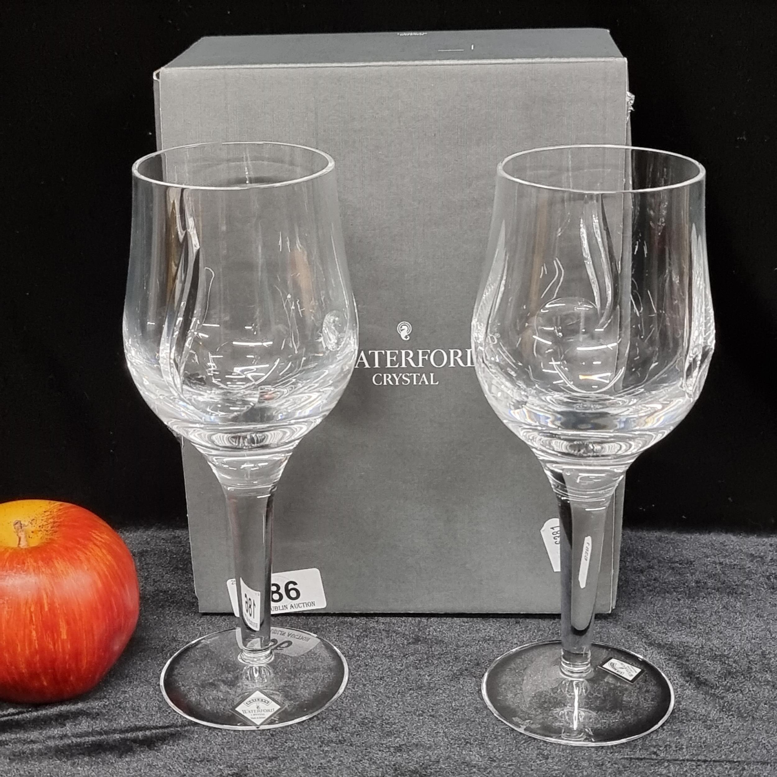 A pair of stemmed glasses by Bailey's for Waterford Crystal. With an unusual abstract, quaver design. Both in perfect condition and brand new in box.