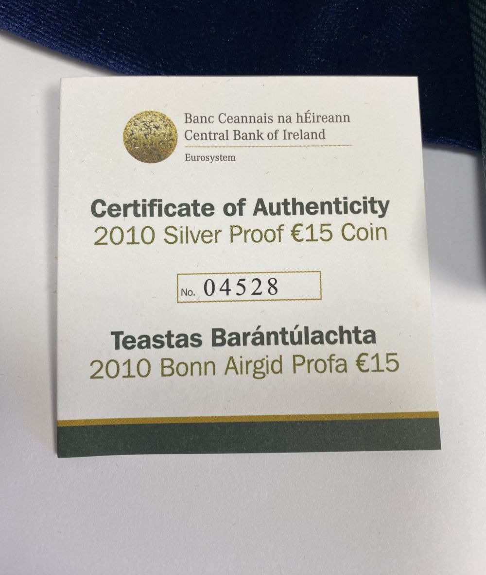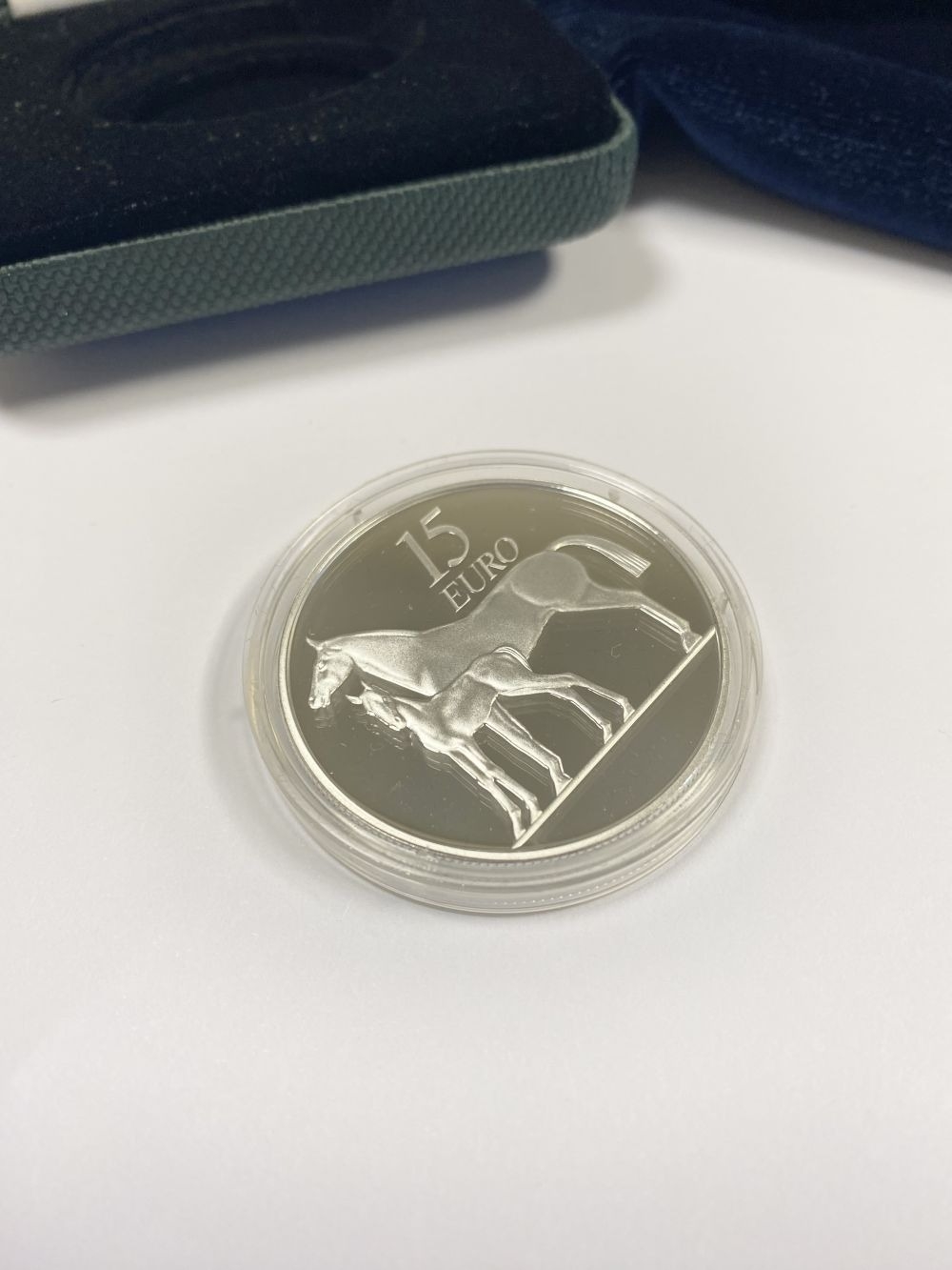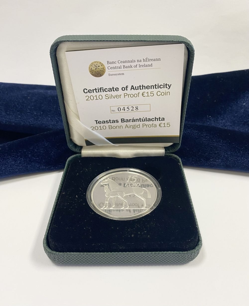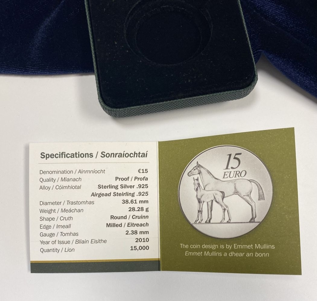 A CENTRAL BANK OF IRELAND SERIES MARE AND FOAL LIMITED-EDITION SILVER PROOF FIFTEEN EURO COIN – 2010, designed by Emmet Mullins and issued by the Central Bank of Ireland in 2010. Sterling silver .925 coin weight 28.28 grams. Limited edition 04528/15000. In original case.