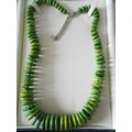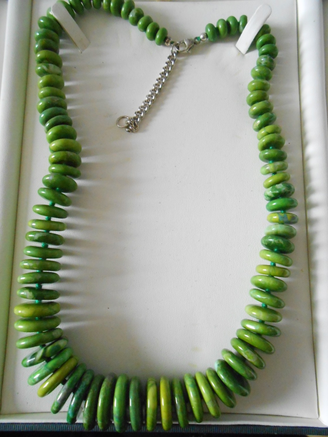 A heavy green hardstone necklace of graduated circular disc form, in fitted box