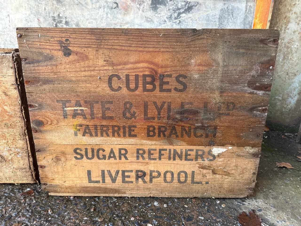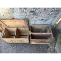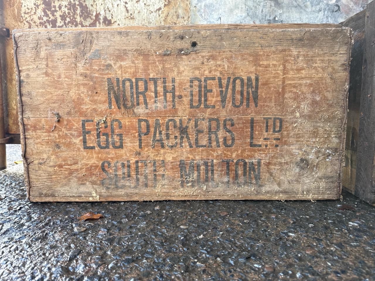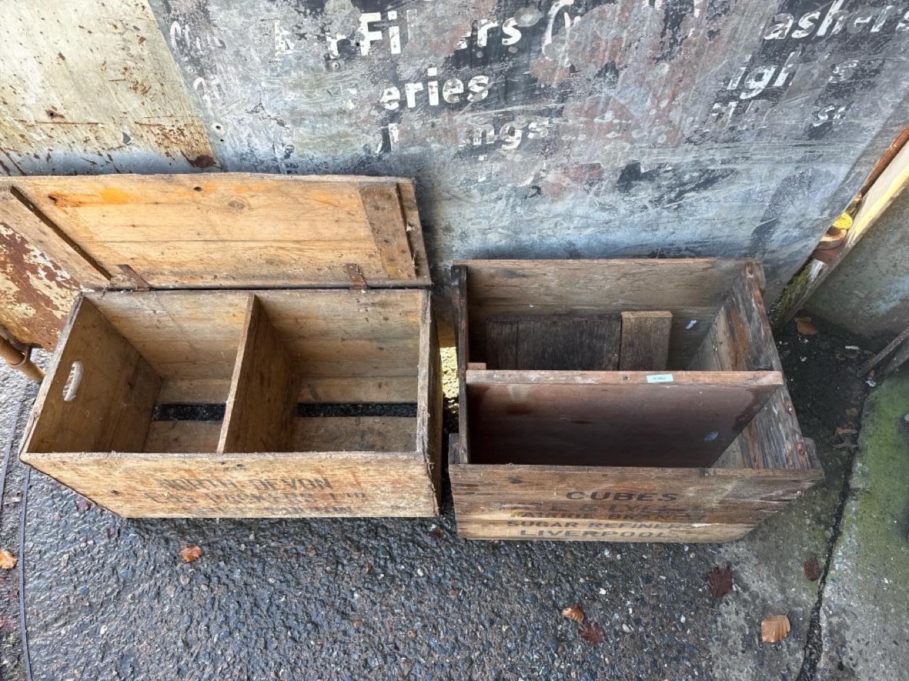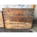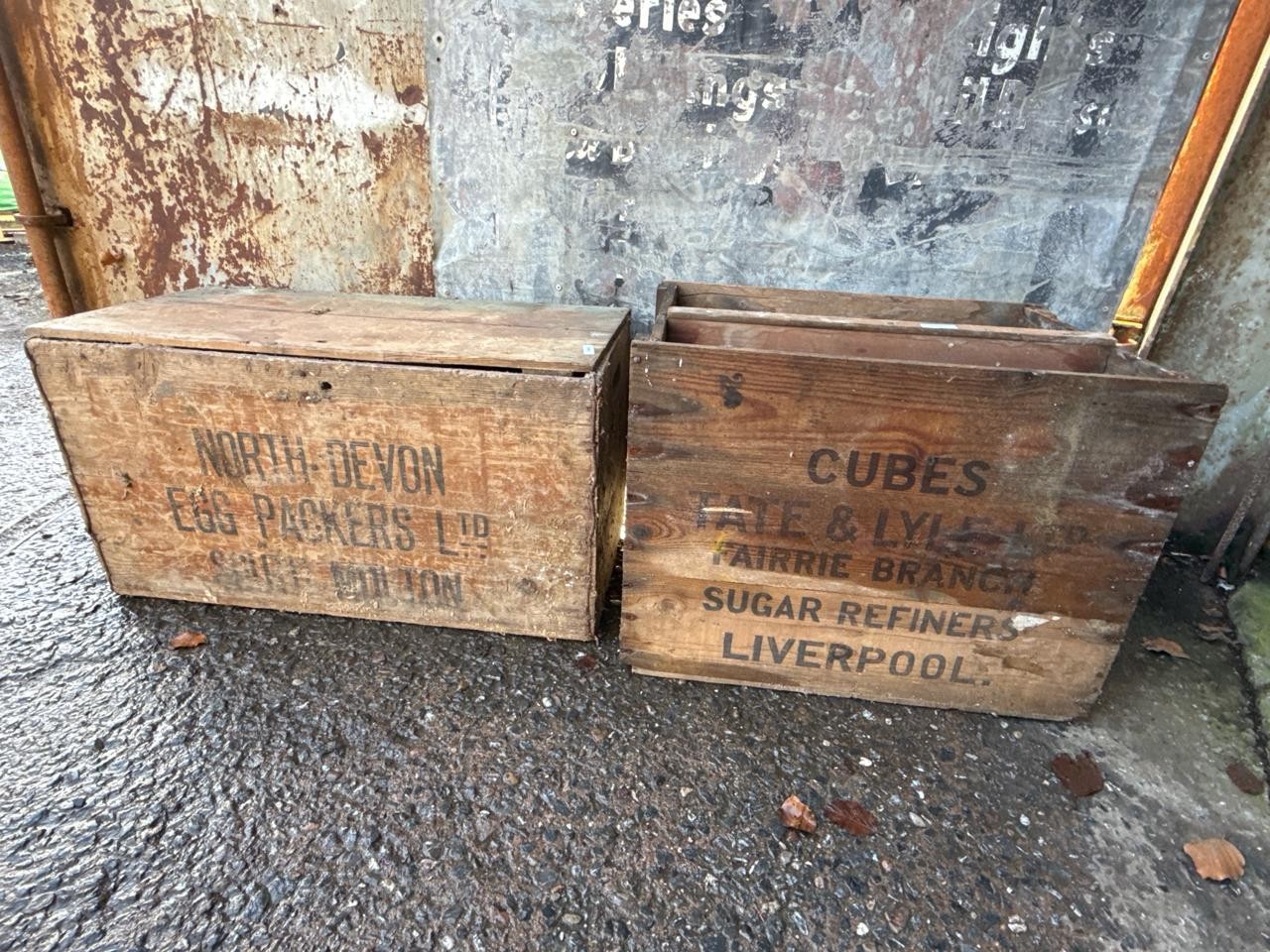 Two large vintage wooden packing crates. North Devon approx H38cm x W68cm x D34cm and Liverpool approx H52cm x W56cm x D41cm.