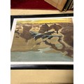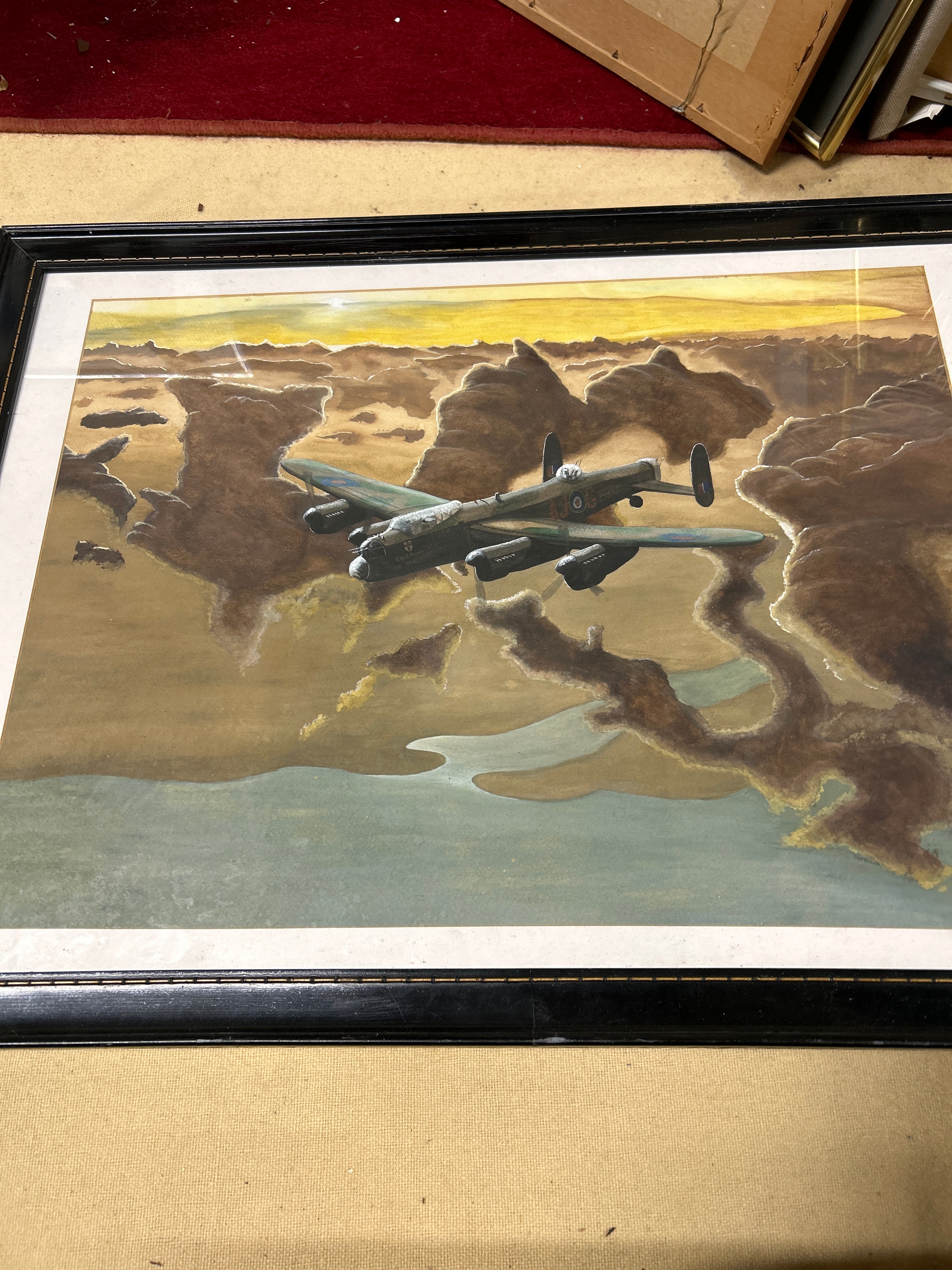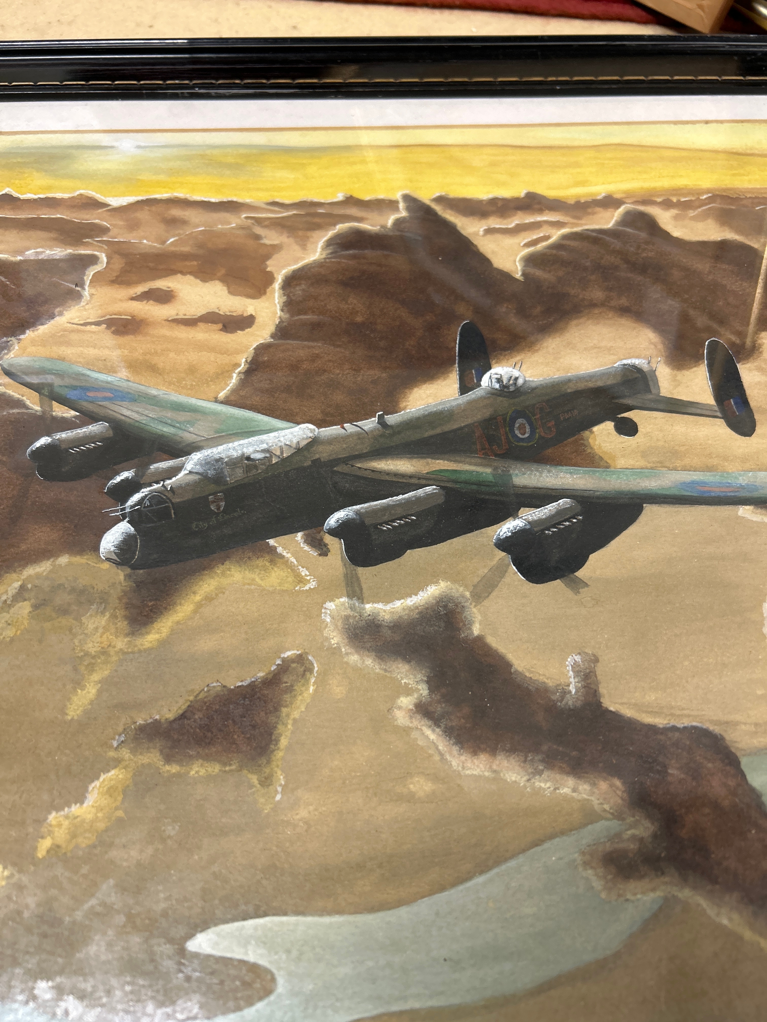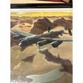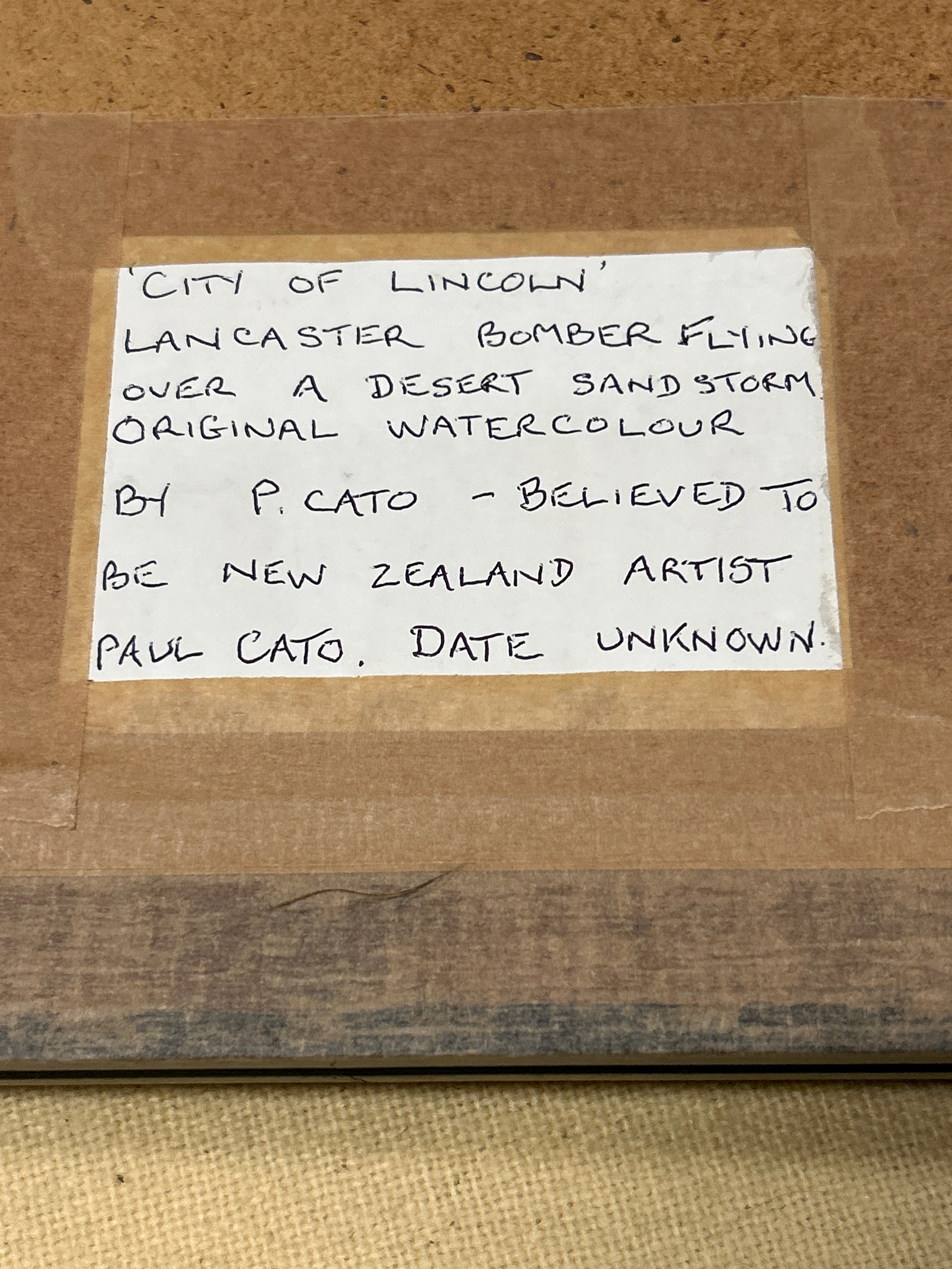 Paul Cato, New Zealand Artist, 20th Century, original watercolour “City of Lincoln” Lancaster Bomber flying over a desert sandstorm. Image 66cm x 44cm