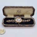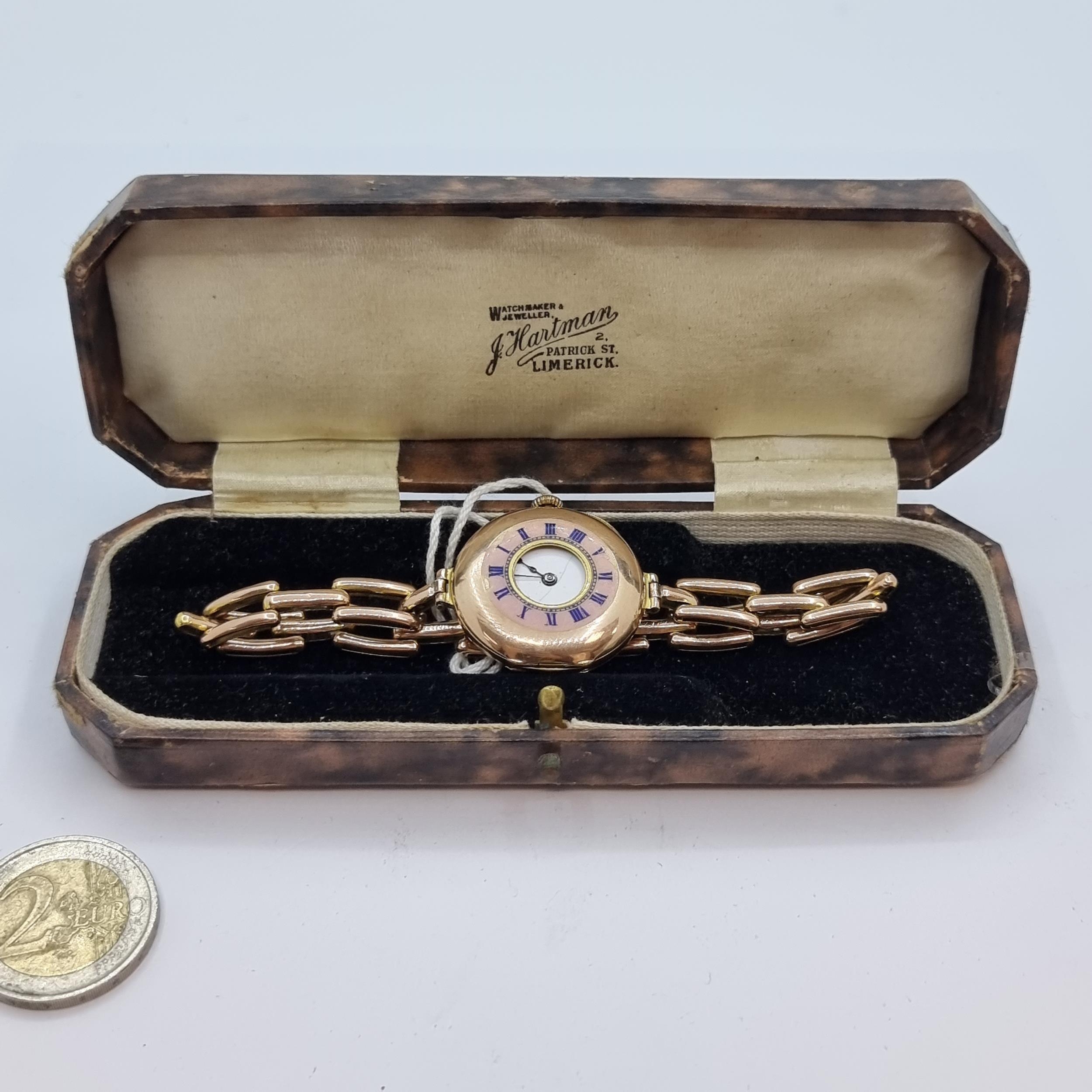 A vintage 9K gold half-hunter enamel watch and strap . With inscription to reverse 'Happy Birthday Mother, with love from all. 15/5/46.' Total weight 25.6g. Comes in presentation case.