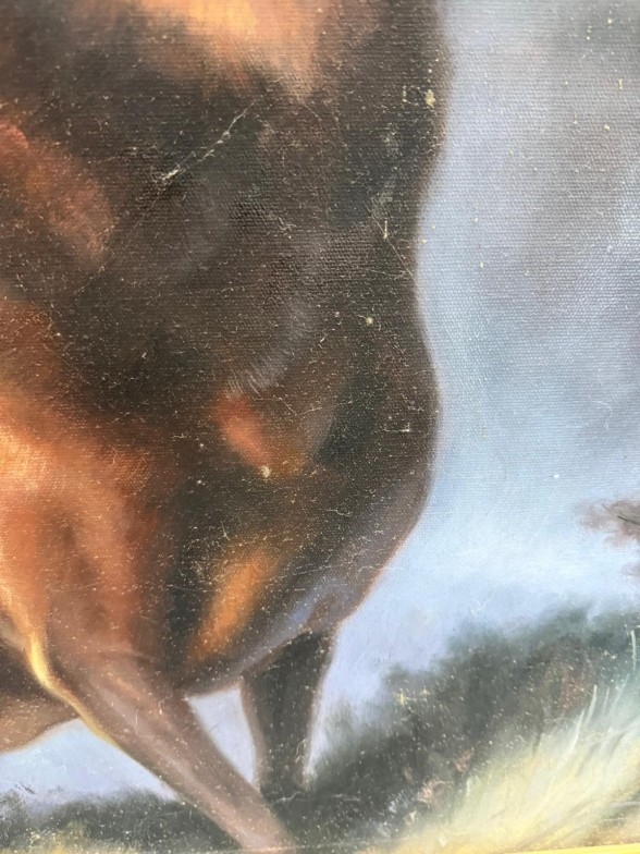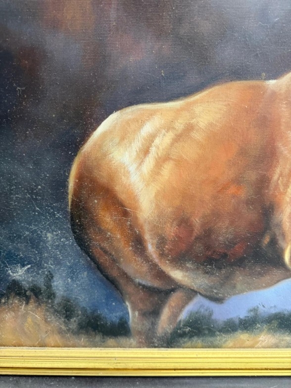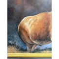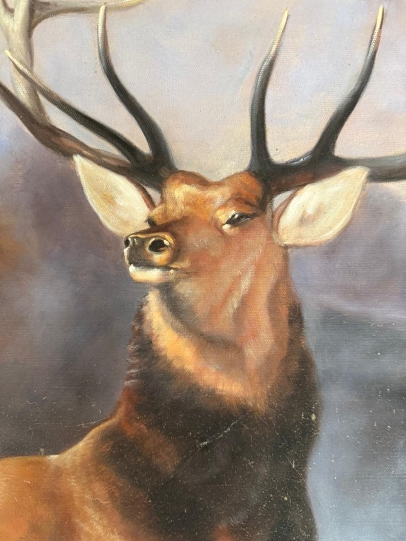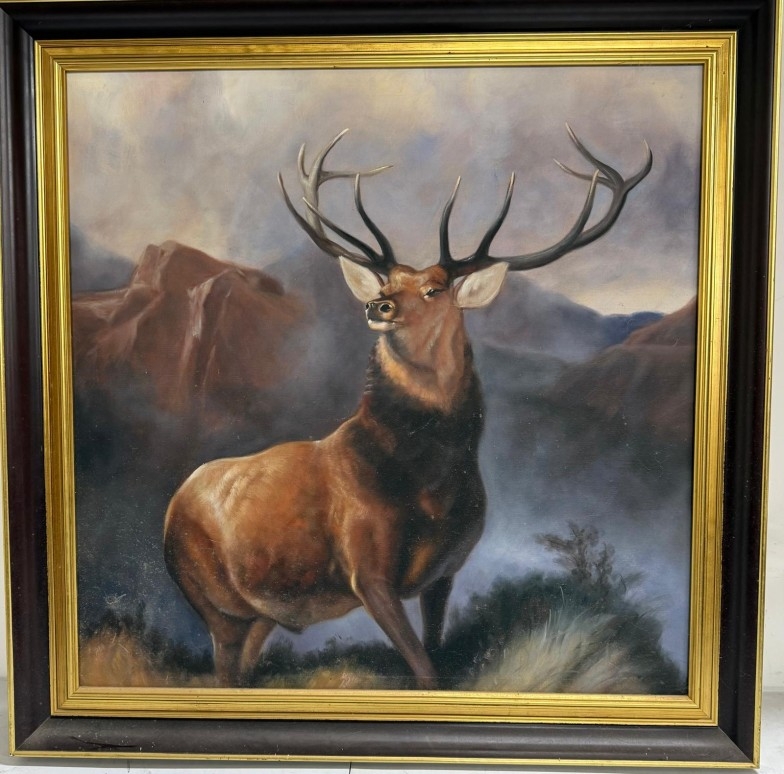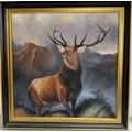 A printed impressive contemporary picture of a stag, black ebonised frame. 94cm sq.